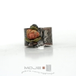 Szeroka obrączka z wytrawionym ozdobnym motywem roślinnym, ozdobiona kamyczkami unakitu. Surowy wygląd obrączki nadaje całości specyficzny, nieco rustykalny charakter.