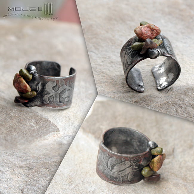Szeroka obrączka ozdobiona kamyczkami unakitu.