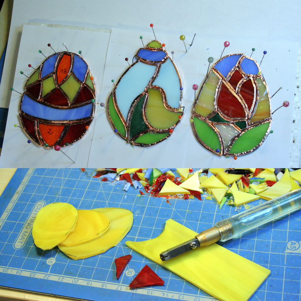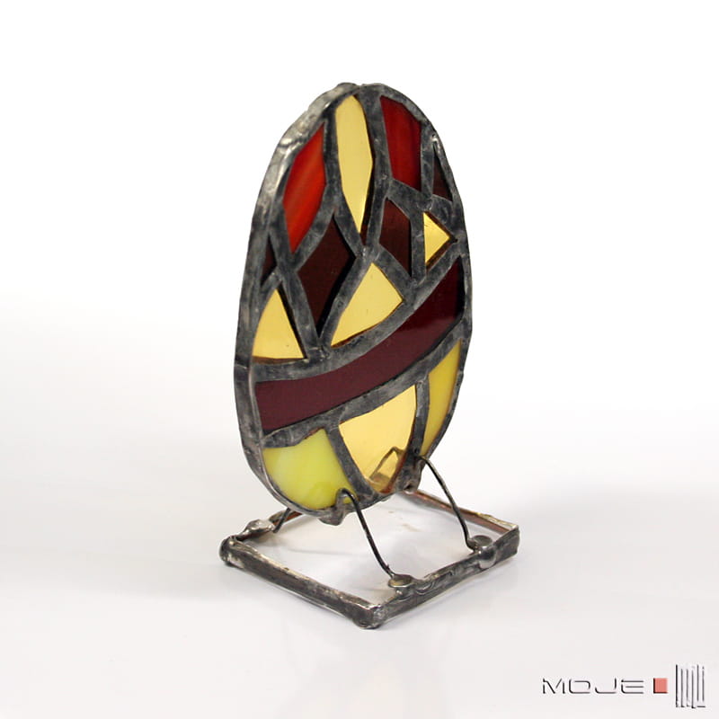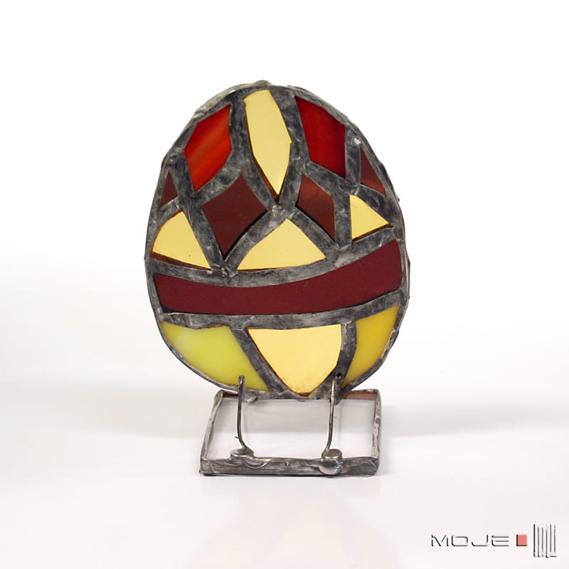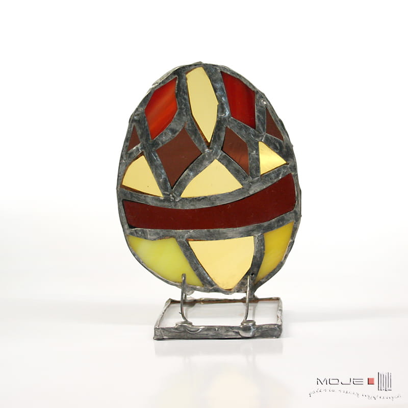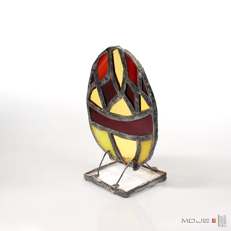 Dekoracyjne, witrażowe, stojące jajo-pisanka. Zrobione jest ze szkła witrażowego, oprawione w miedź cynowaną i patynowaną. Stoi na podstawce z bezbarwnego szkła.