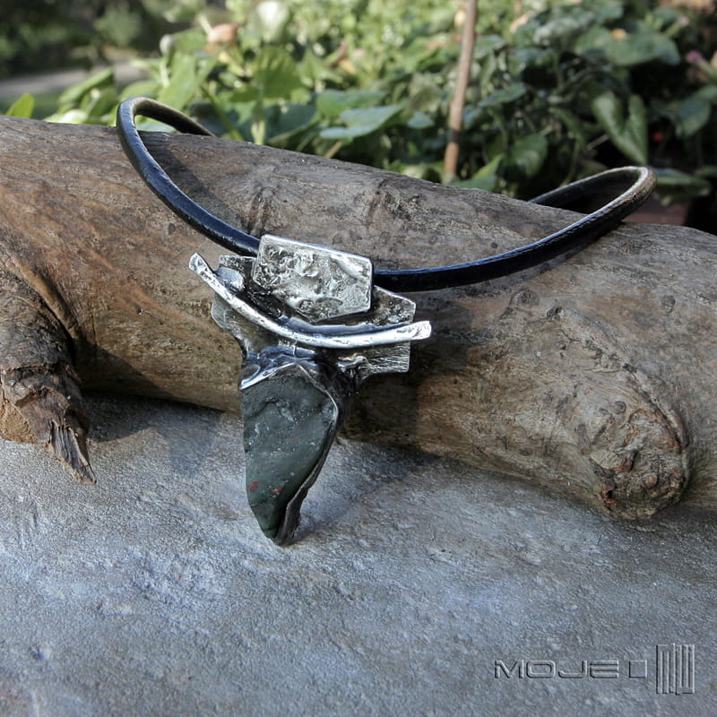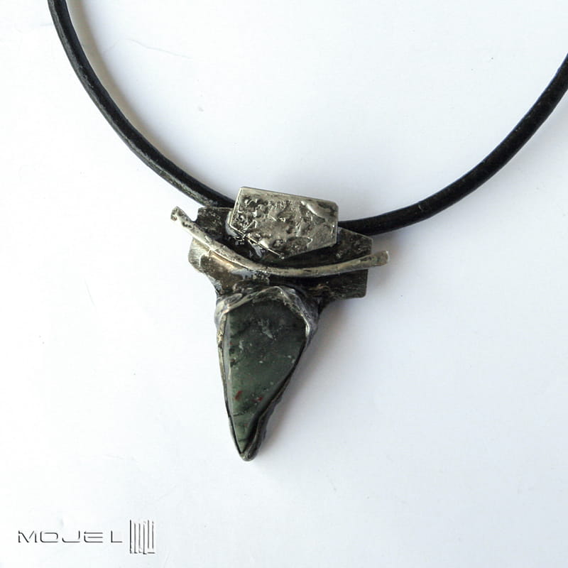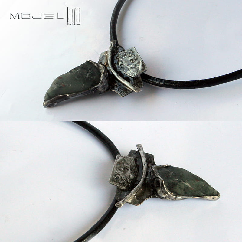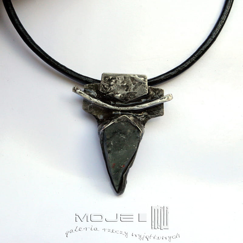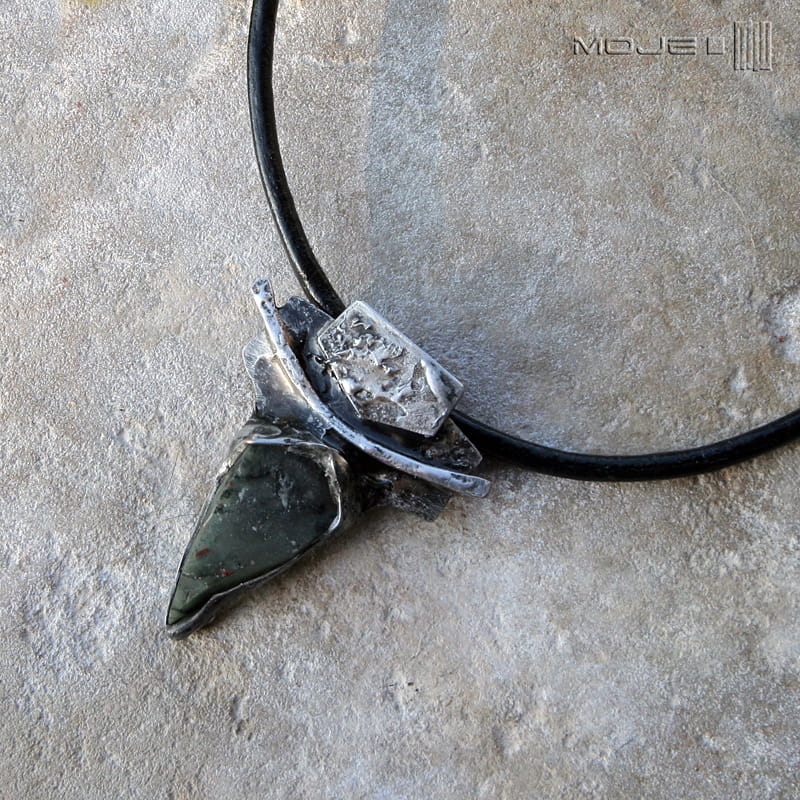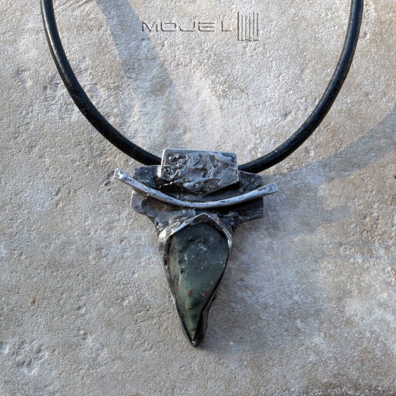 Bardzo męski wisior z bryłą szarozielonego jaspisu. Surowy w formie, niemały, swą kanciastością świetnie pasuje do męskiej szyi.