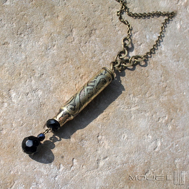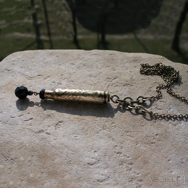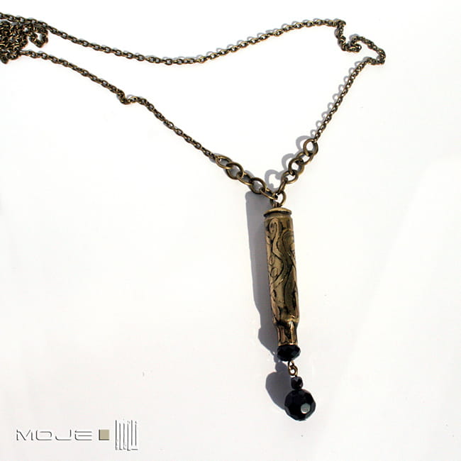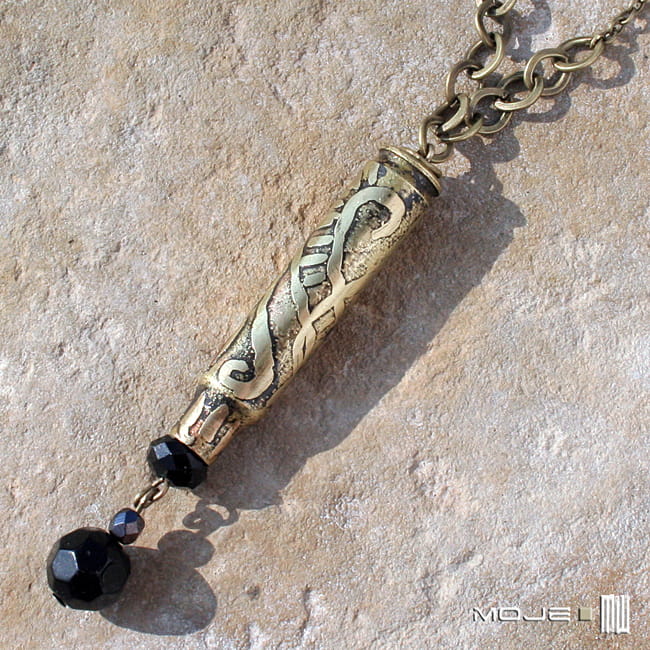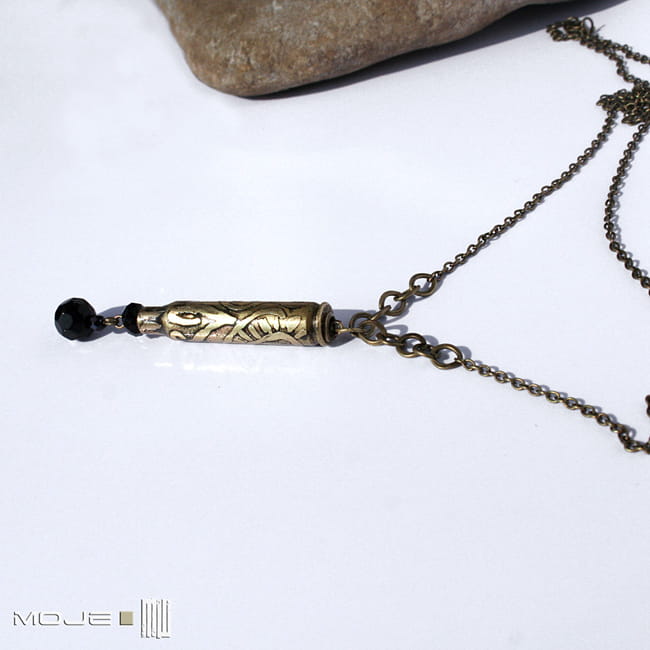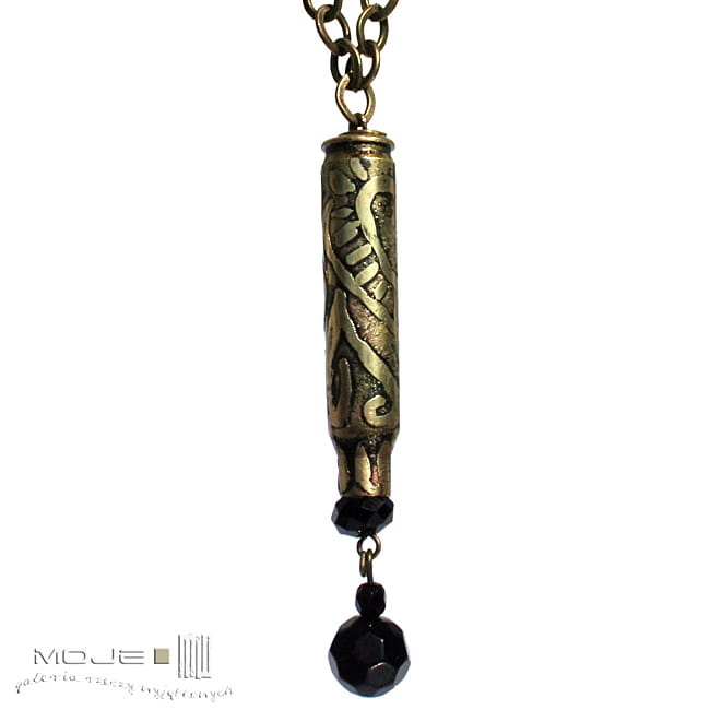 Wisior, który powstał z mosiężnej łuski, w której wytrawiłam wzór i spatynowałam. Ozdobą są szklane fasetowane koraliki w kolorze czarnym. Wisior zawieszony jest na łańcuszku w kolorze mosiężnym.