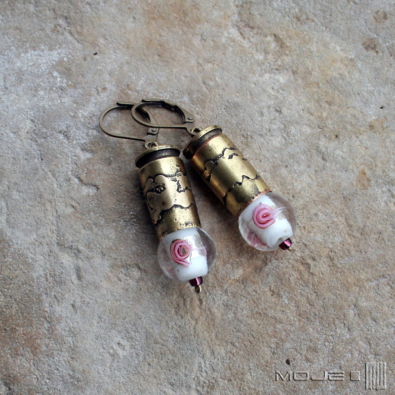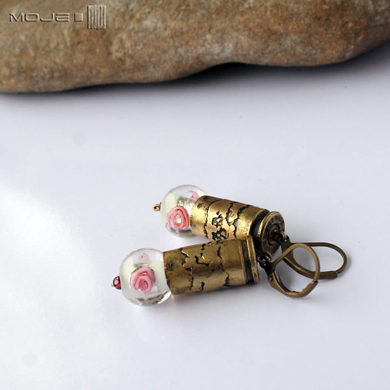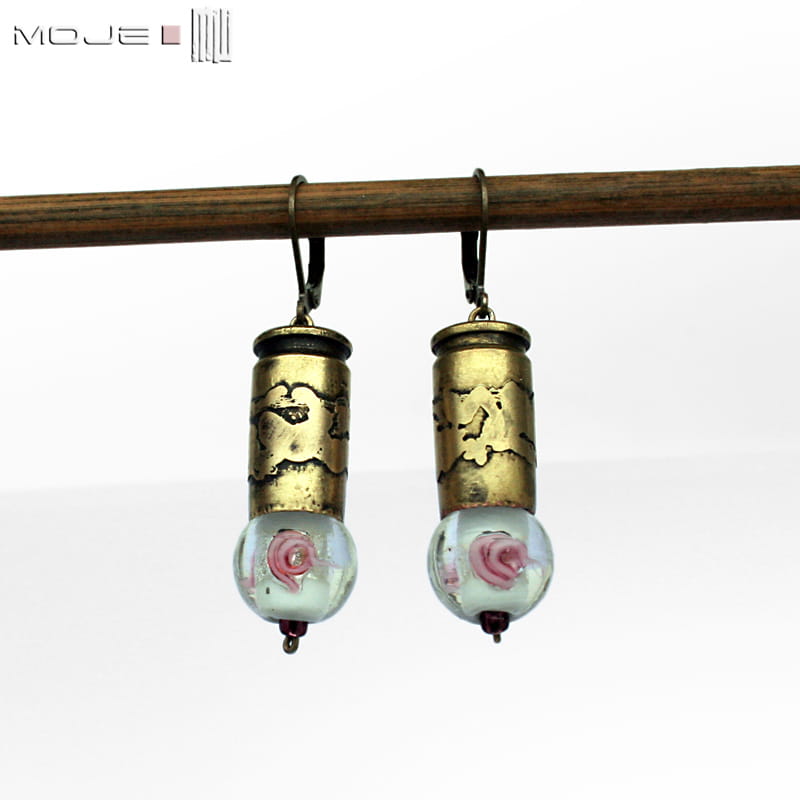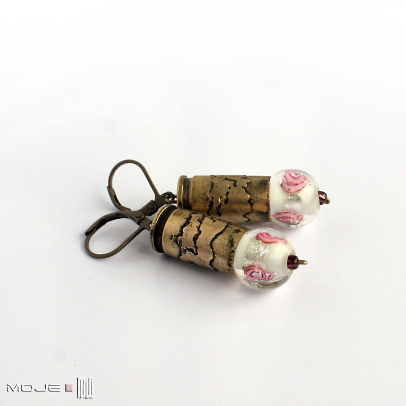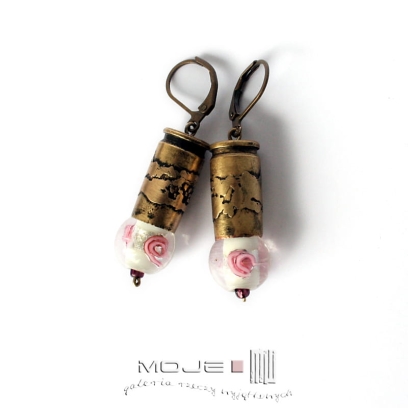 Kolczyki, które powstały z mosiężnych łusek, które wytrawiłam i spatynowałam. Ozdobą są szklane kule z motywem kwiatu róży w kolorach biało-różowych. Zawieszone na metalowych biglach w kolorze mosiężnym.