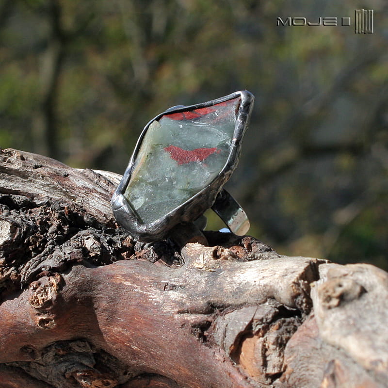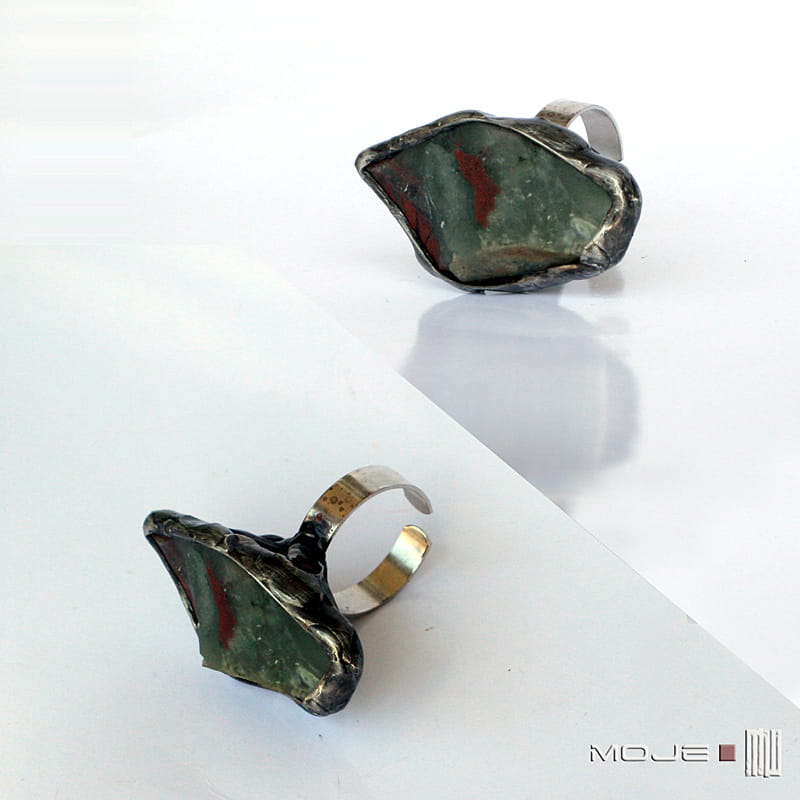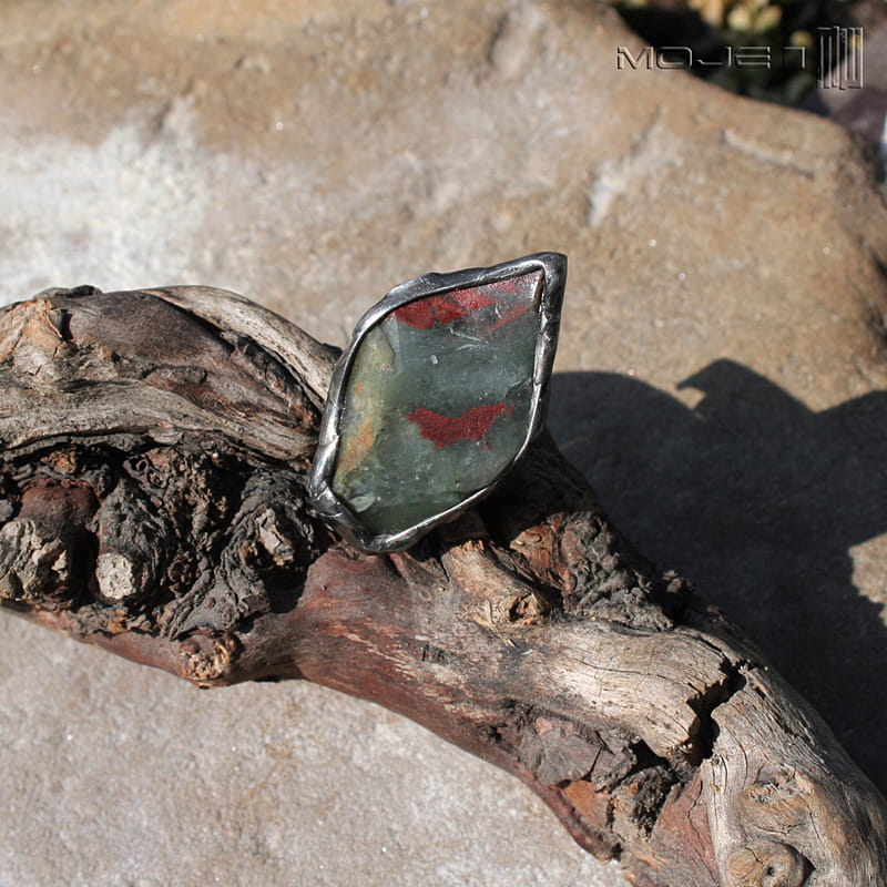 Pierścionek surową bryłką kamienia o nazwie jaspis wulkan. Kamień ma spokojną, szarozieloną barwę z akcentami czerwono-brązowymi i - mimo, że jest surowy, sprawia wrażenie aksamitnego. Oprawiony jest w cynowaną, patynowaną i przecieraną miedź. Obrączka regulowana.