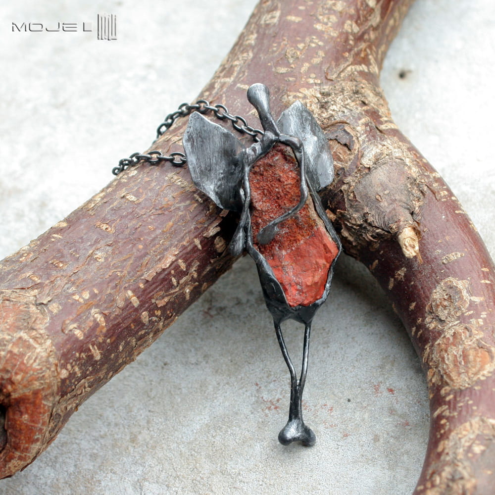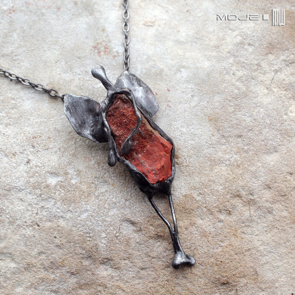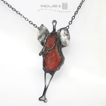 Wisior - aniołek z surowego czerwonego jaspisu oraz miedzi.