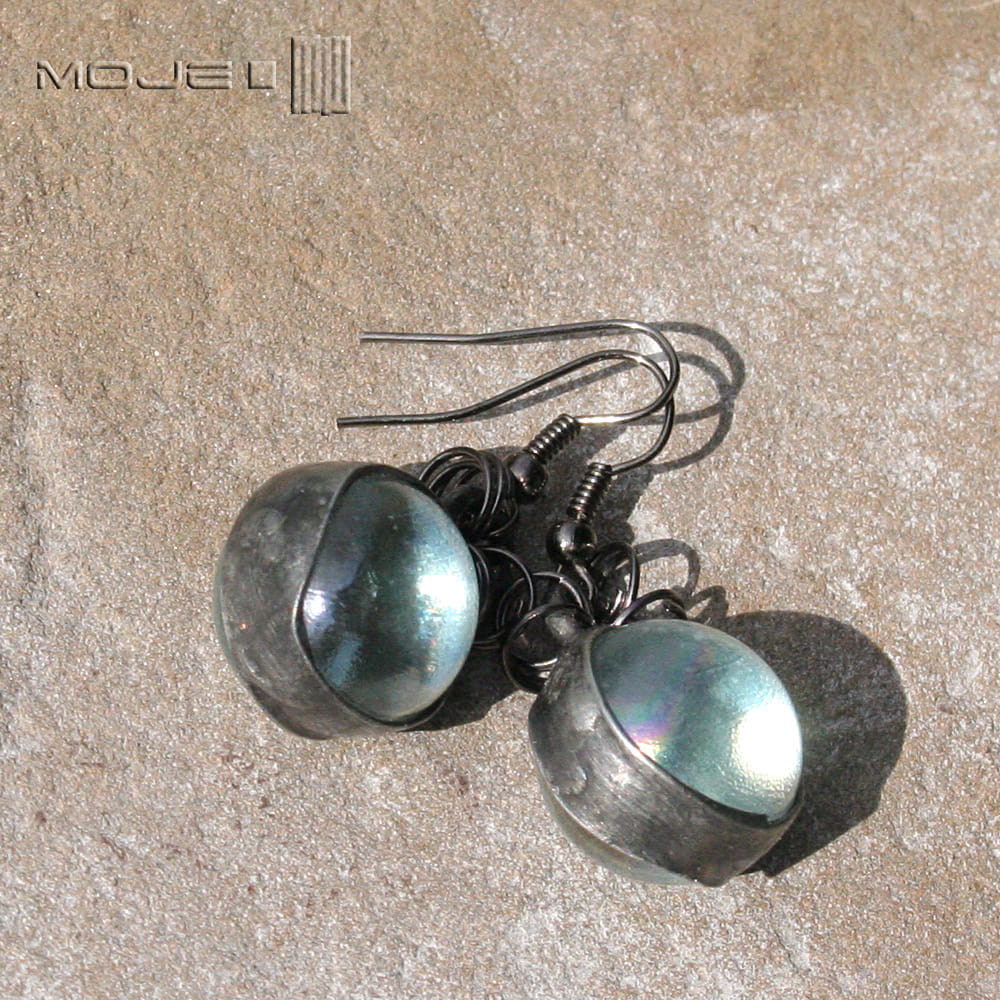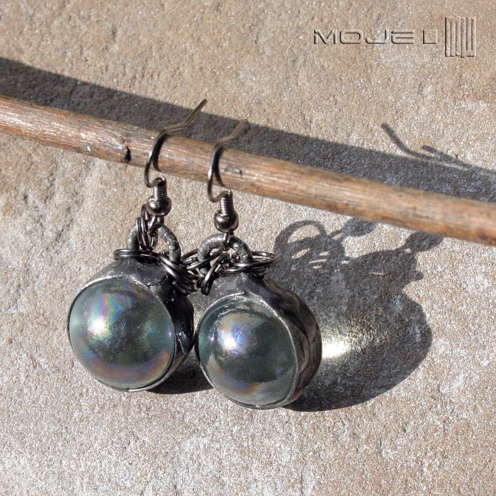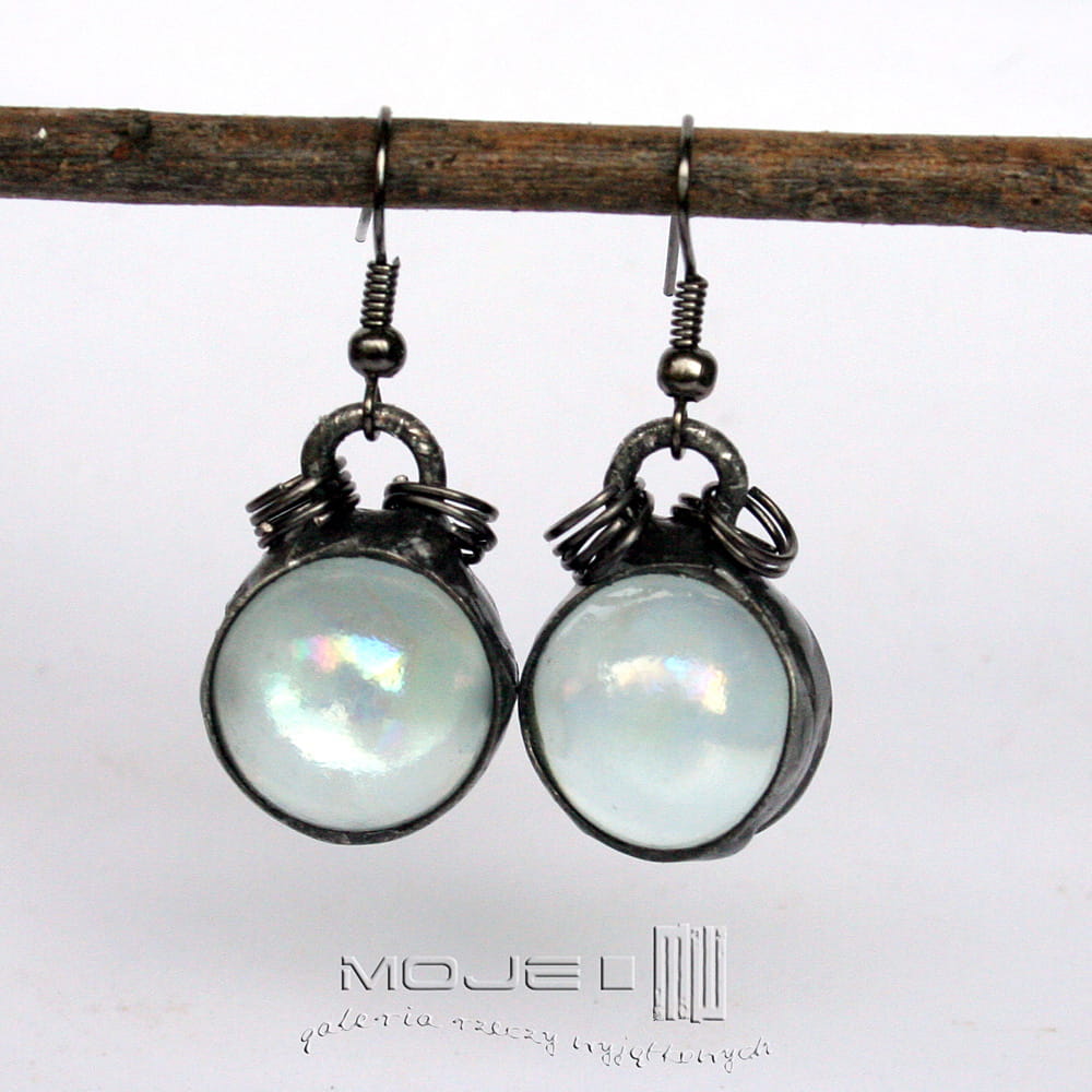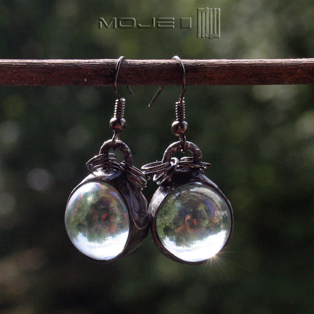 Kolczyki - szklane kule. Proste, ale efektowne kolczyki z przejrzystymi szklanymi kulkami, które delikatnie opalizują. Oprawione są prosto i minimalistycznie w miedź pokrytą cyną. Metalowe bigle.