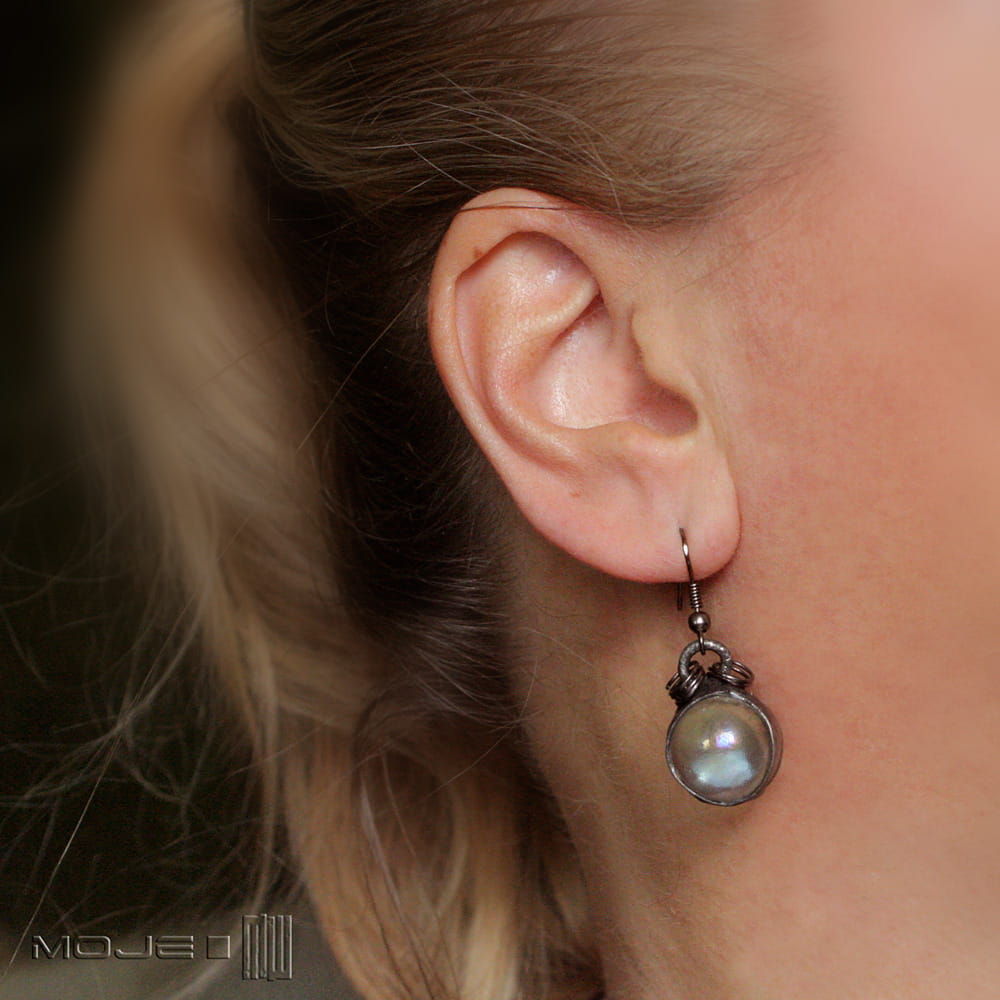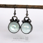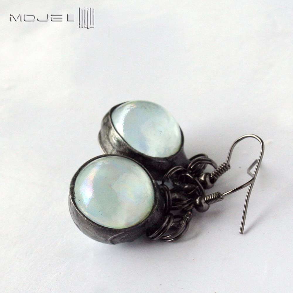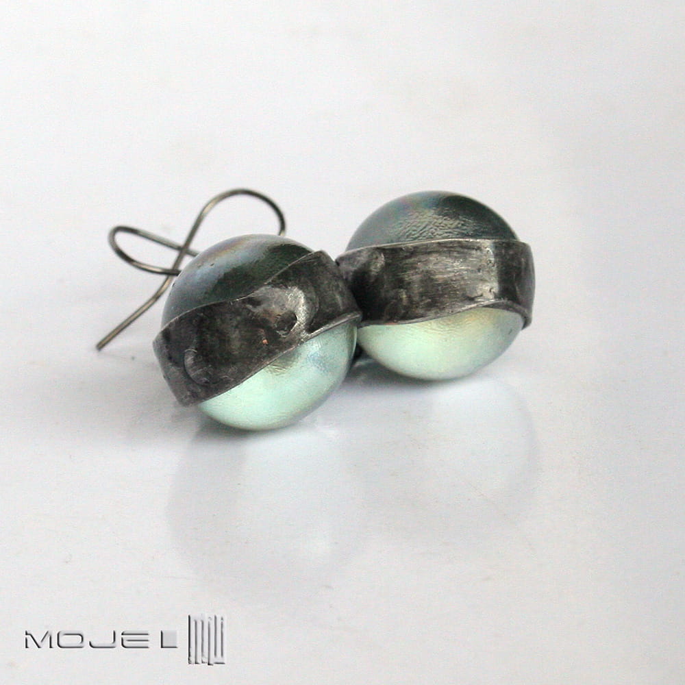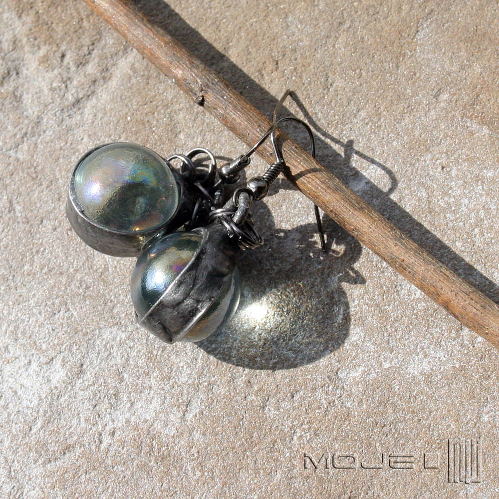 Kolczyki - szklane kule. Proste, ale efektowne kolczyki z przejrzystymi szklanymi kulkami, które delikatnie opalizują. Oprawione są prosto i minimalistycznie w miedź pokrytą cyną. Metalowe bigle.