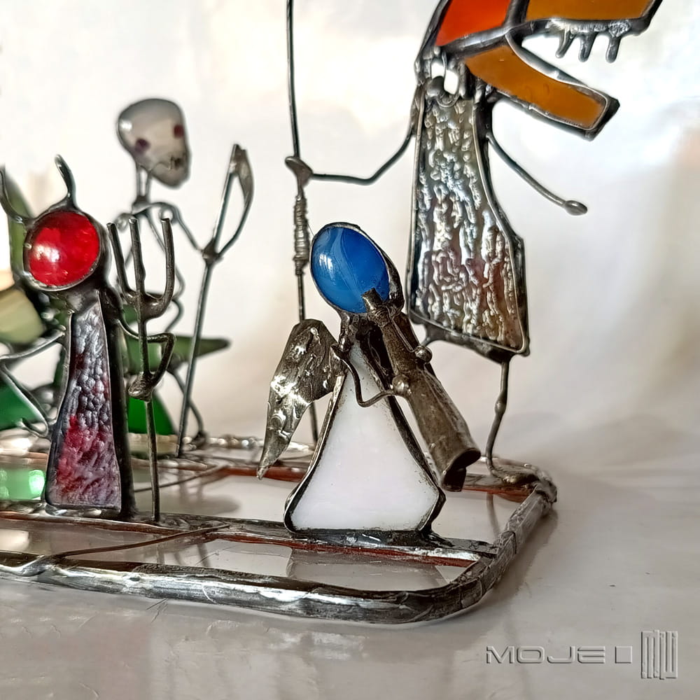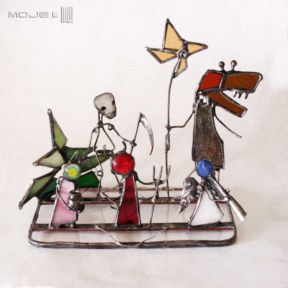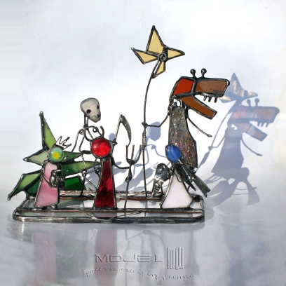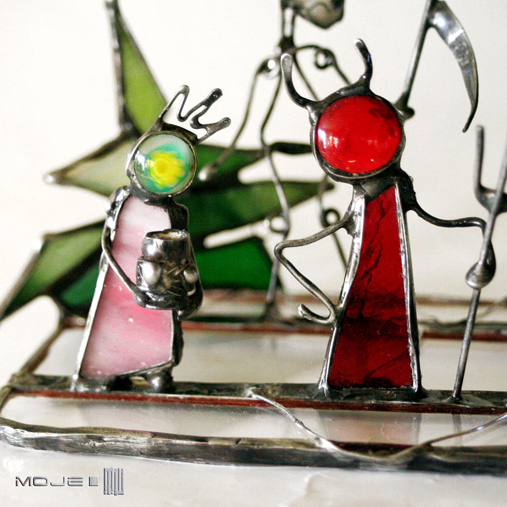 Ta cudna gromadka zrobiona jest ze szkła witrażowego i miedzi metodą Tiffany, są cynowani, patynowani i przecierani.