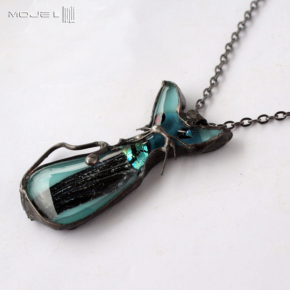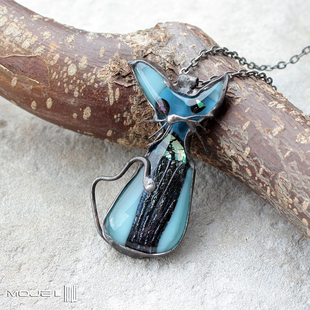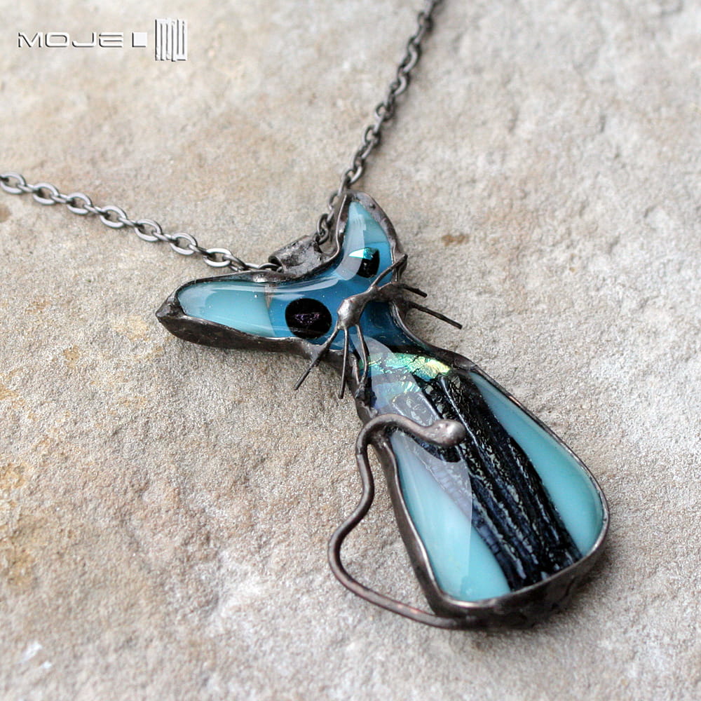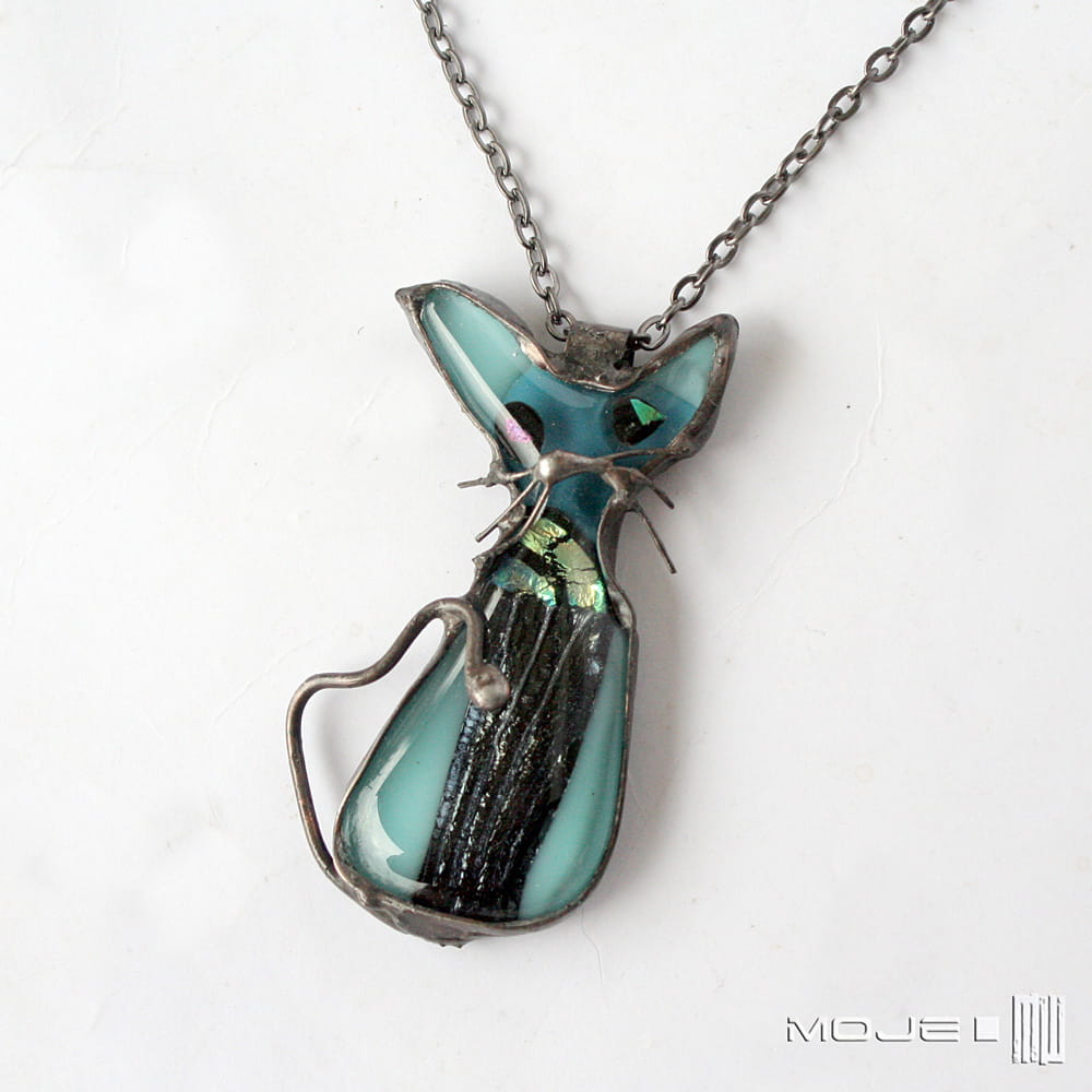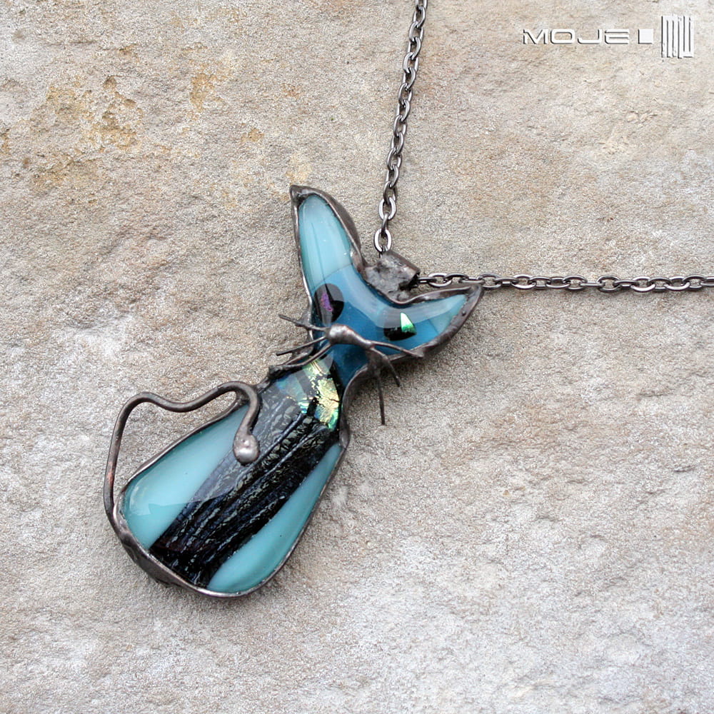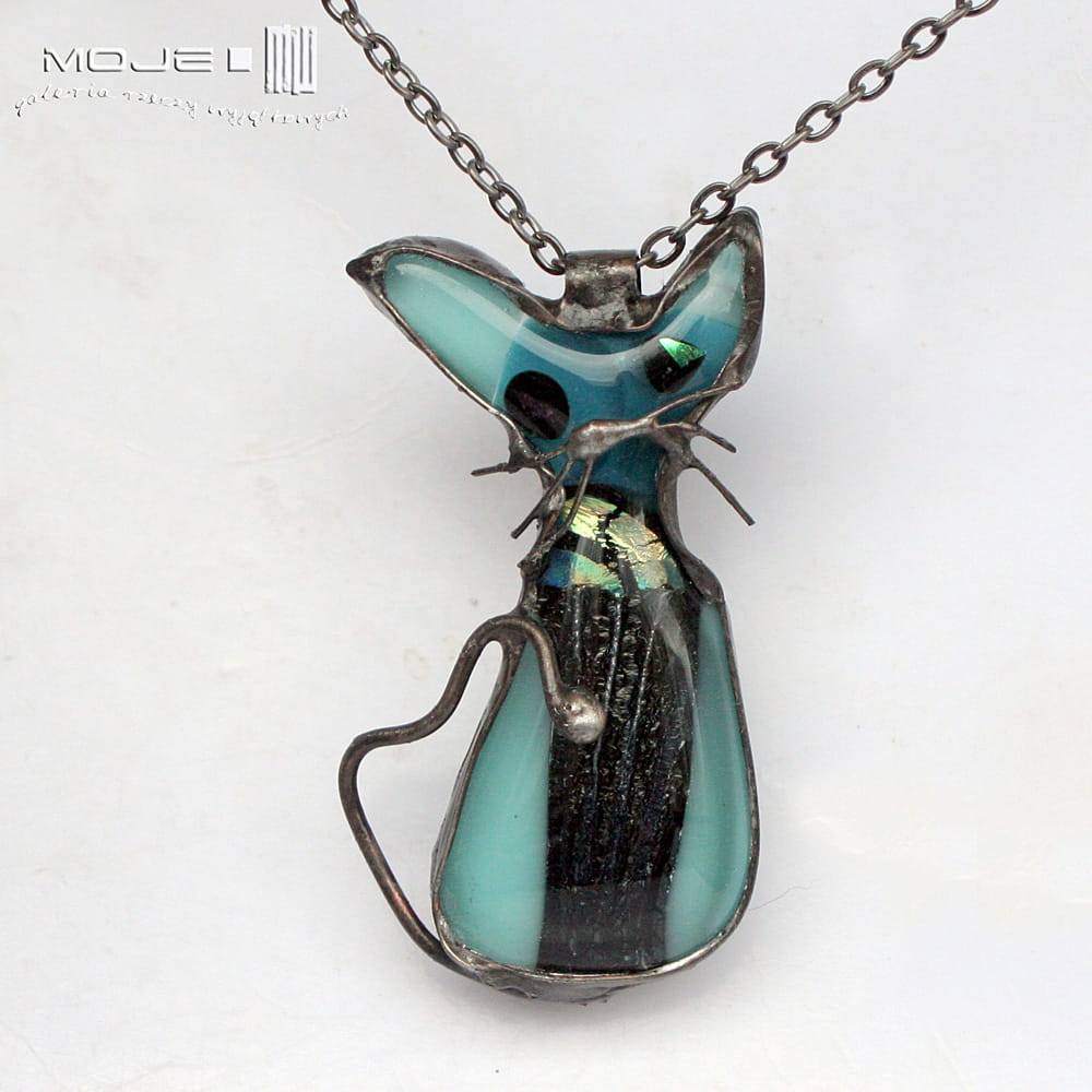 Śmieszny kot - szklany wisiorek wykonany przeze mnie metodą fusingu, czyli stapiania szkła w wysokiej temperaturze. Wytopiłam go z blado- i trochę mocniej turkusowego szkła bullsey oraz szkła dichroicznego, które opalizuje w słońcu.
