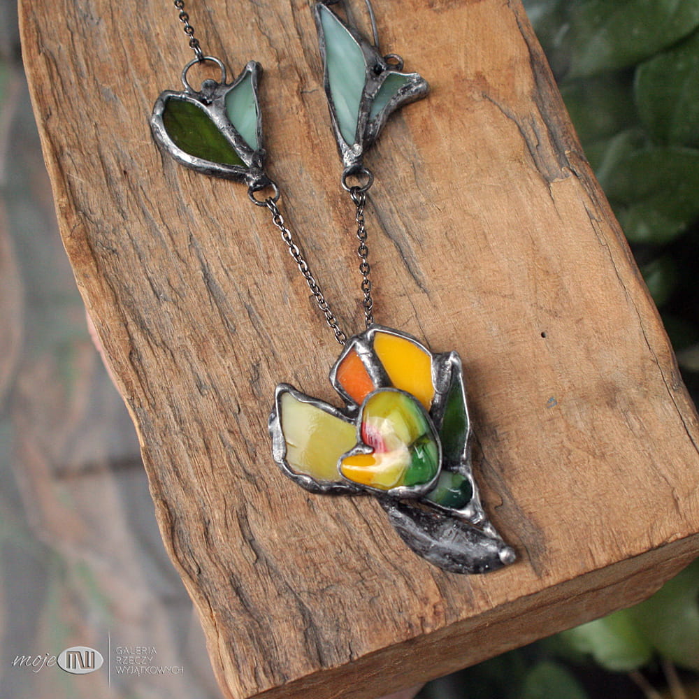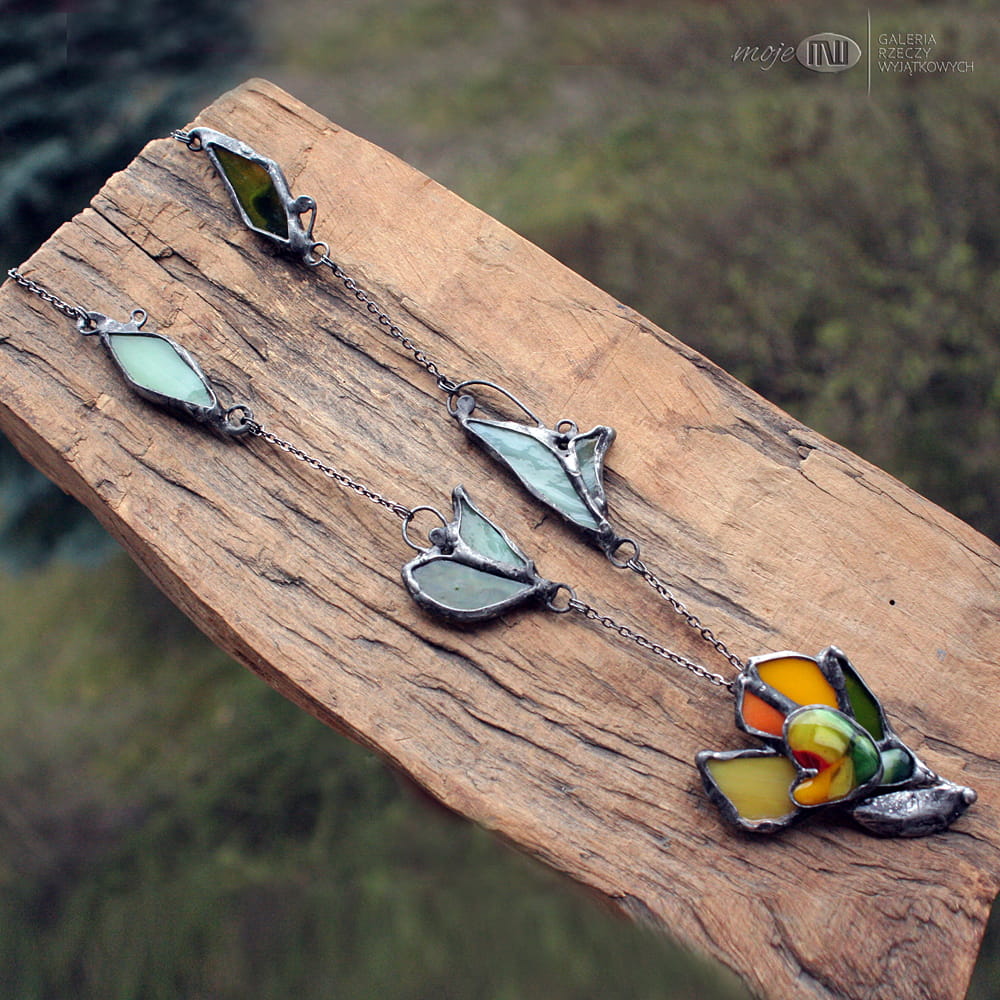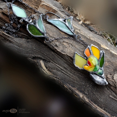 Z żółtego i zielonego szkła w różnych odcieniach metodą fusingu wytopiłam stylizowany kwiatek wiosenny - krokus. Dostał kilka płatków z witrażowego szkła, całość oprawiłam w miedź - pokrytą cyną, patynowaną i przecieraną. Dodatkową ozdobą są listki ze szkła stanowiące część łańcuszka.