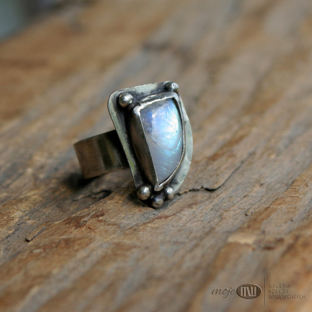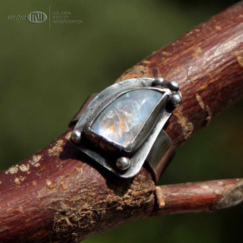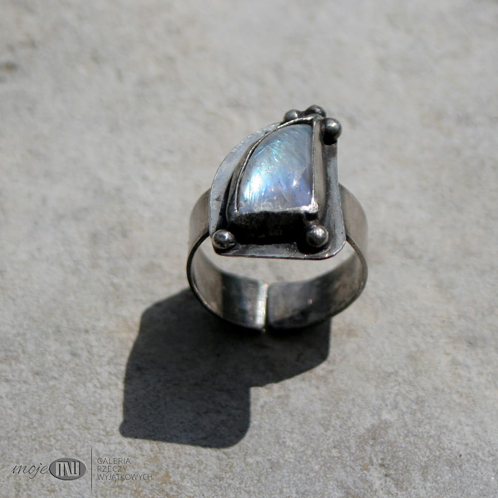 Trójkątny, nieco nieregularny pierścionek z kamieniem księżycowym.