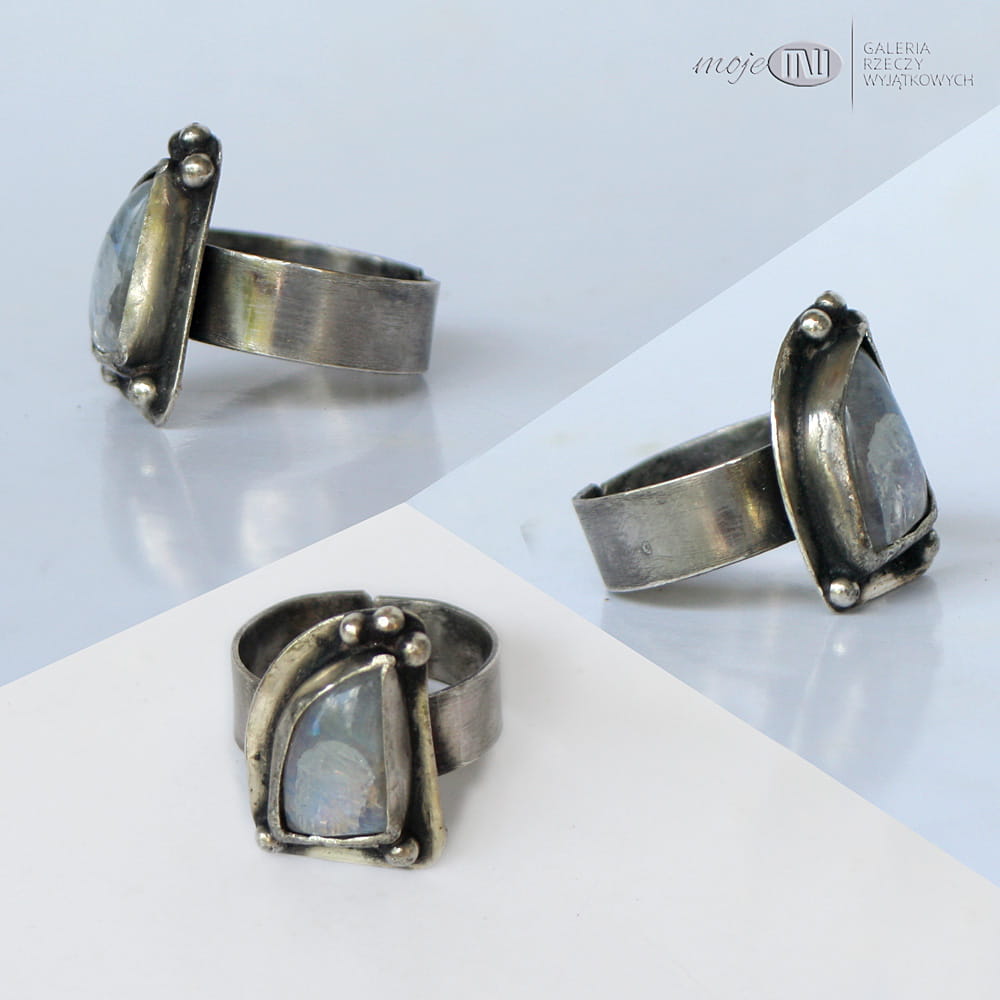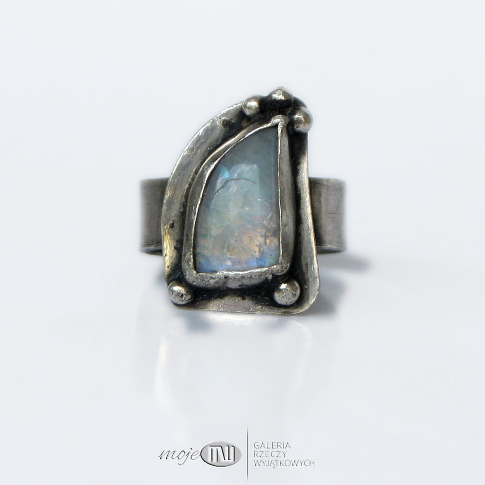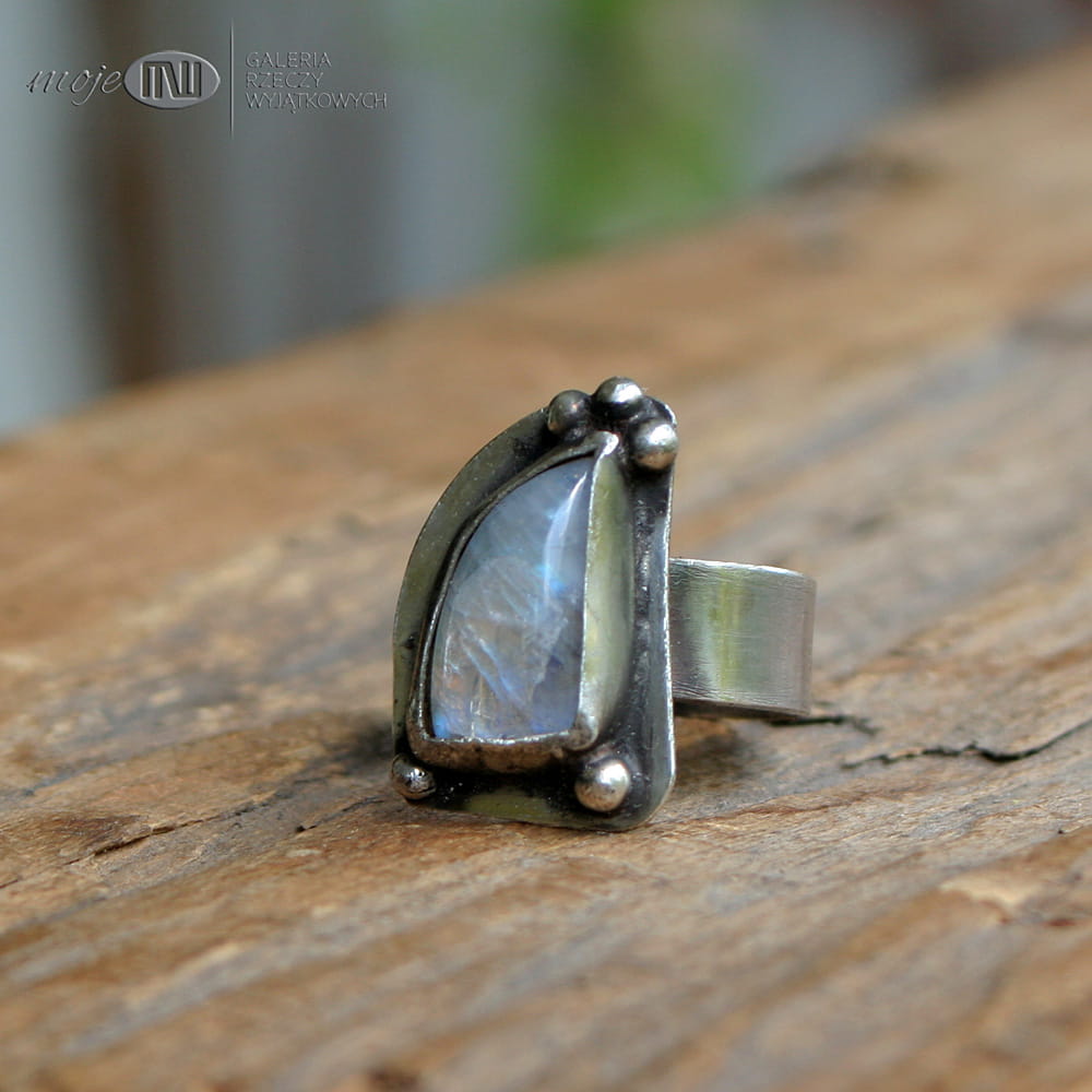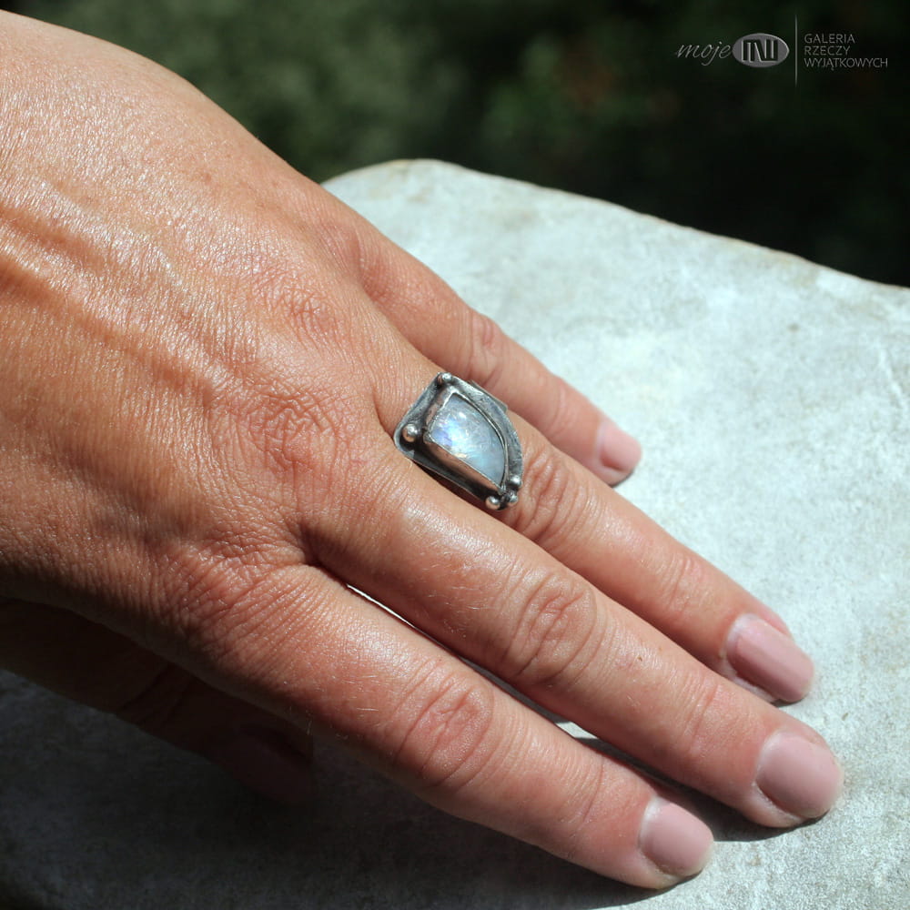 Trójkątny, nieco nieregularny pierścionek z kamieniem księżycowym.