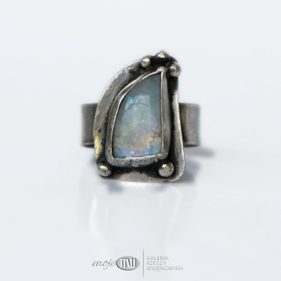 Trójkątny, nieco nieregularny pierścionek z kamieniem księżycowym. Zrobiłam go ze srebra próby min. 925 - oksydowany i miejscowo polerowany. Kamień oprawiony jest dość prosto, dodatkową ozdobą są tylko kuleczki srebra i nieco szersza obrączka.