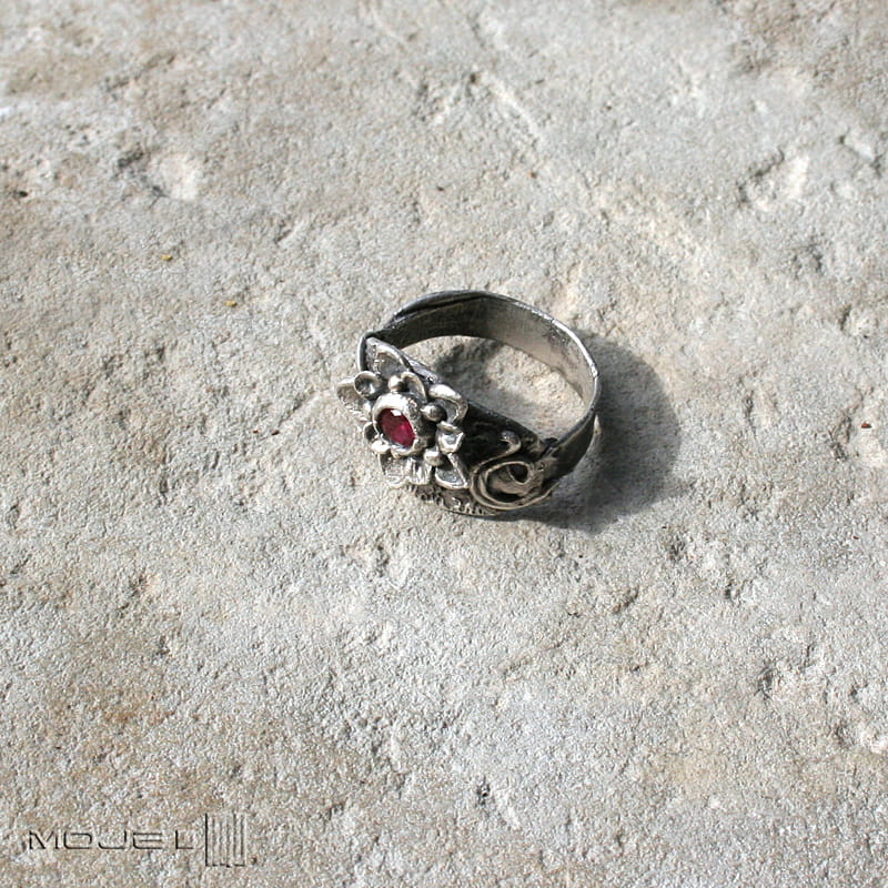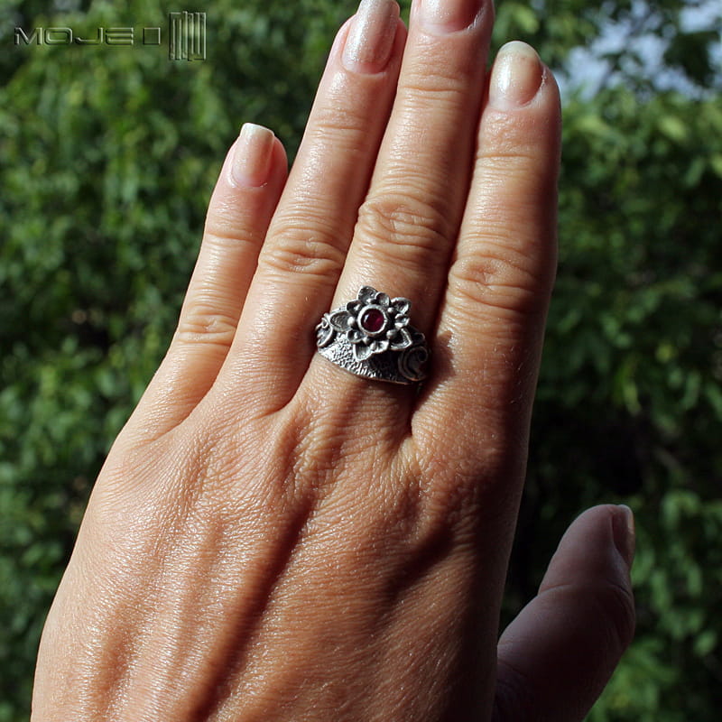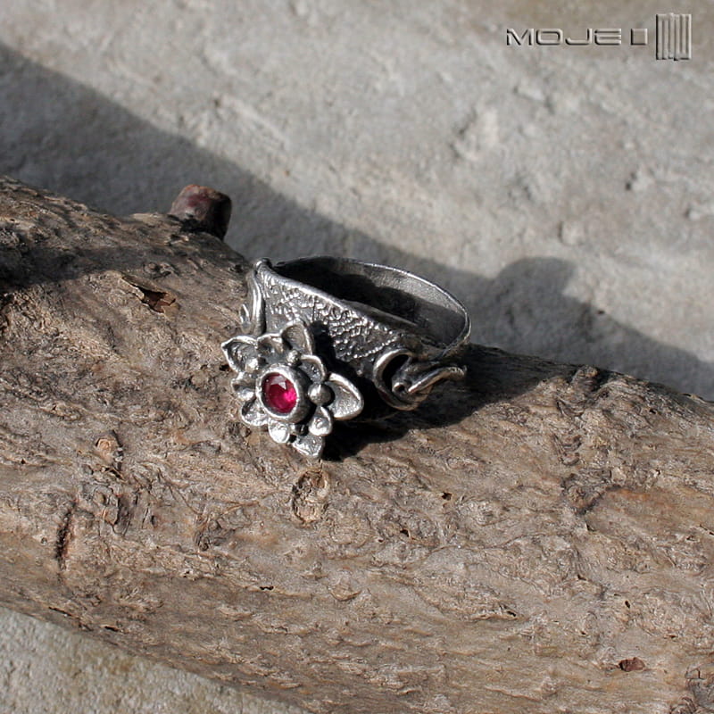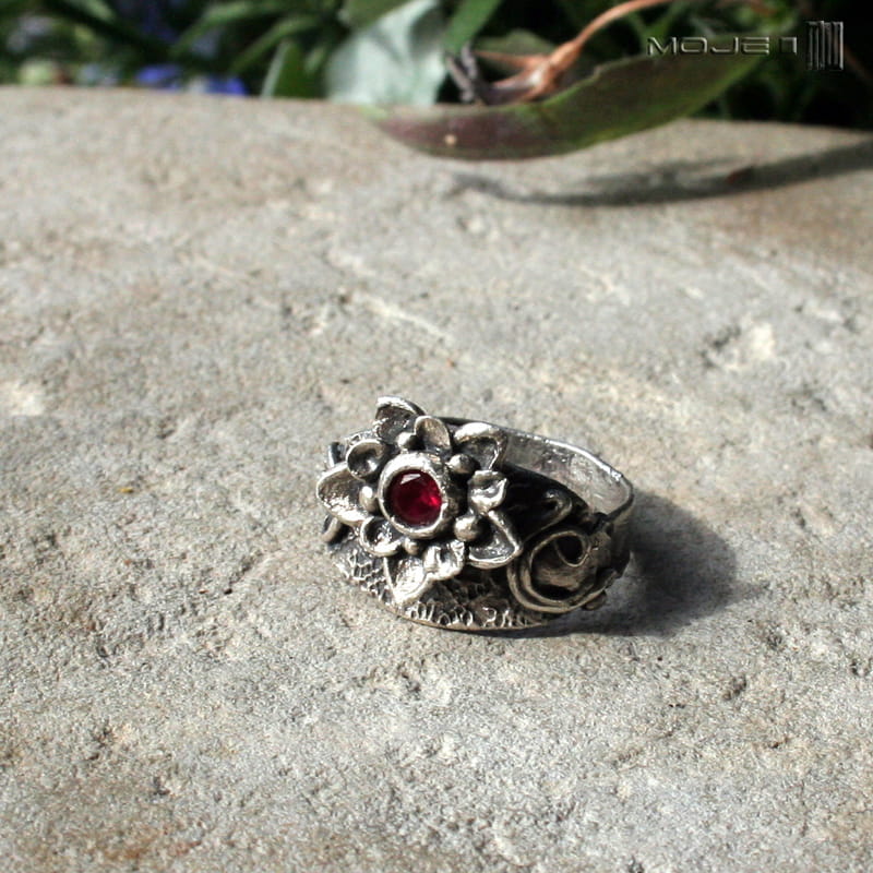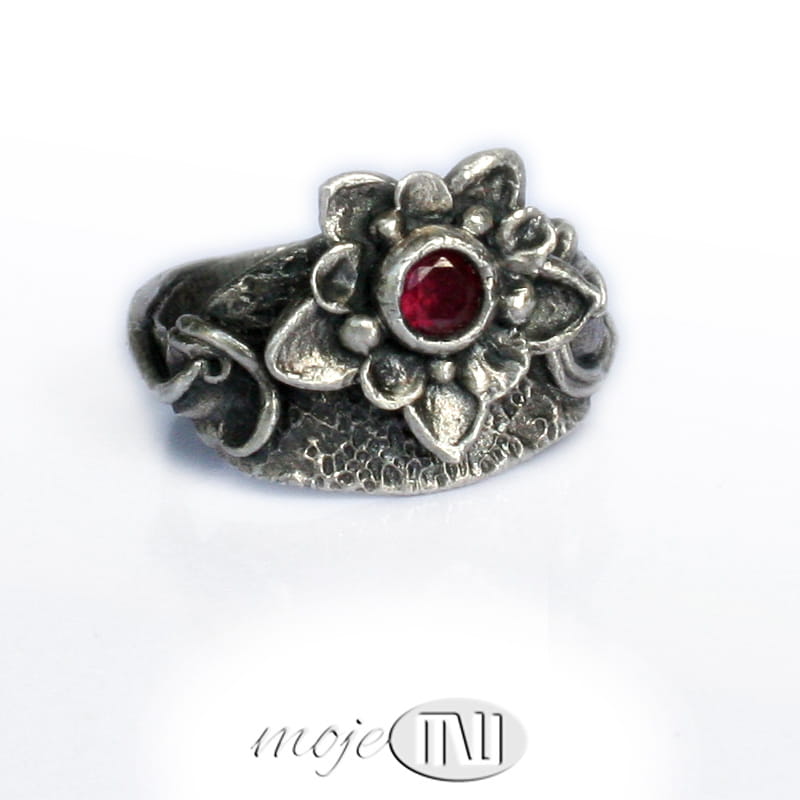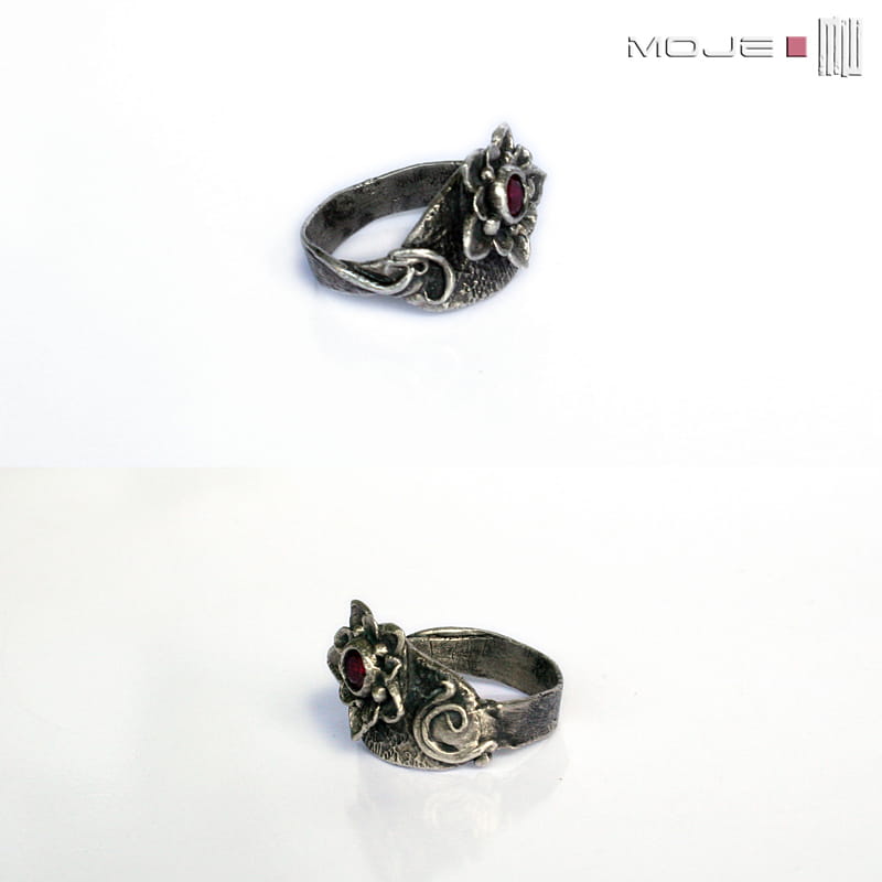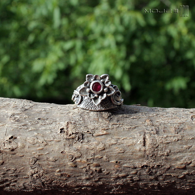 Pierścionek zrobiłam ręcznie ze srebra próby min. 925. Głównym elementem jest pracowicie formowany kwiat z czerwoną cyrkonią. Srebro jest oksydowane i przecierane.