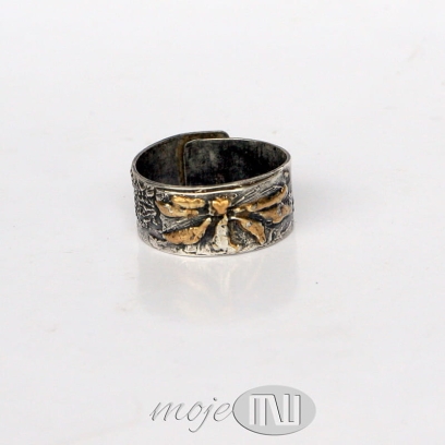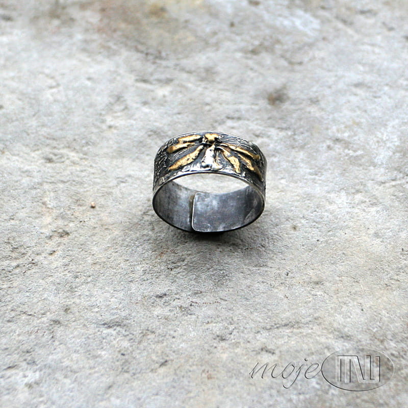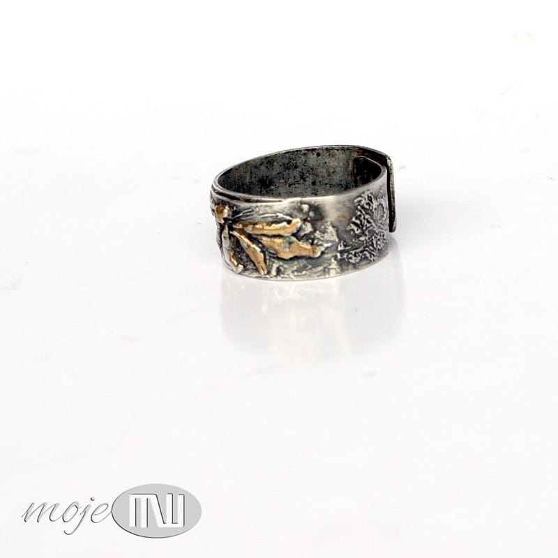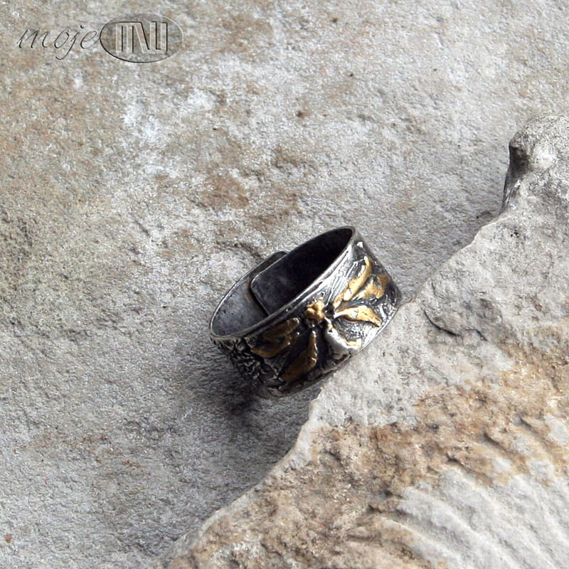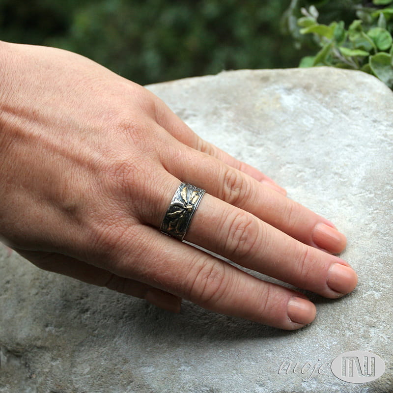 Obrączka ręcznie wykonana ze srebra próby min. 925. Zdobią ją desenie z motywem kwiatowym ;) Srebro jest oksydowane i przecierane dla wydobycia wzoru. Delikatnie złocone elementy płatków.