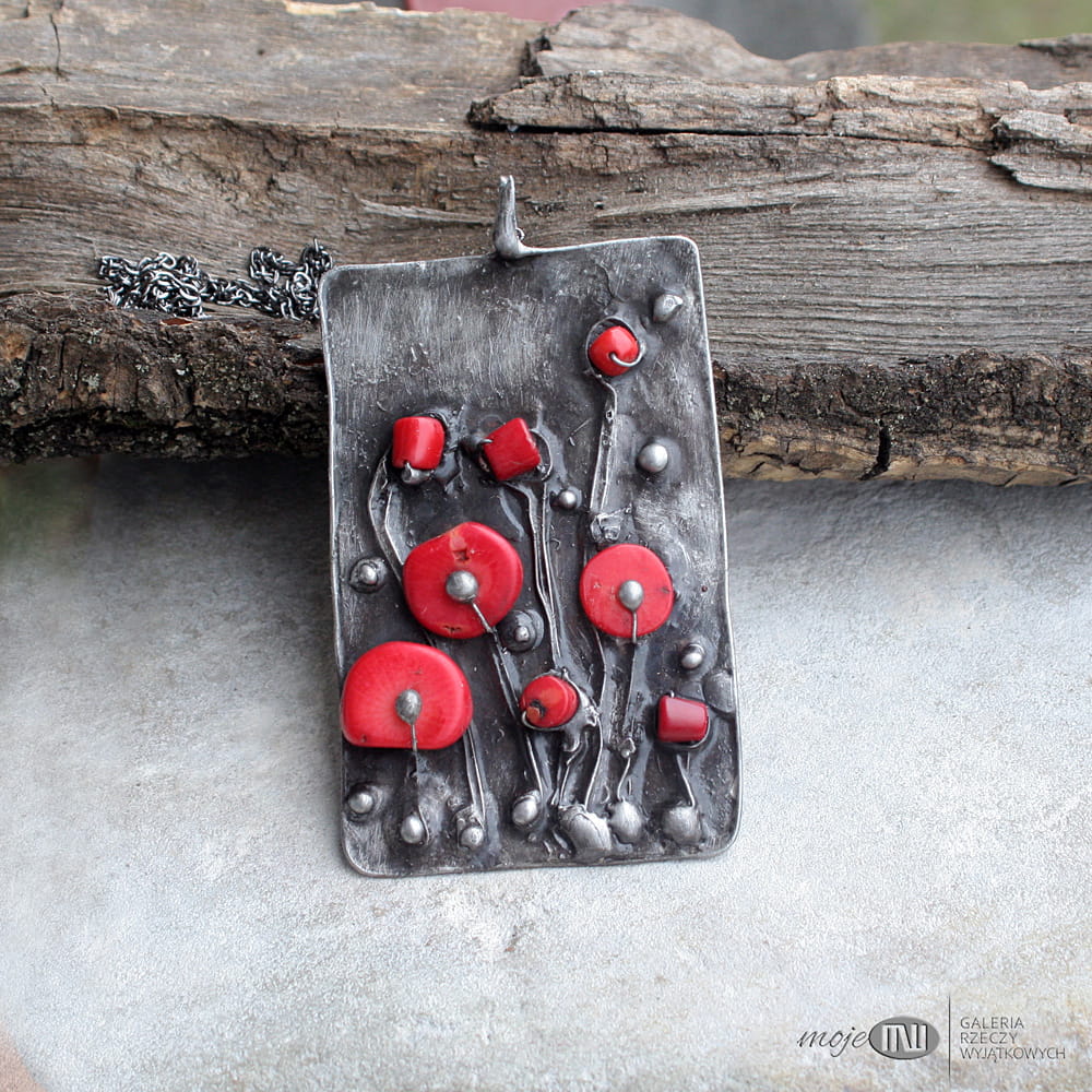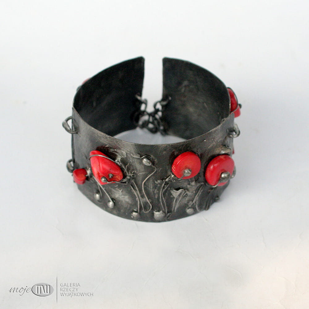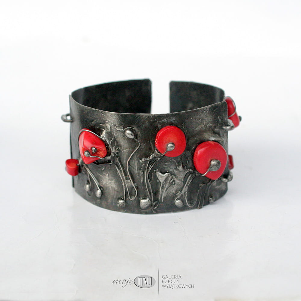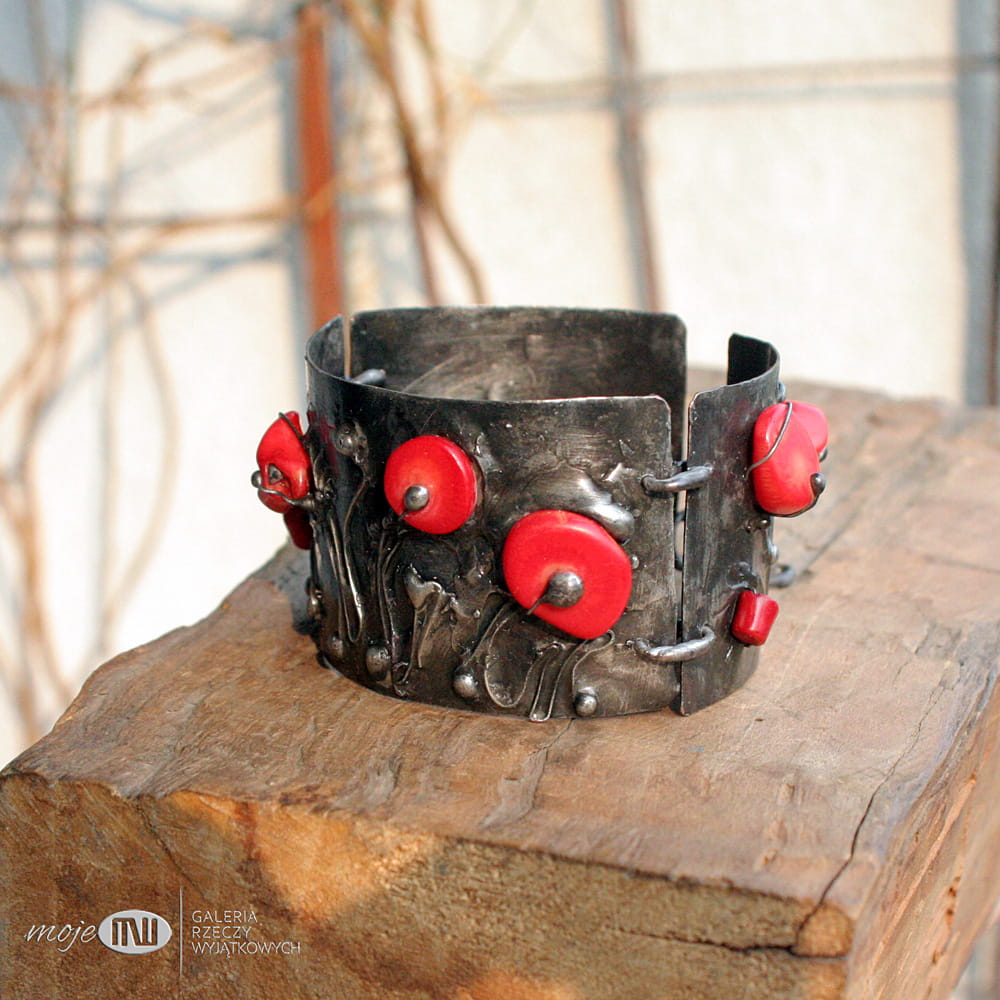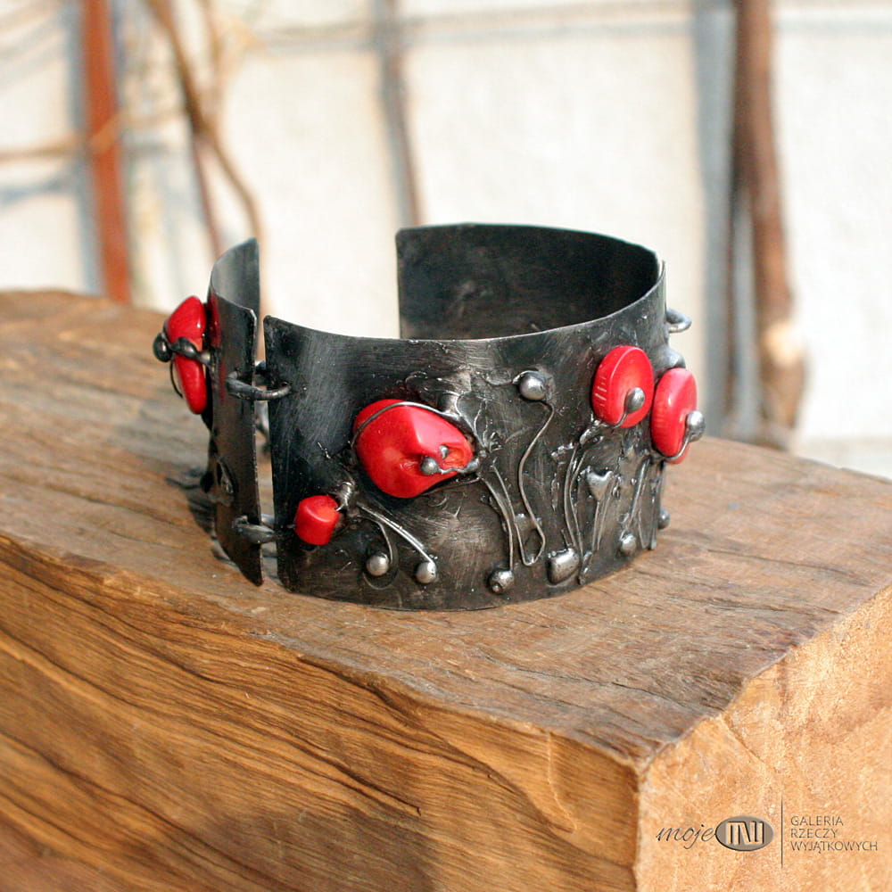 Koloru dodają czerwone plastry i oponki prawdziwego korala, jako stylizowane kwiaty maków.