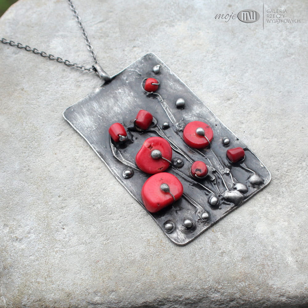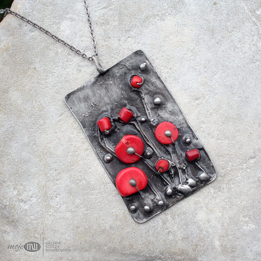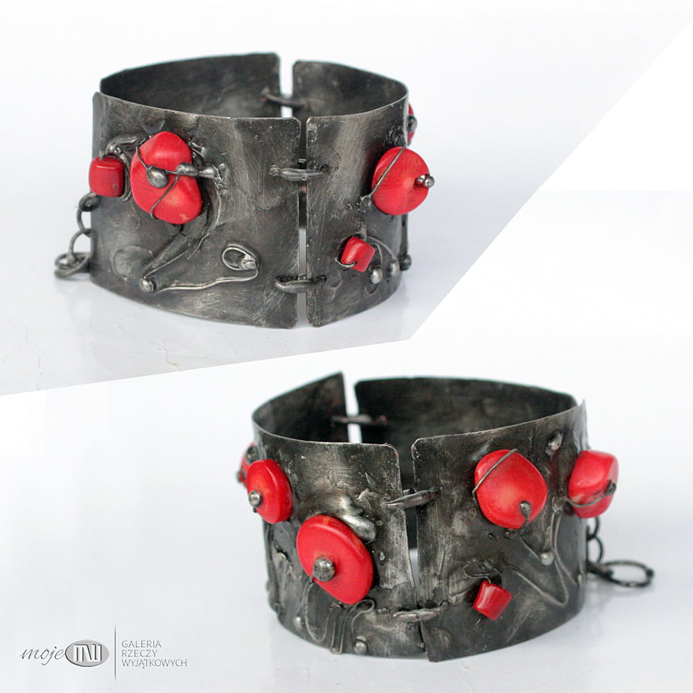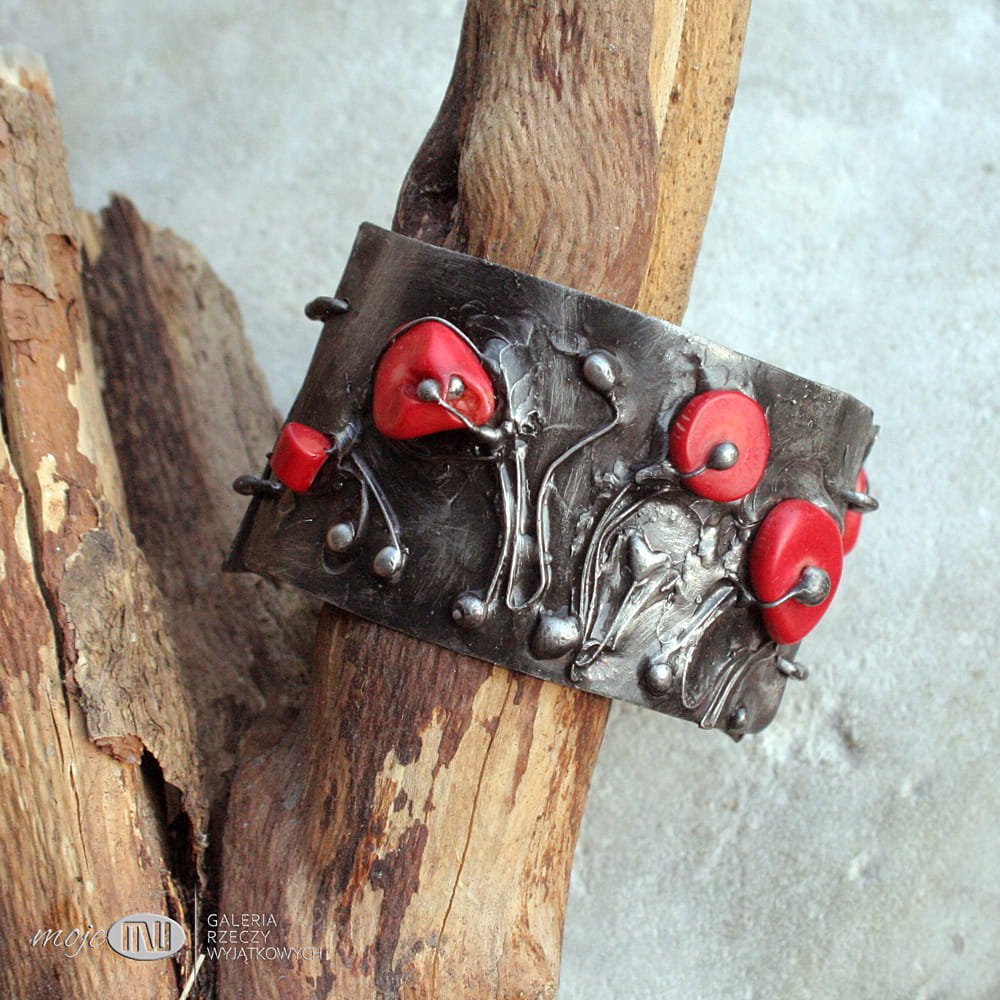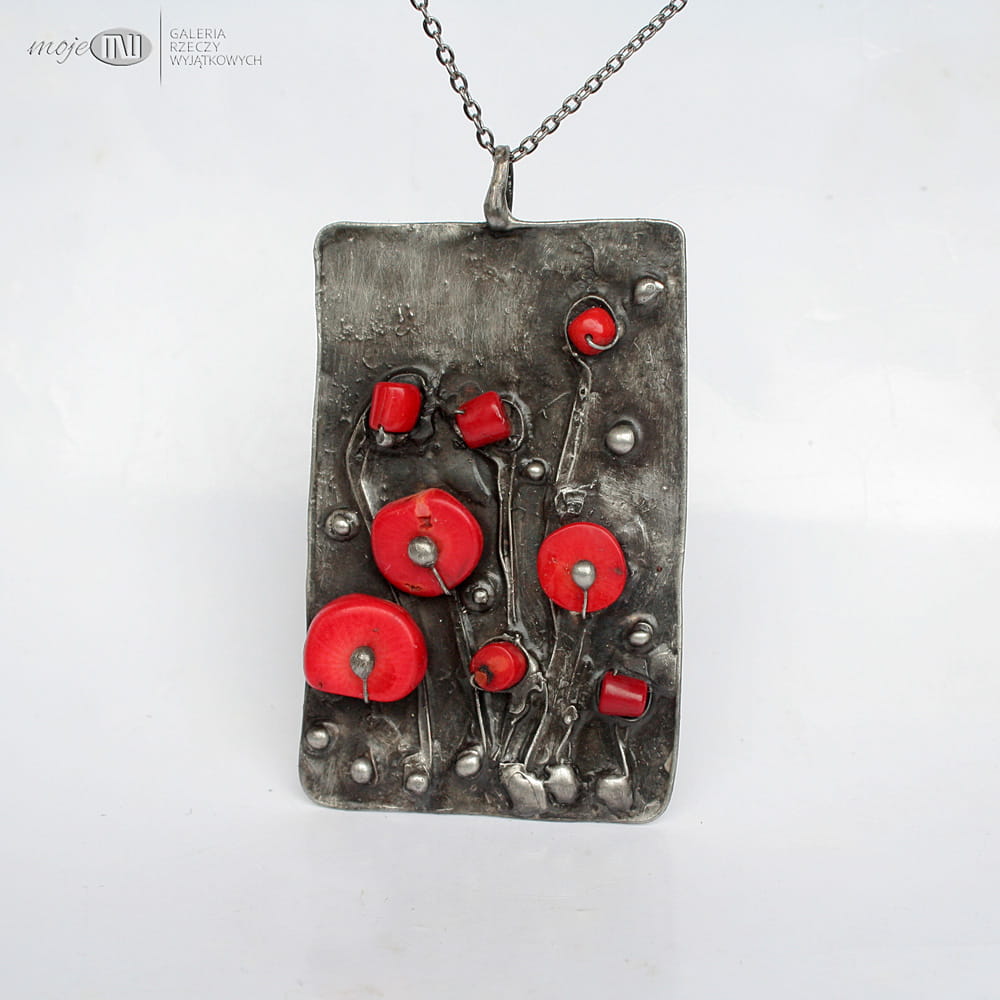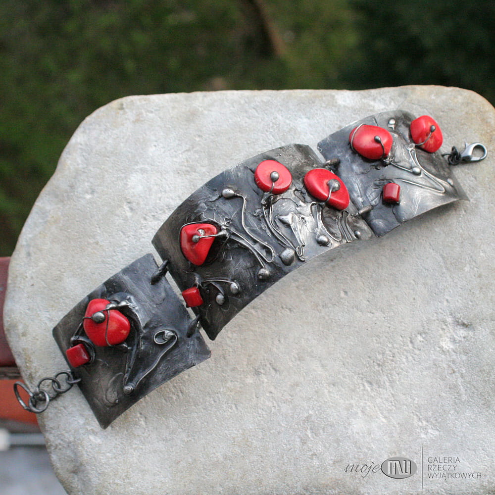 Koloru dodają czerwone plastry i oponki prawdziwego korala, jako stylizowane kwiaty maków.