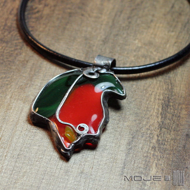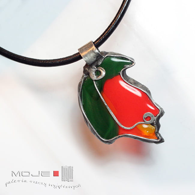 Wisior - kwiat wykonany przeze mnie z pomarańczowego i zielonego szkła oraz miedzi. Szkło wytopione jest przeze mnie w temperaturze kilkuset stopni metodą fusingu. Szkło obrabiane w ten sposób jest bardziej trwałe i odporne na zarysowania.
