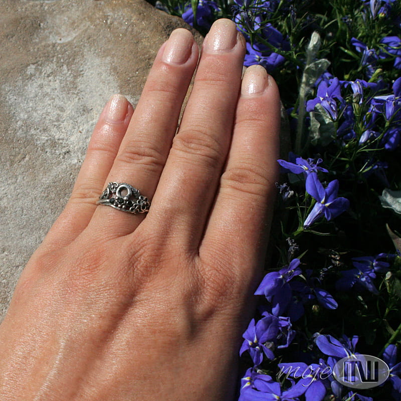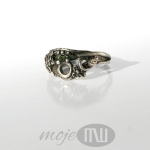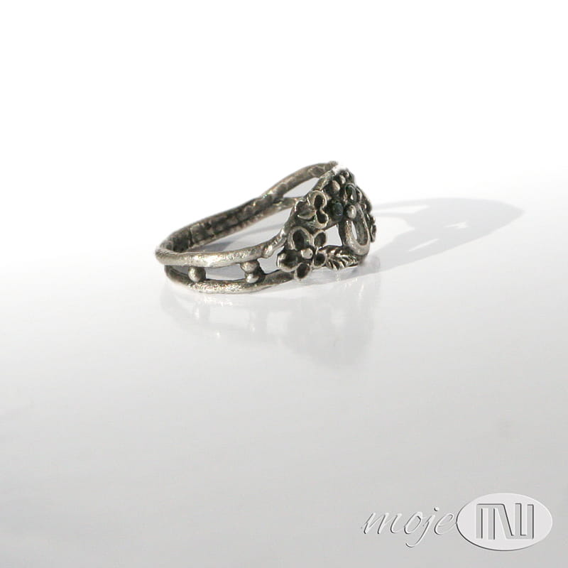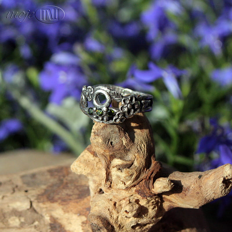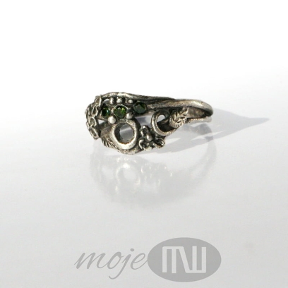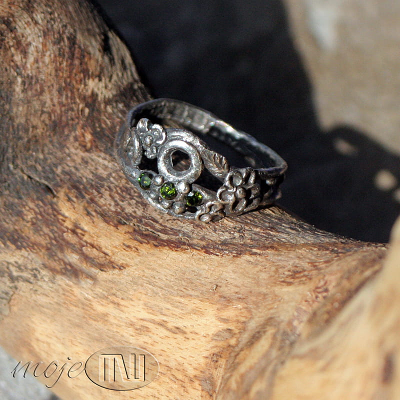 Delikatny pierścionek z mojej letniej, kwiatowej serii. Zrobiłam go z ręcznie formowanego srebra próby min. 925. Zdobią go drobne kwiatuszki, gałązki i trzy maleńkie zielone cyrkonie. Srebro jest oksydowane i częściowo przecierane dla wydobycia detali.