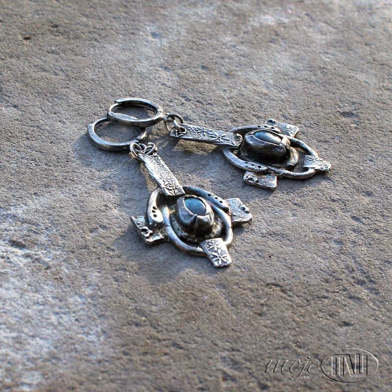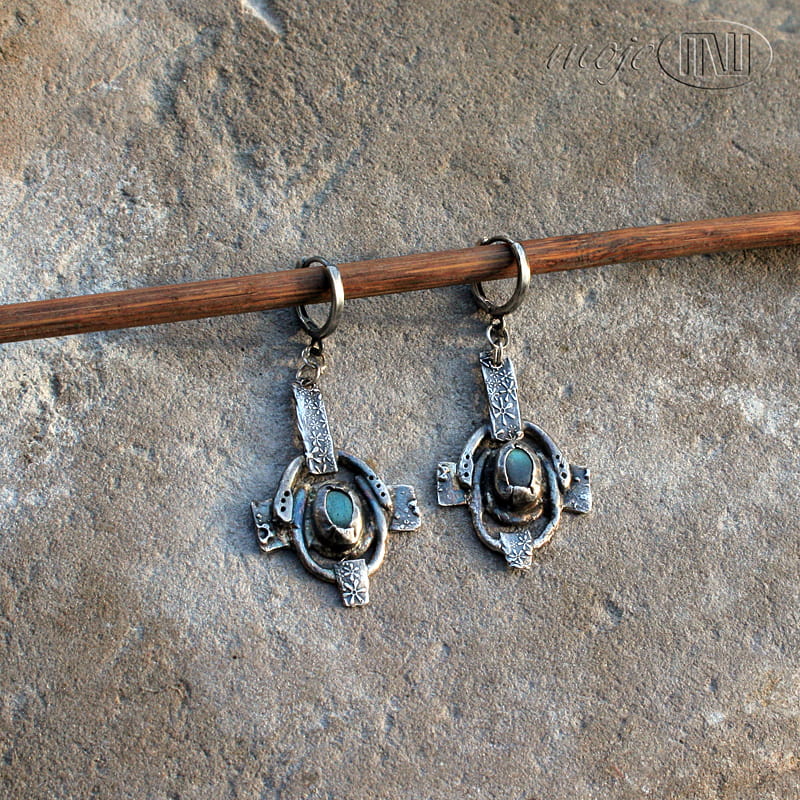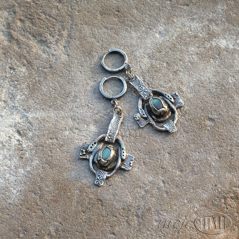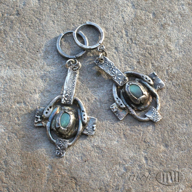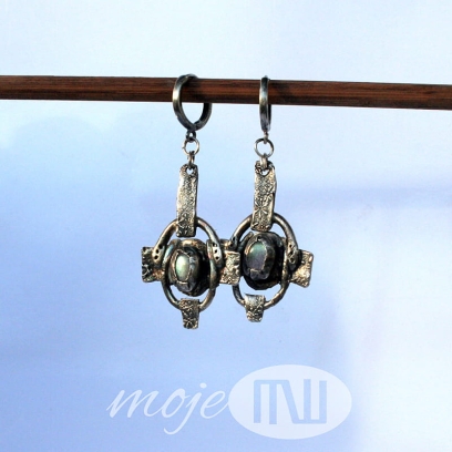 Kolczyki z kwiatowym ornamentem odciśniętym w ręcznie formowanym srebrze. Odrobinę koloru wprowadzają niewielkie labradoryty o zielonkawej poświacie. Srebro jest oksydowane i przecierane dla wydobycia wzorów. Zawieszone na bardzo delikatnych (także w "obsłudze"!) okrągłych biglach-kajdankach.