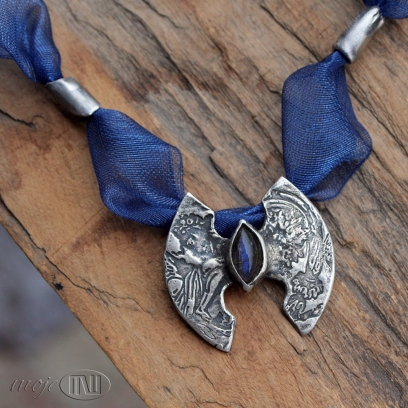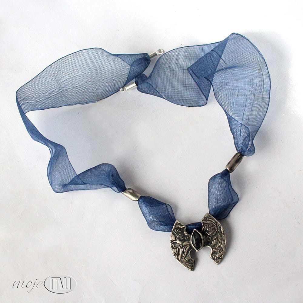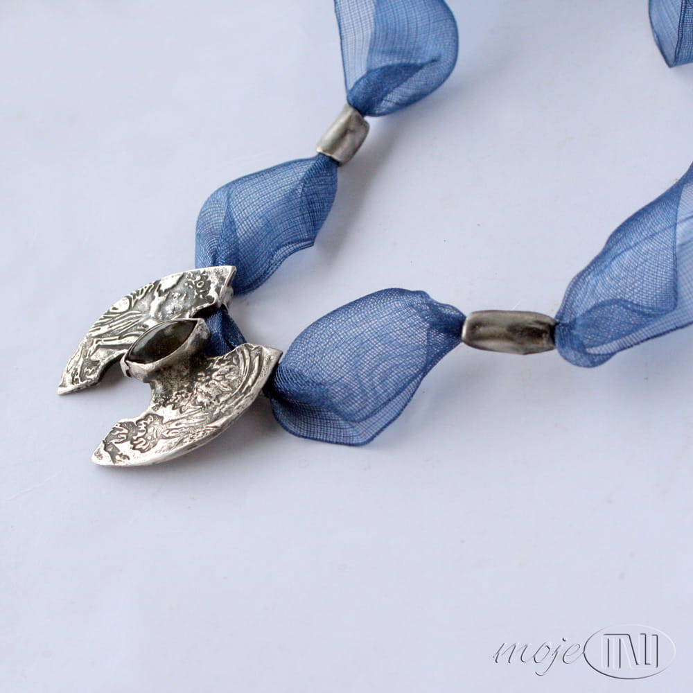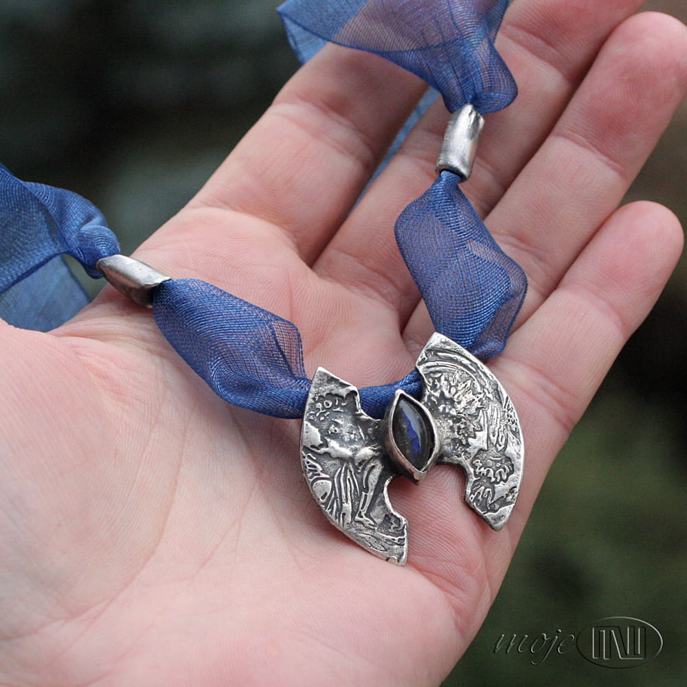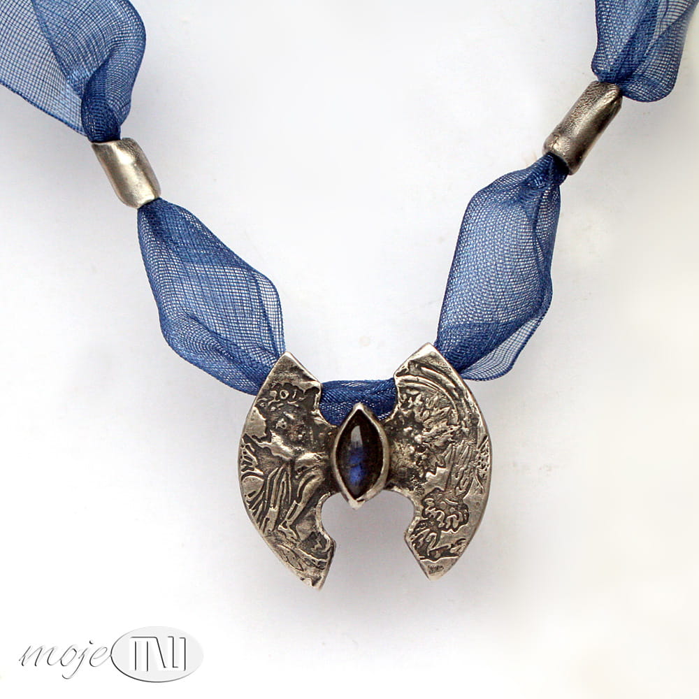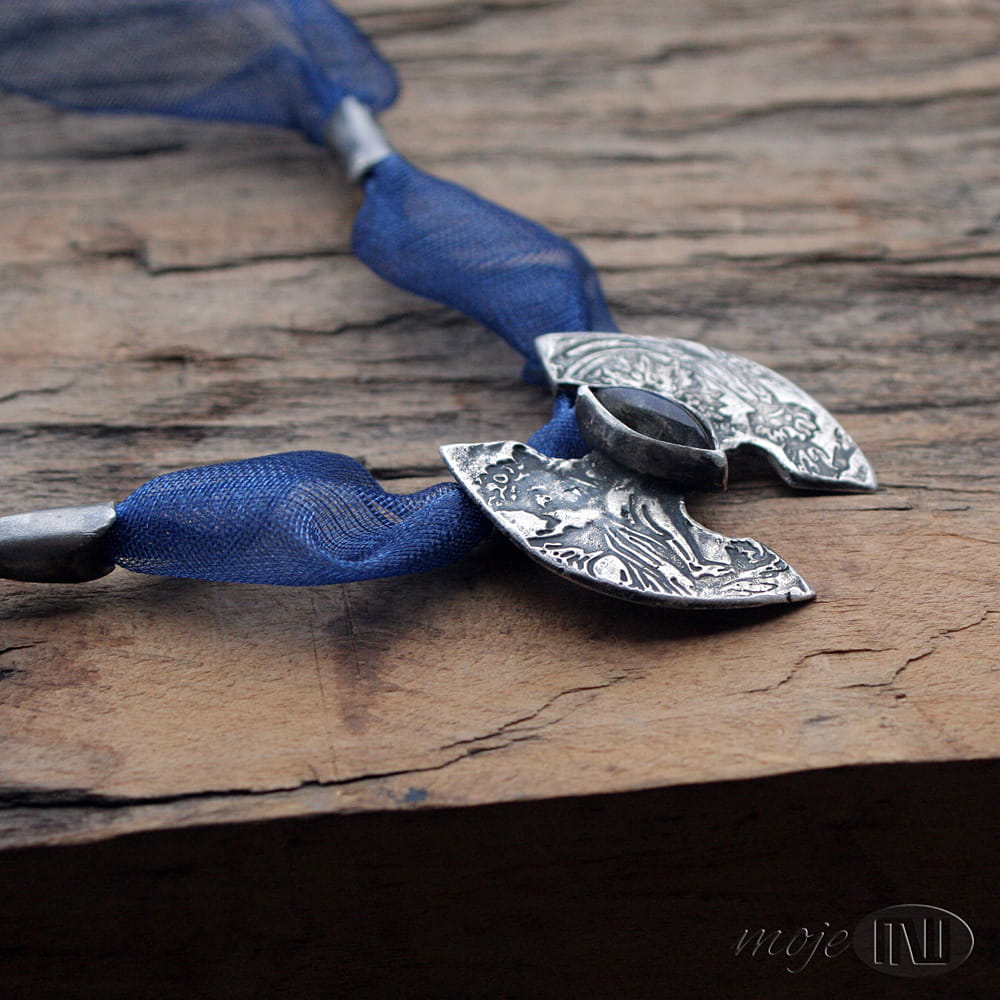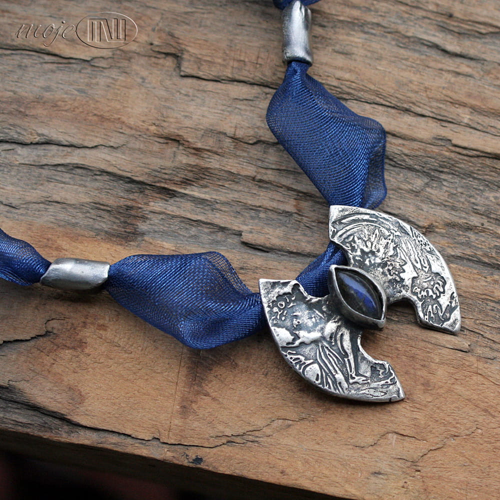 Naszyjnik ze srebra, z łezką labradorytu. W ręcznie formowanym srebrze wysokiej próby odciśnięty jest ozdobny deseń. Srebro jest oksydowane i przetarte dla wydobycia wzoru. W centralnej części osadzony jest labradoryt w ciemnoniebieskim kolorze. Bazą naszyjnika jest ozdobna wstążka w kolorze szafirowym. Dwa ozdobne elementy i zapięcie również są ze srebra.