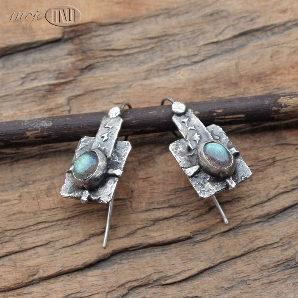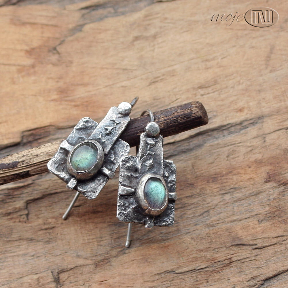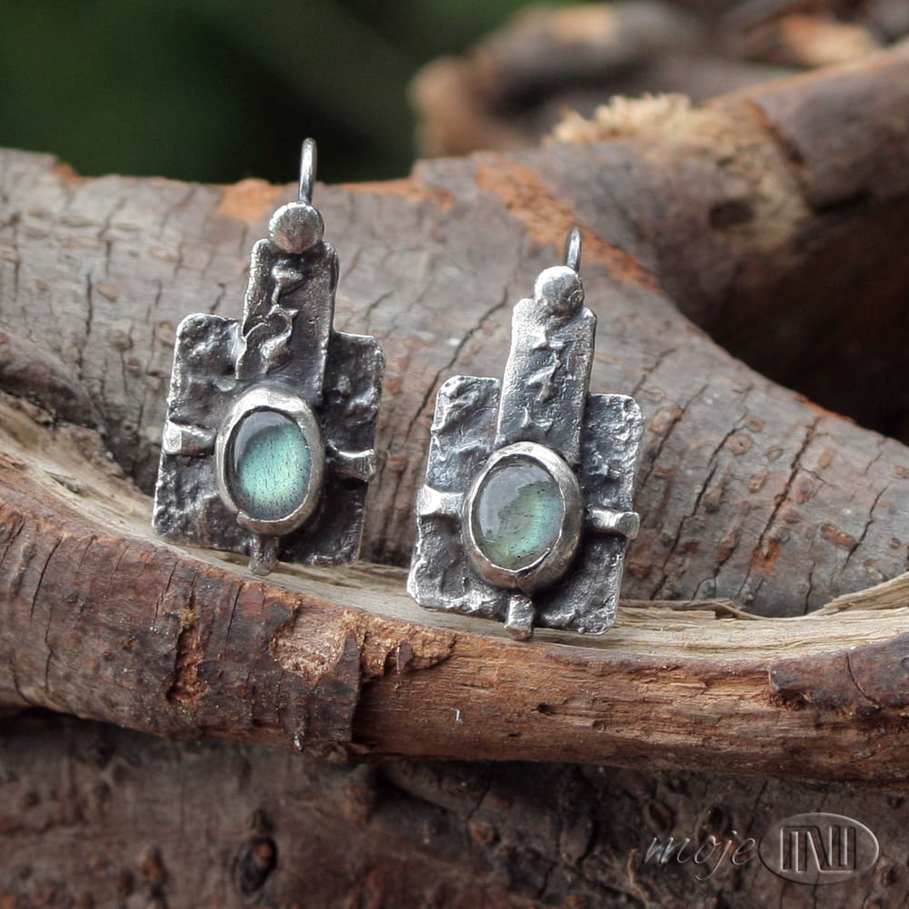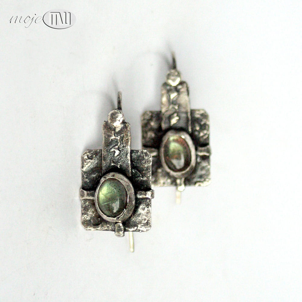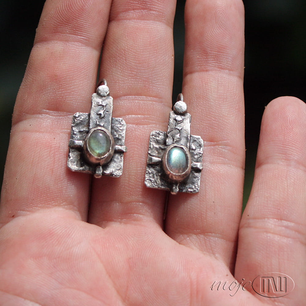 Kolczyki prawie w kwadracie... z owalnymi labradorytami. Zrobiłam je z ręcznie formowanego srebra próby min. 925. Kamienie mają szaro-oliwkowo-zielonkawą barwę ze złotymi poblaskami. Srebro jest oksydowane i częściowo polerowane dla wydobycia faktury.