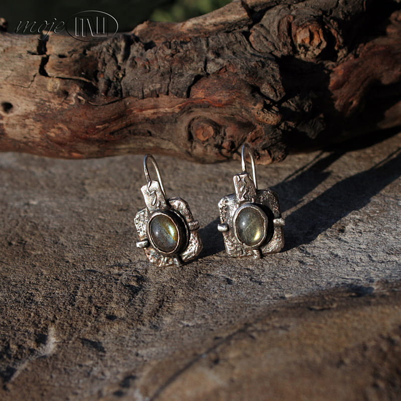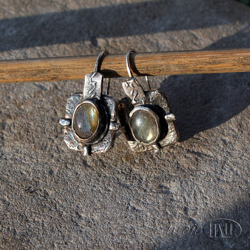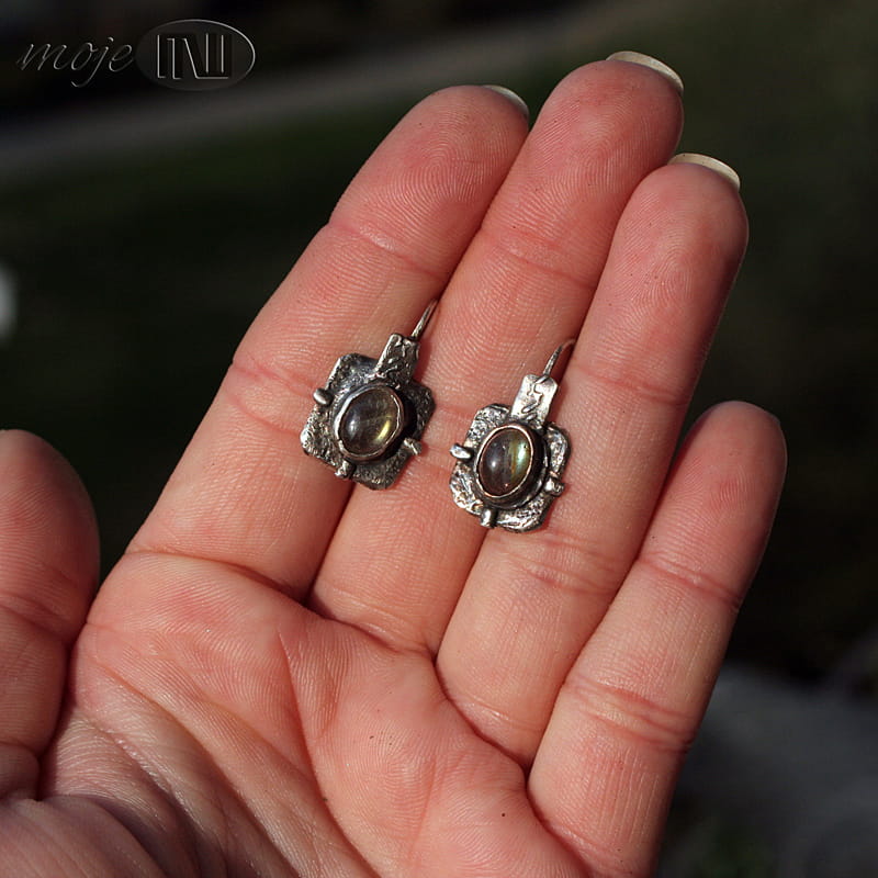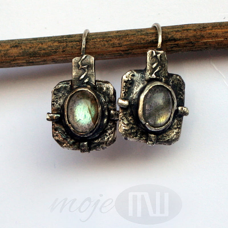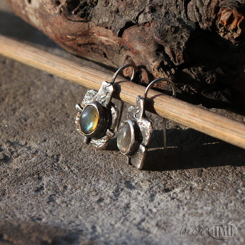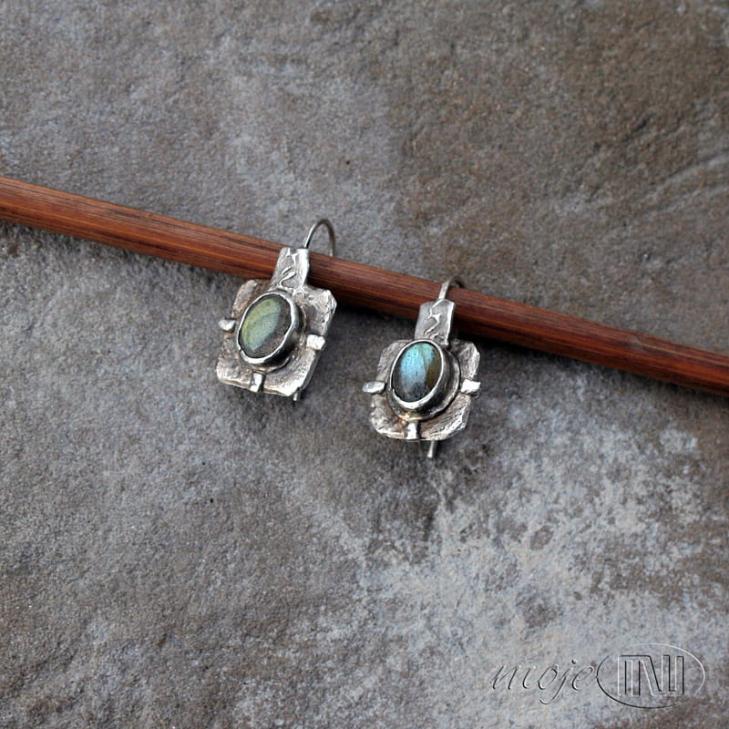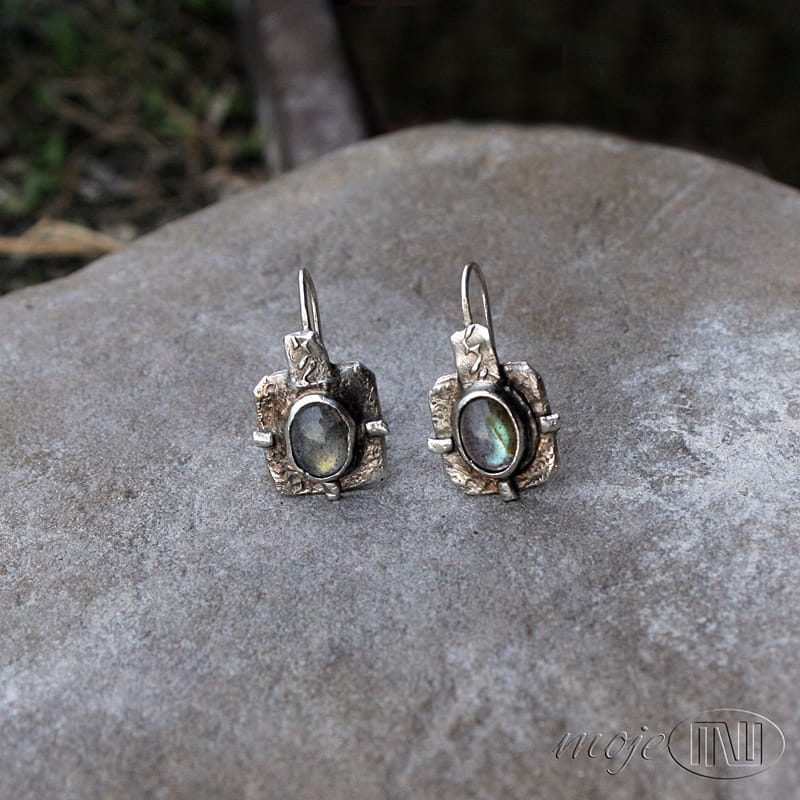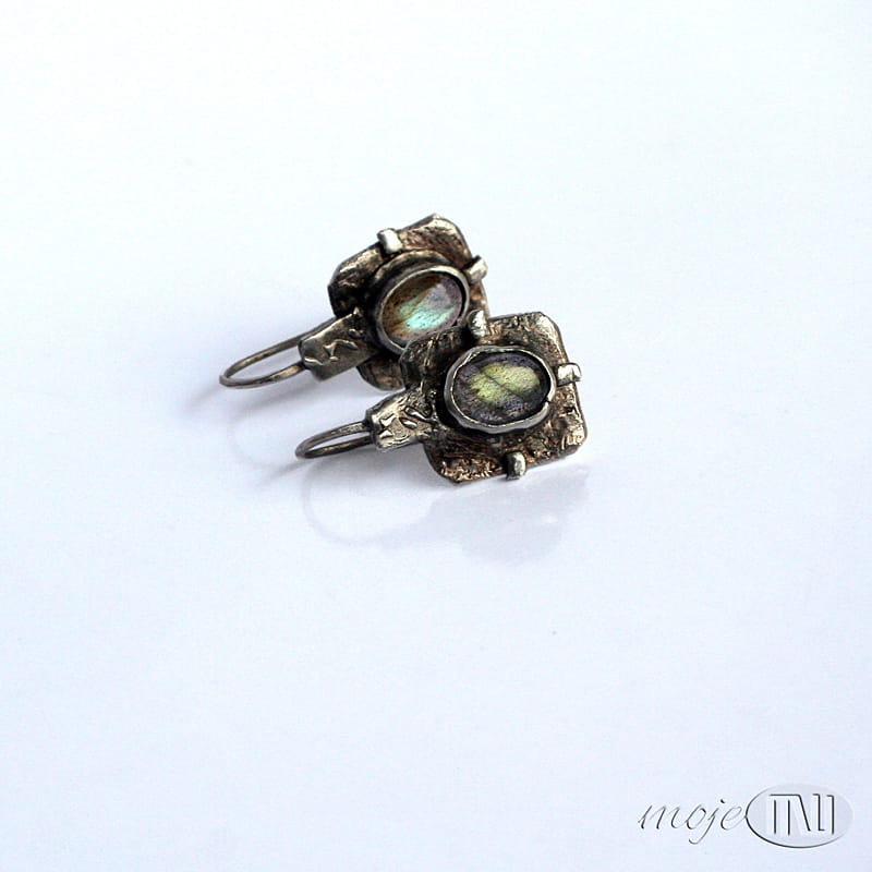 Kolczyki w kwadracie z owalnymi labradorytami. Zrobiłam je z ręcznie formowanego srebra próby min. 925. Kamienie mają szaro-oliwkowo-zielonkawą barwę ze złotymi poblaskami. Srebro jest oksydowane i częściowo polerowane dla wydobycia faktury.