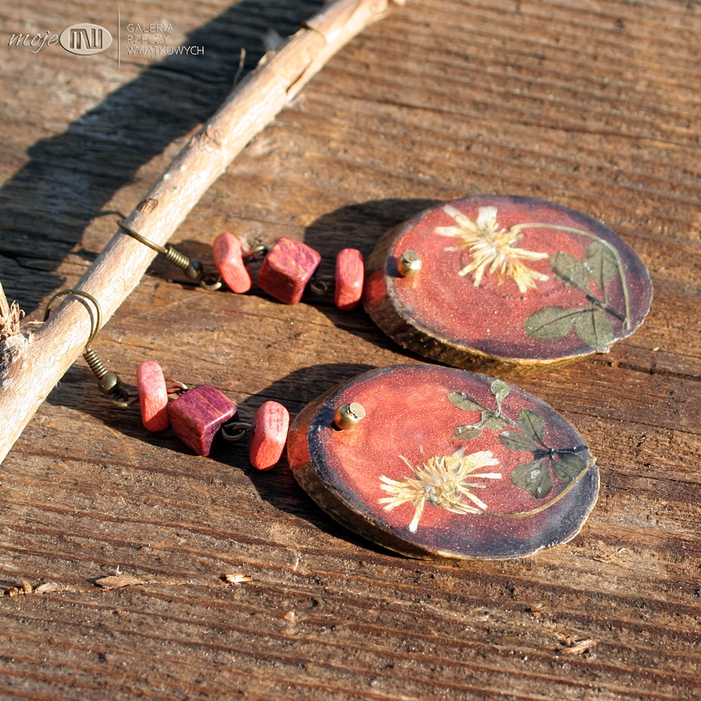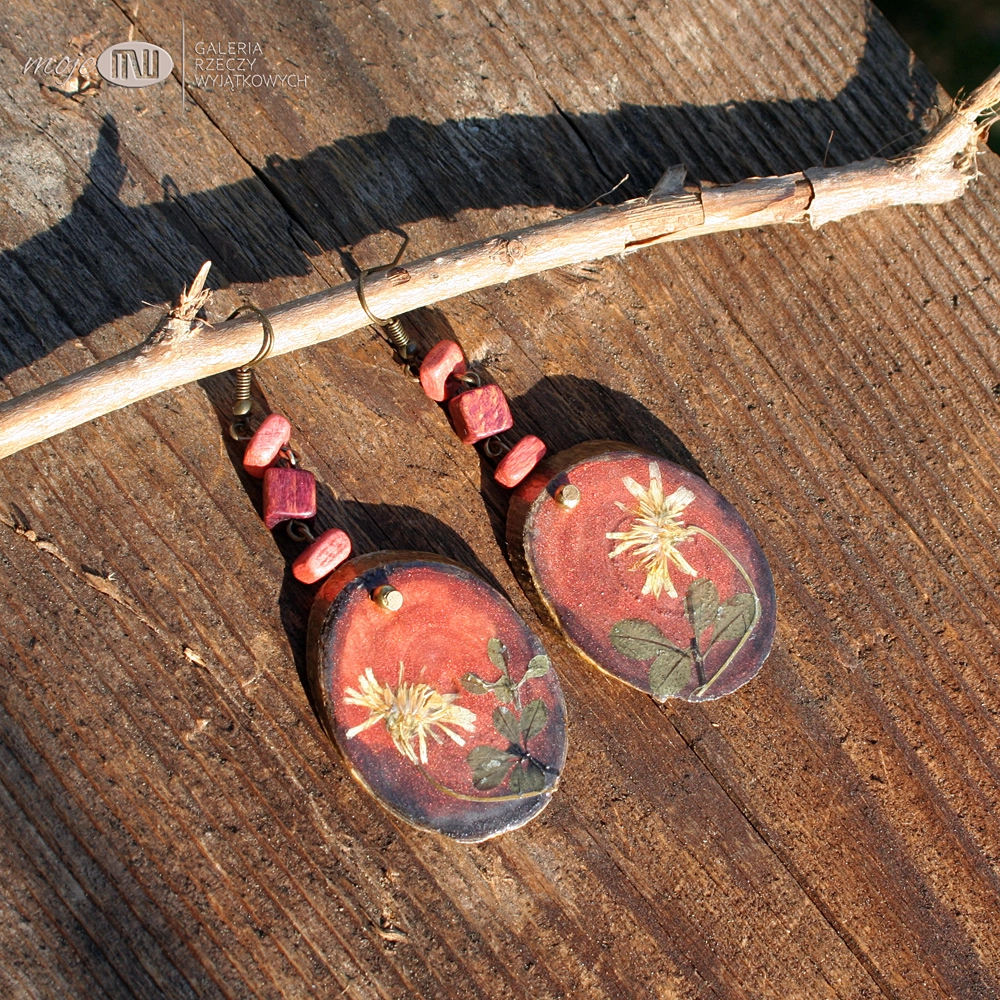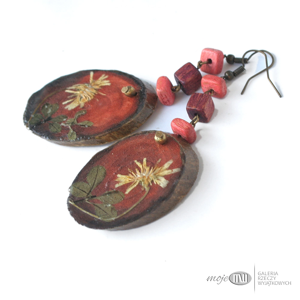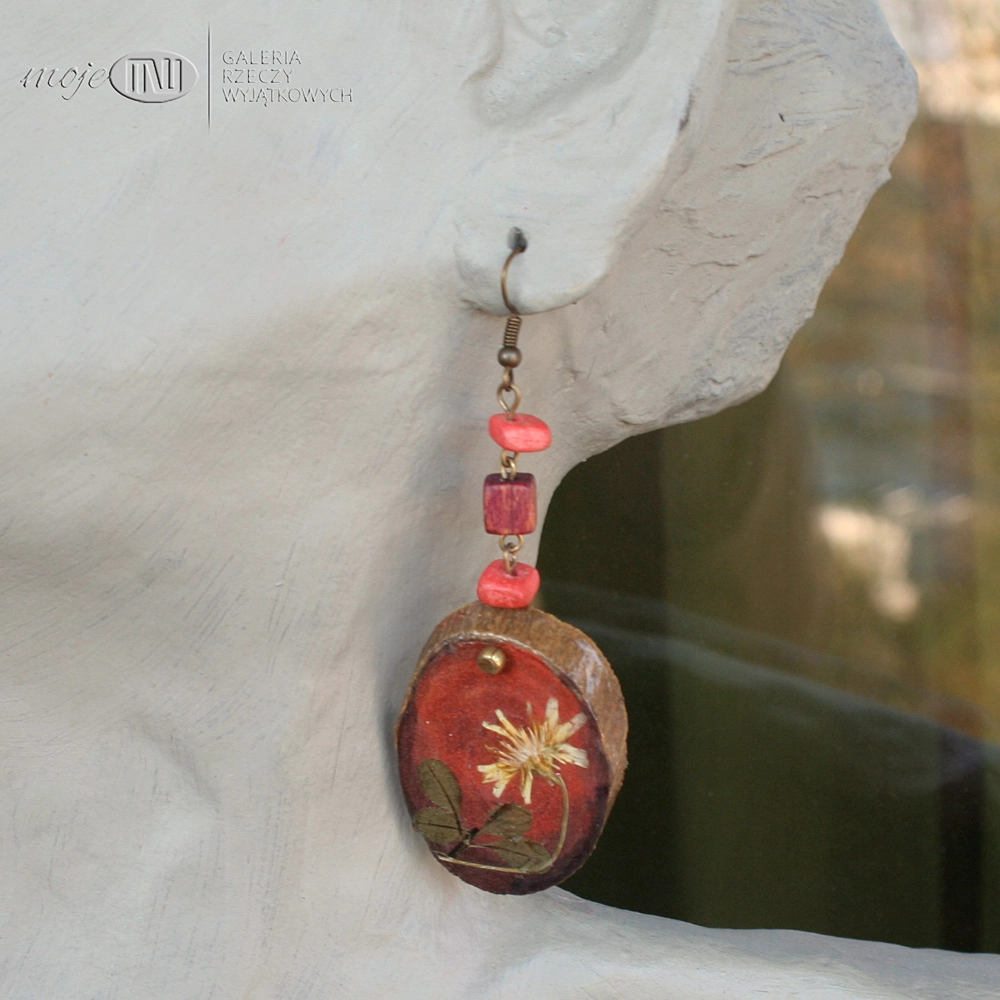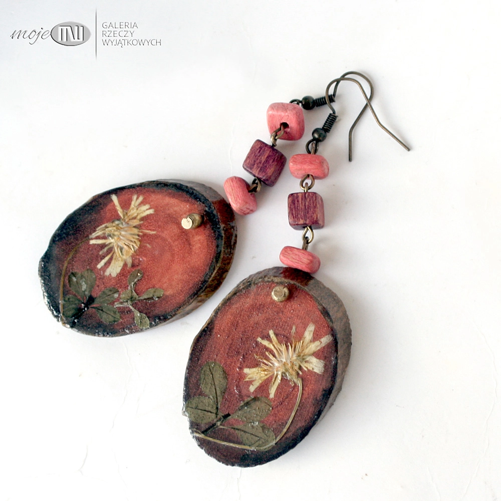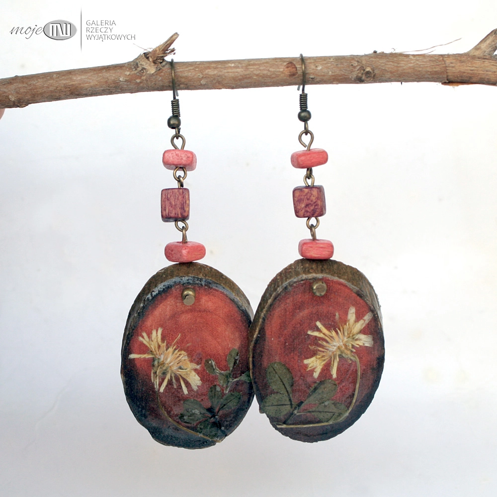 Kolczyki z drewnianego jesionowego plastra i suszonych polnych kwiatów oraz drewnianych koralików. Zabezpieczone bezbarwnym lakierem.