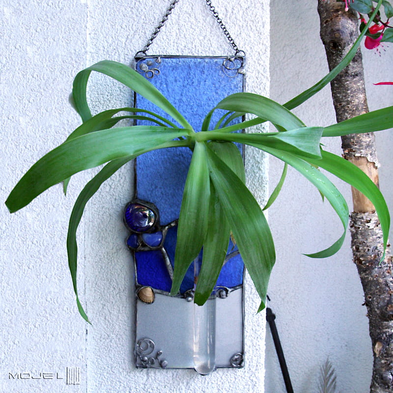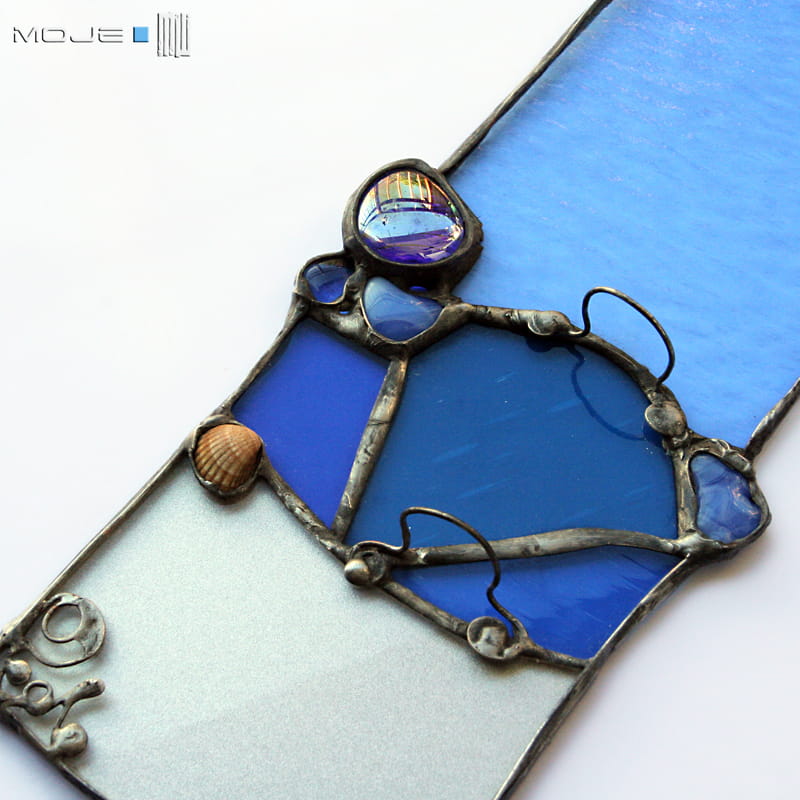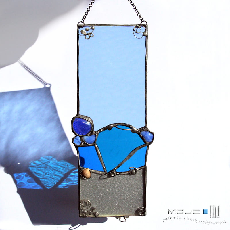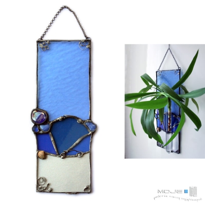 Witrażowy wiszący dekor, który może być pięknym wspomnieniem z wakacji a także... wazonikiem. Zrobiłam go z witrażowego szkła w odcieniach błękitu. Dodatkowym elementem ozdobnym są szklane kaboszony oraz prawdziwa muszelka. Całość oprawiona i wykończona jest miedzią - cynowaną, patynowaną i przecieraną. Wiszący dekor ma uchwyty, w które należy wsunąć podłużny szklany "wazonik" z pojedynczym żywym kwiatem, zieloną laską bambusa, lub suszonym kwiatem. Pięknie wygląda na ścianie lub w oknie i stanowi niebanalny element dekoracyjny.