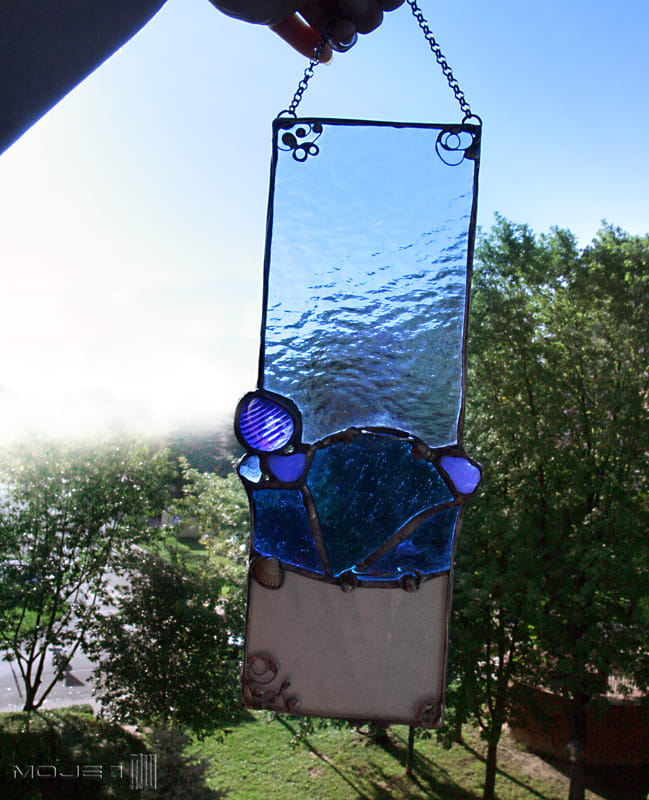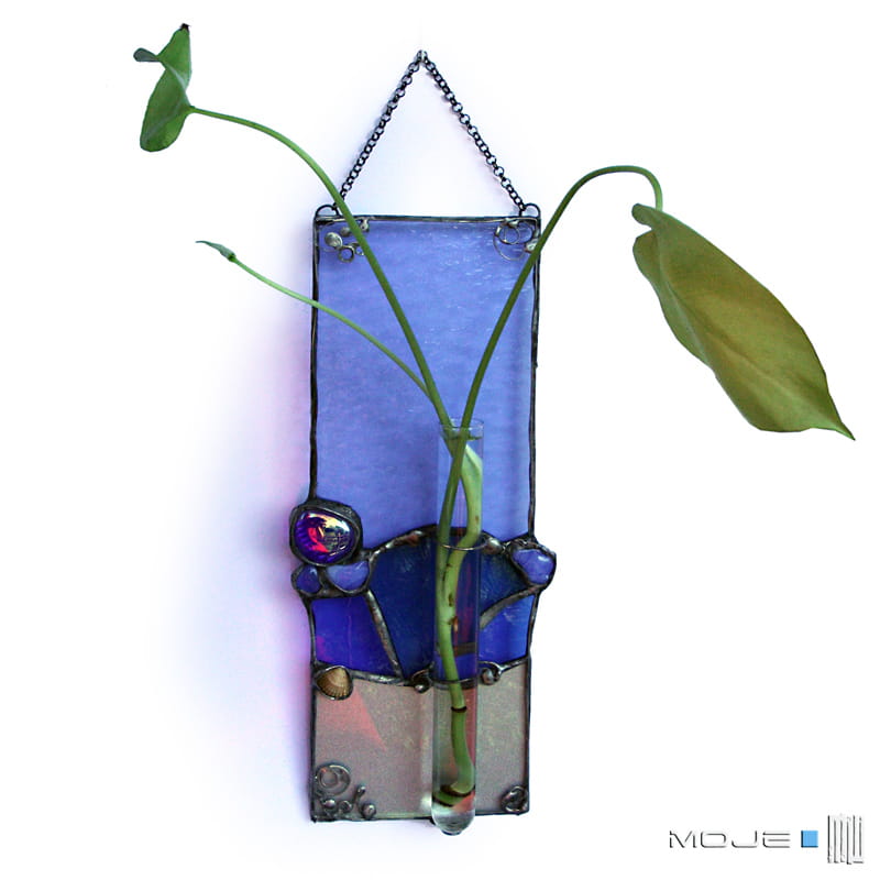 Witrażowy wiszący dekor, który może być pięknym wspomnieniem z wakacji a także... wazonikiem.