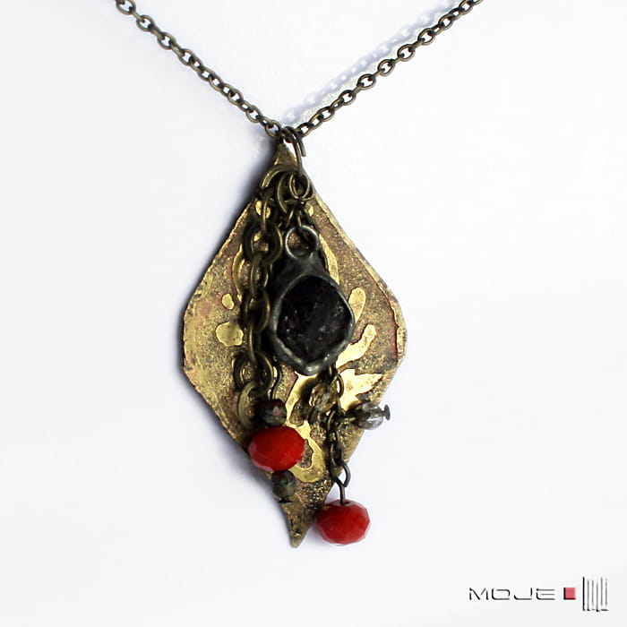 Wisior z liściem z mosiądzu, do którego dowiesiłam bryłkę surowego granatu, fasetowane mocno czerwone szklane korale i inne elementy. Na liściu wytrawiłam florystyczne wzory, co nadaje mu lekkości.