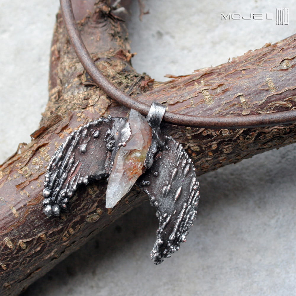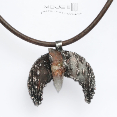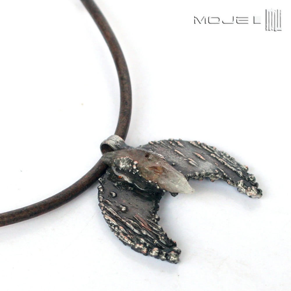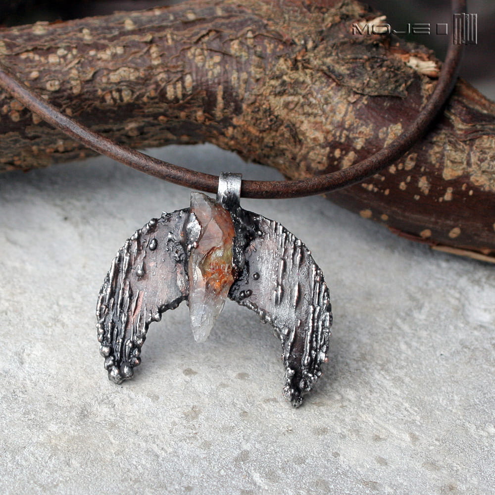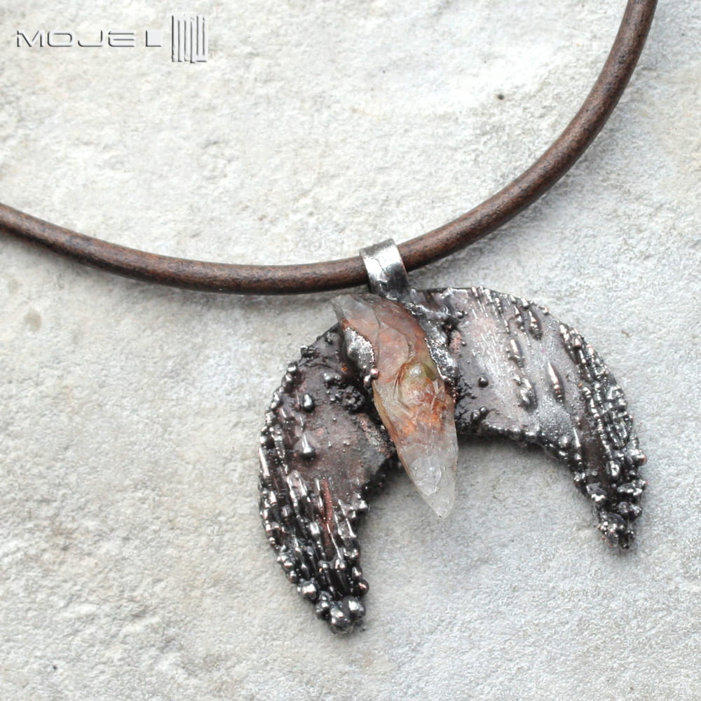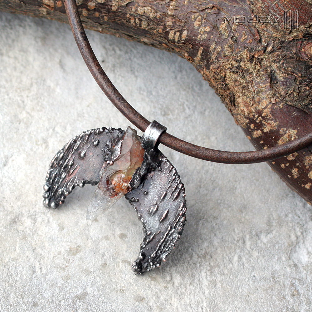 Księżycowy wisior o surowym, rustykalnym, archaicznym wyglądzie. Zrobiłam go z miedzi poddanej elektroformowaniu, stąd nieregularna i ciekawa faktura. Miedź pokryta jest cyną, patynowana i przecierana. W centralnej części jest bryłka surowego cytrynu. Wisior jest zawieszony na skórzanym rzemieniu vintage w kolorze spranego brązu.