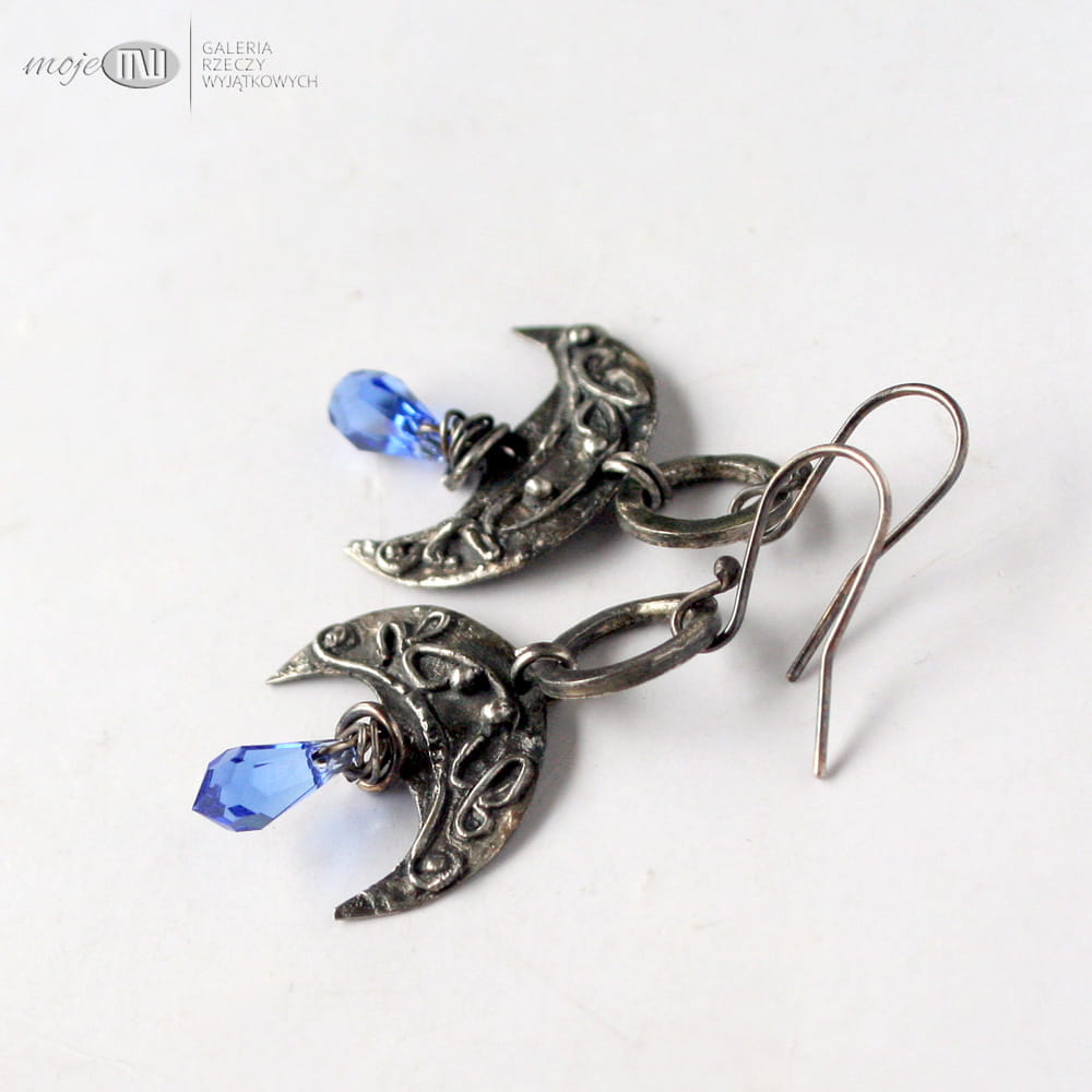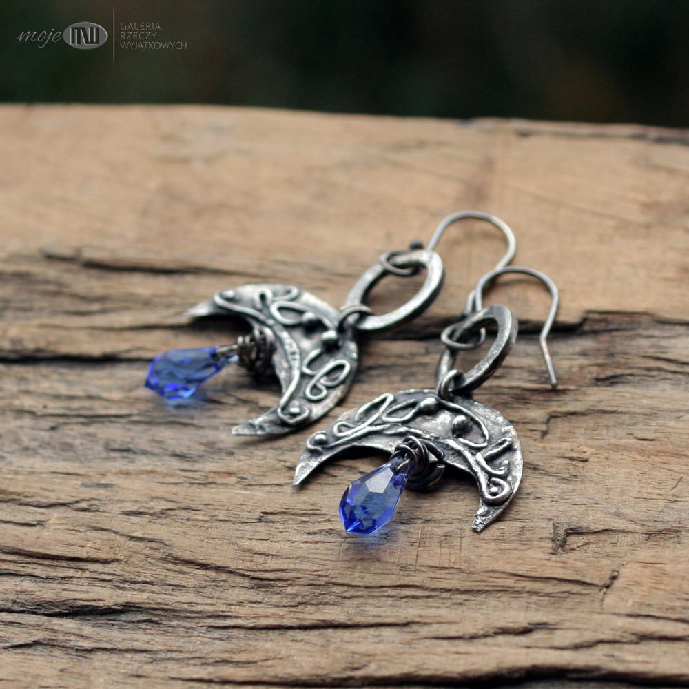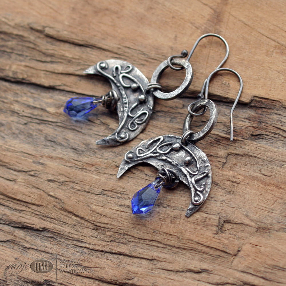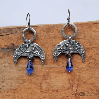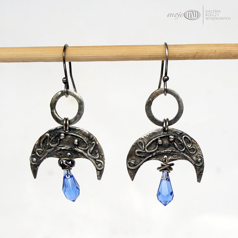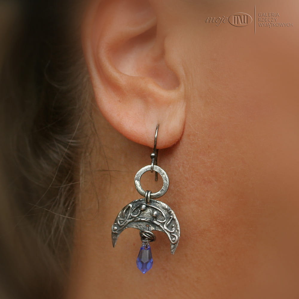Księżycowe kolczyki - motyw lunuli - księżyca, związany nierozerwalnie z mitologią słowiańską. Zrobiłam je z ręcznie formowanego srebra, oksydowanego i przetartego dla wydobycia nieco nieregularnych zawijasów. Zdobią je fasetowane krople Swarovskiego w błękitnym kolorze. Proste bigle ze srebrnego drutu.
