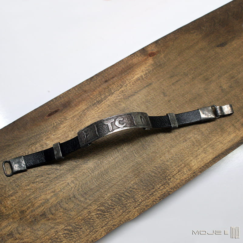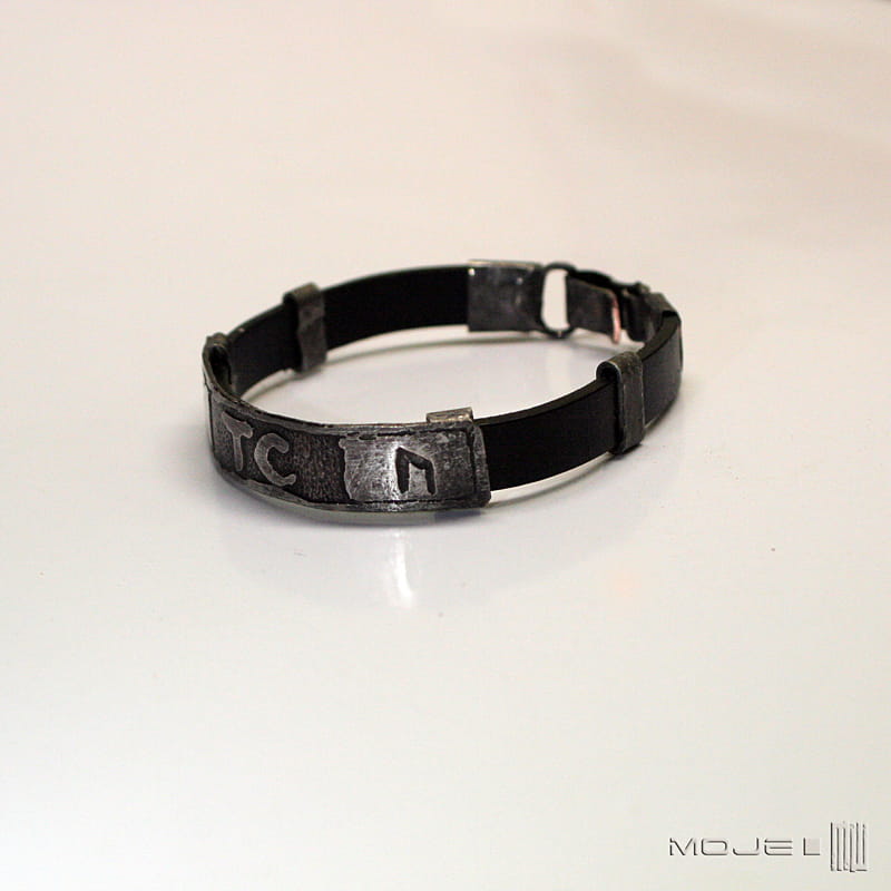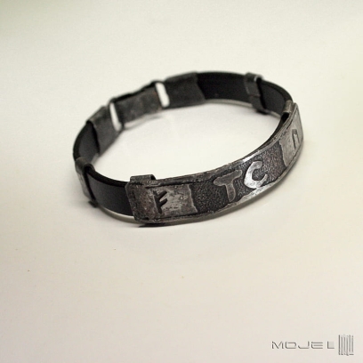 Zrobiona jest z miedzianej blachy, w której wytrawiłam wybrane runy oraz inicjały. Miedź jest cynowana, patynowana i przecierana. Bazę stanowi płaski skórzany rzemień w kolorze czarnym o szer. 10 mm. Elementy ozdobne i zapięcie również zrobione są z cynowanej miedzi.