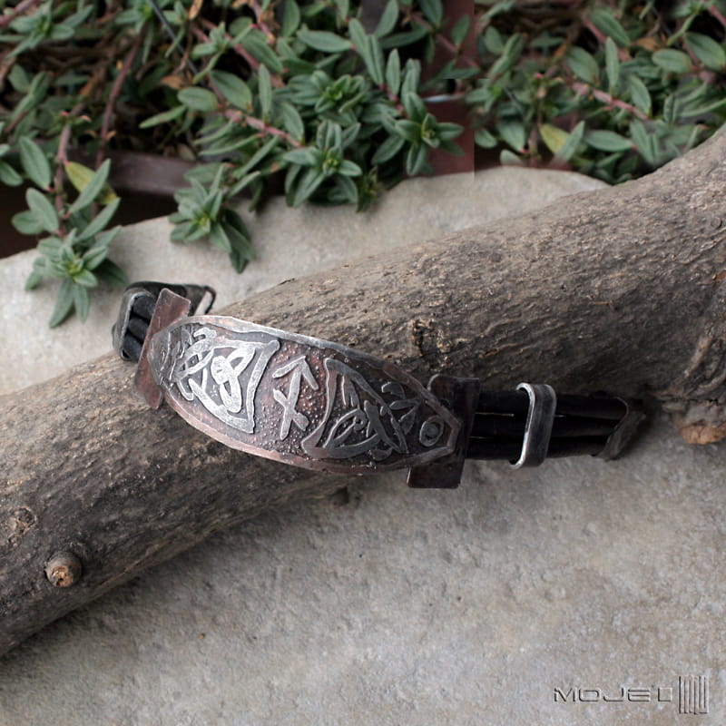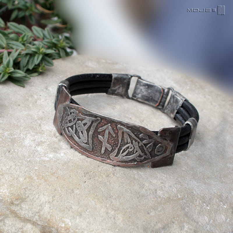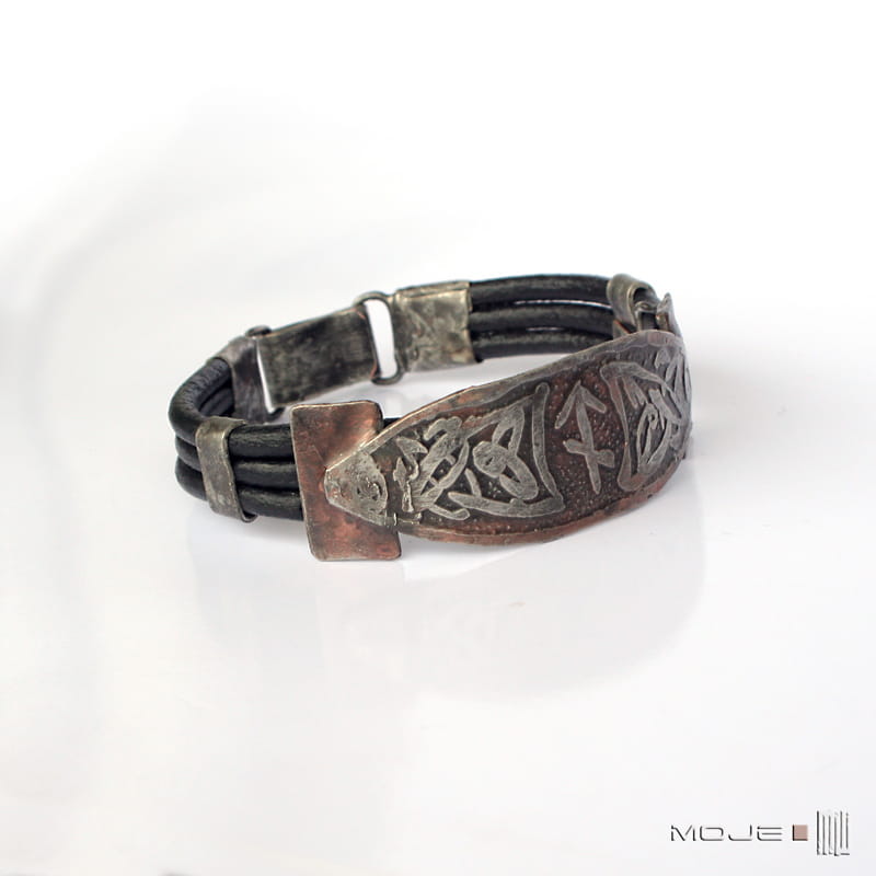 Manela z bindruną. Zrobiona jest z miedzi trawionej, cynowanej, patynowanej i przecieranej oraz skórzanych rzemieni w kolorze czarnym, okrągłych gr. 4 mm. Elementy ozdobne i zapięcie również zrobione są z cynowanej miedzi.