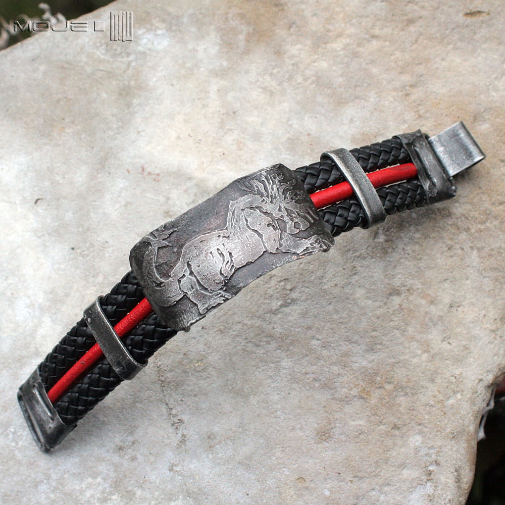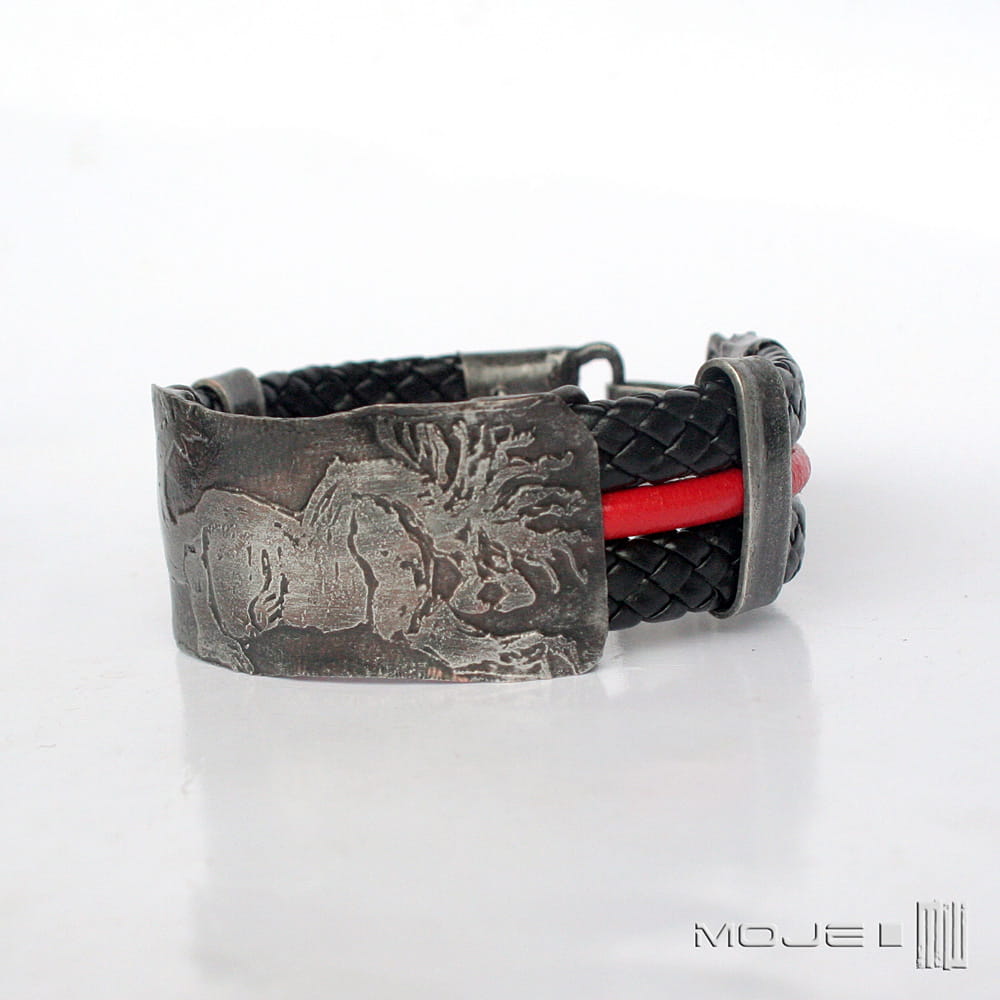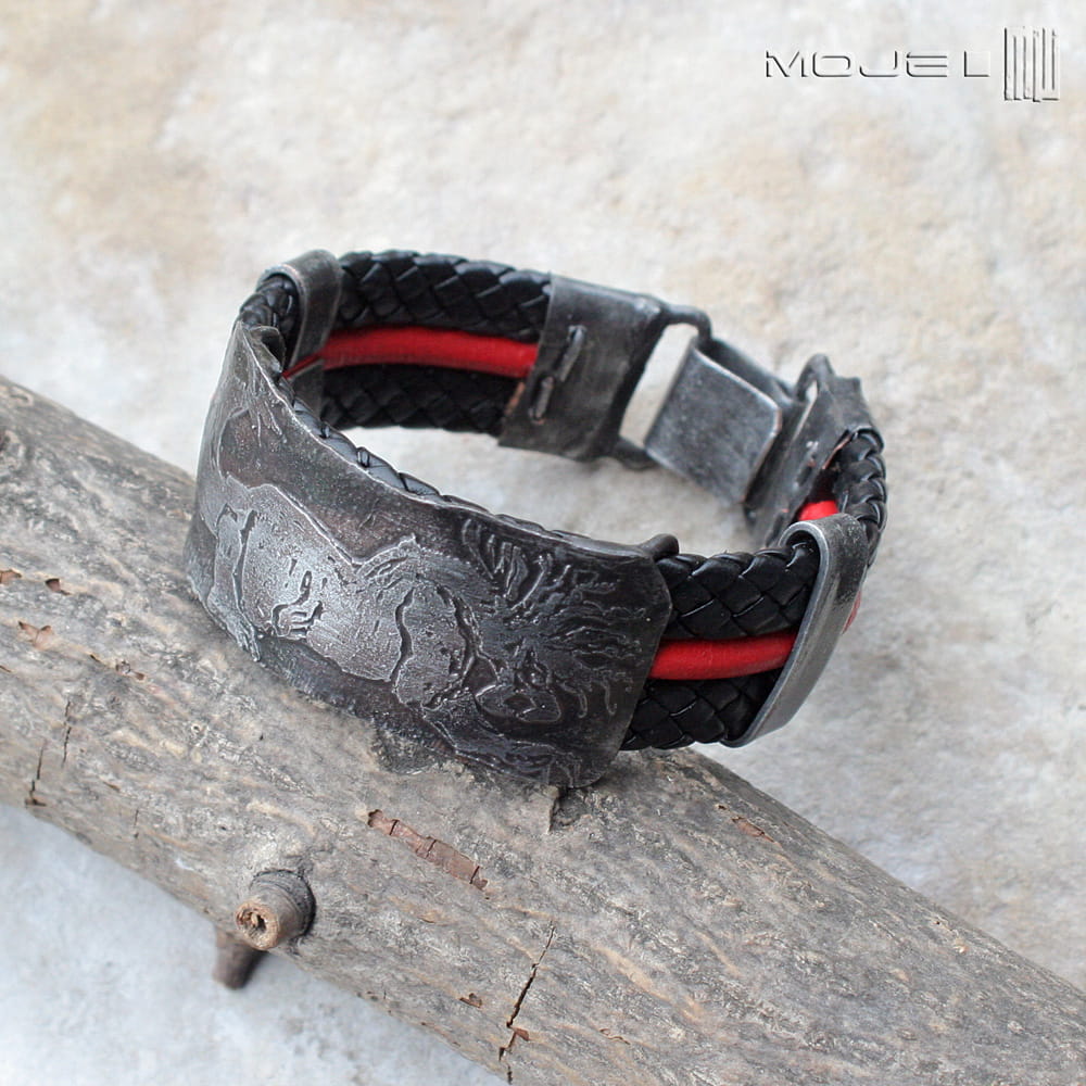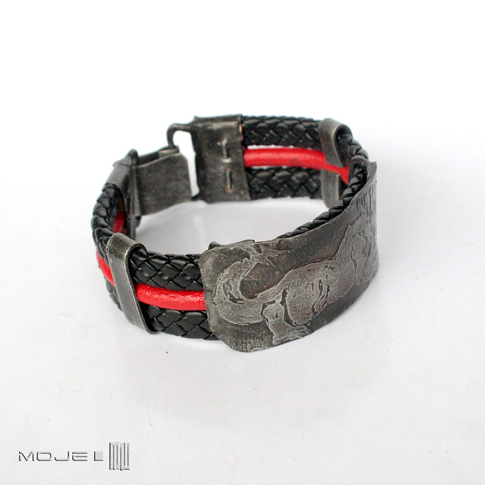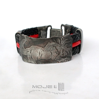 Bransoleta, którą zrobiłam z trawionej miedzianej blachy - cynowanej, patynowanej, przecieranej i drapanej. Głównym elementem jest stylizowany wizerunek mitycznego stworzenia, być może Behemota. Bazą maneli są rzemienie - czarna plecionka 10 mm oraz czerwony okrągły rzemyk 4 mm.