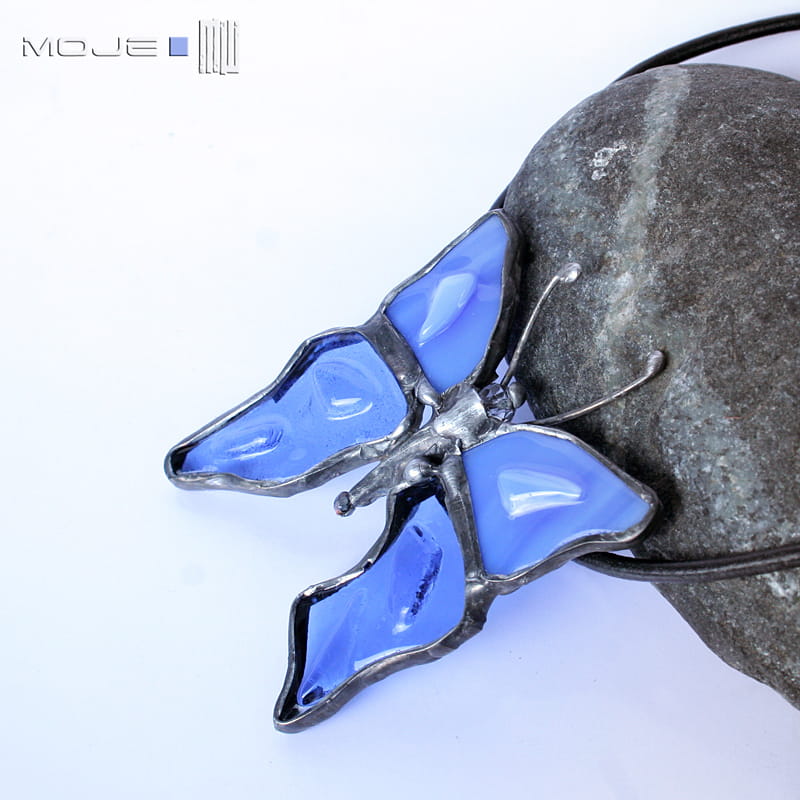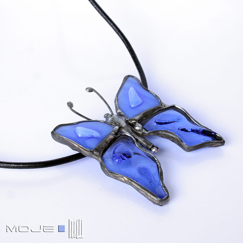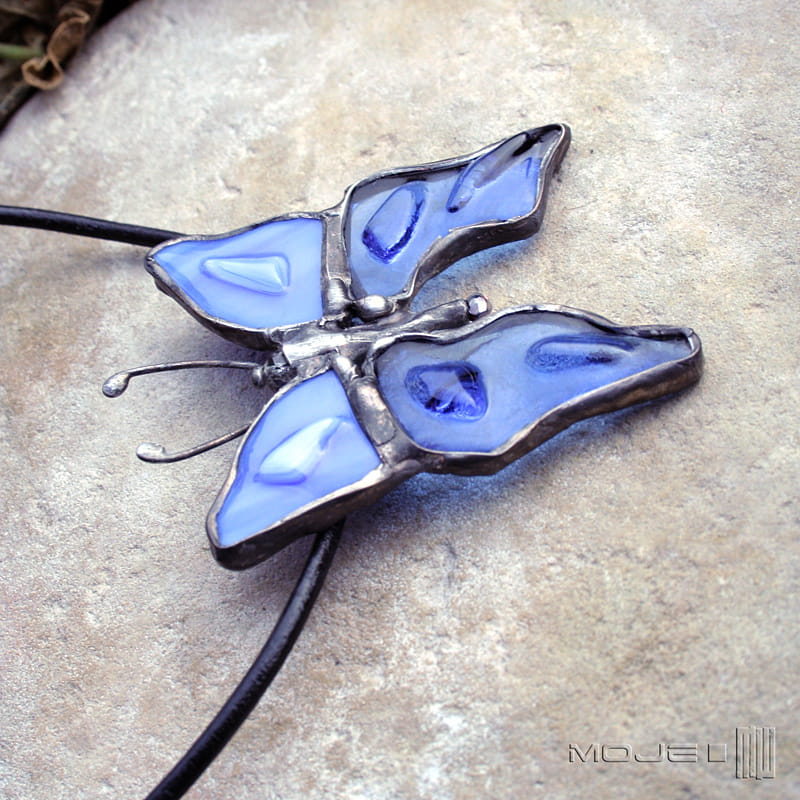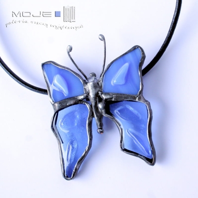 Niebieski motyl - dość duży wisior, który wytopiłam ze szkła mlecznego i przejrzystego w odcieniach błękitu w temperaturze kilkuset stopni metodą fusingu.