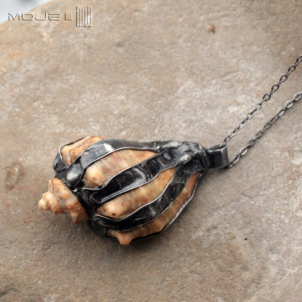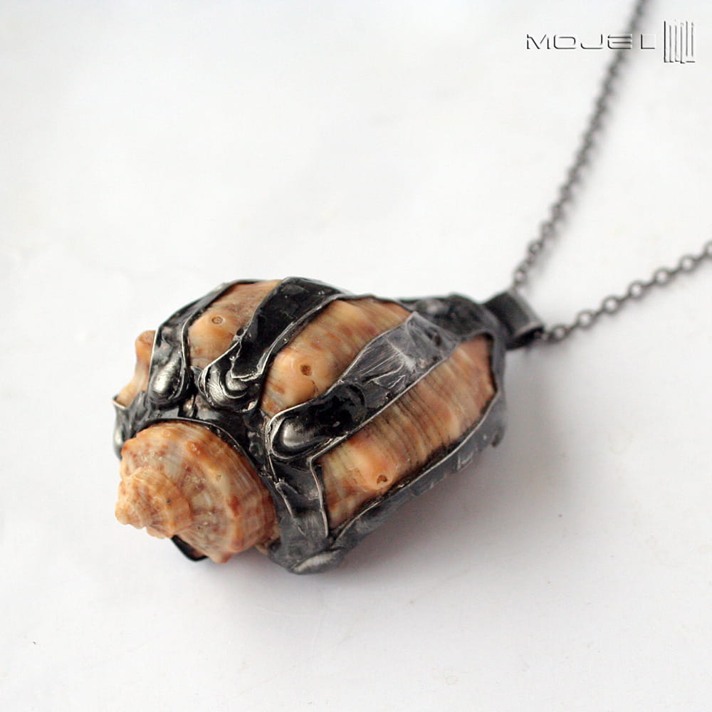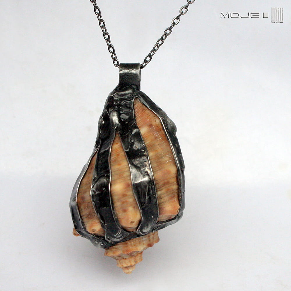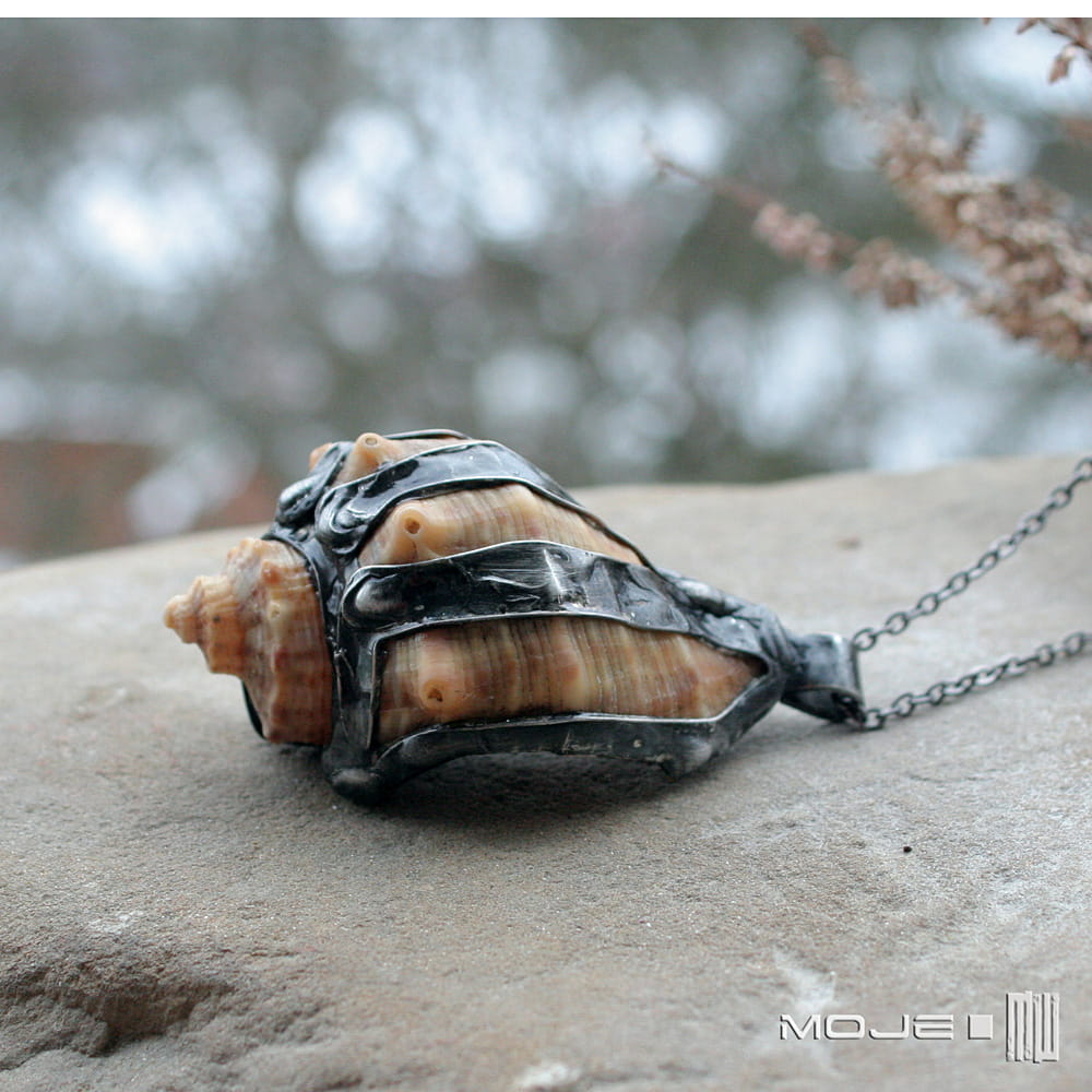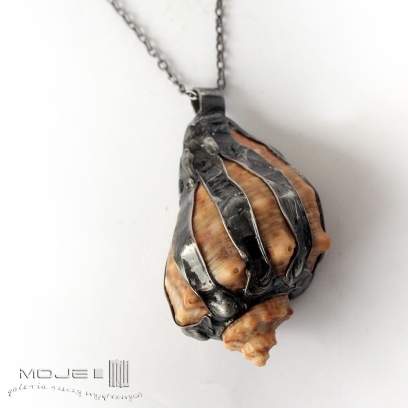 Prawdziwa morska muszla, którą "uzbroiłam" w miedziano-cynową oprawę, przez co wygląda trochę drapieżnie. Metalowe elementy są patynowane na kolor grafitowy, potem lekko przetarte. Muszla zawieszona jest na metalowym łańcuszku w kolorze grafitowym. Zazwyczaj dodaję łańcuszek o długości ok. 60-70 cm, ale klient może podać długość, która go interesuje.