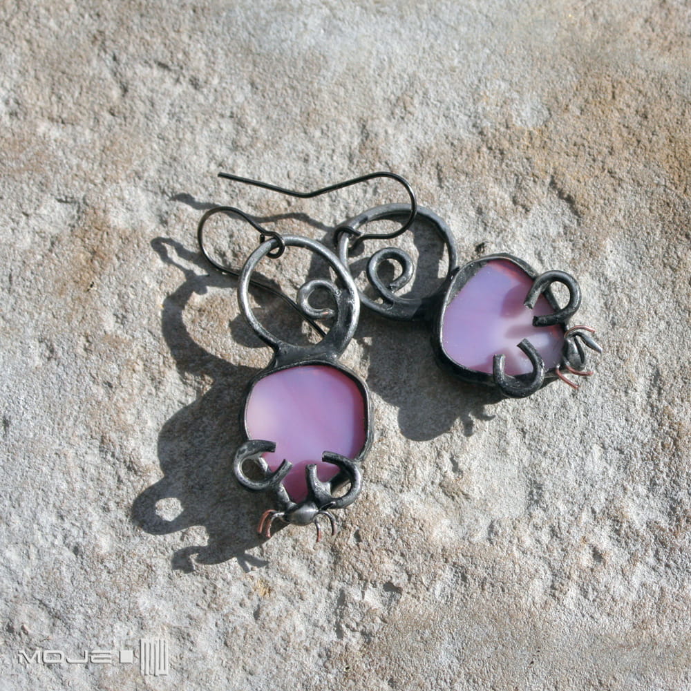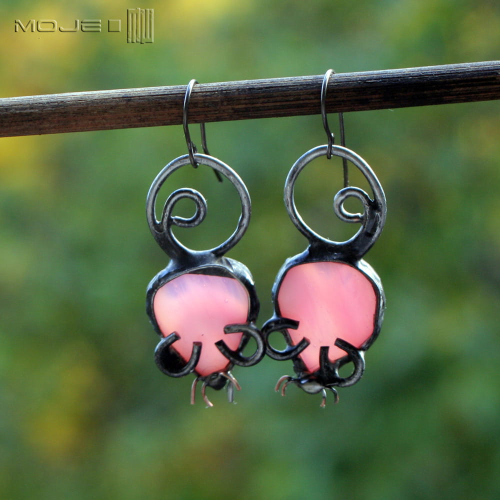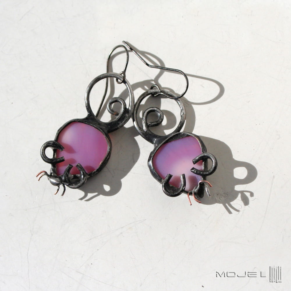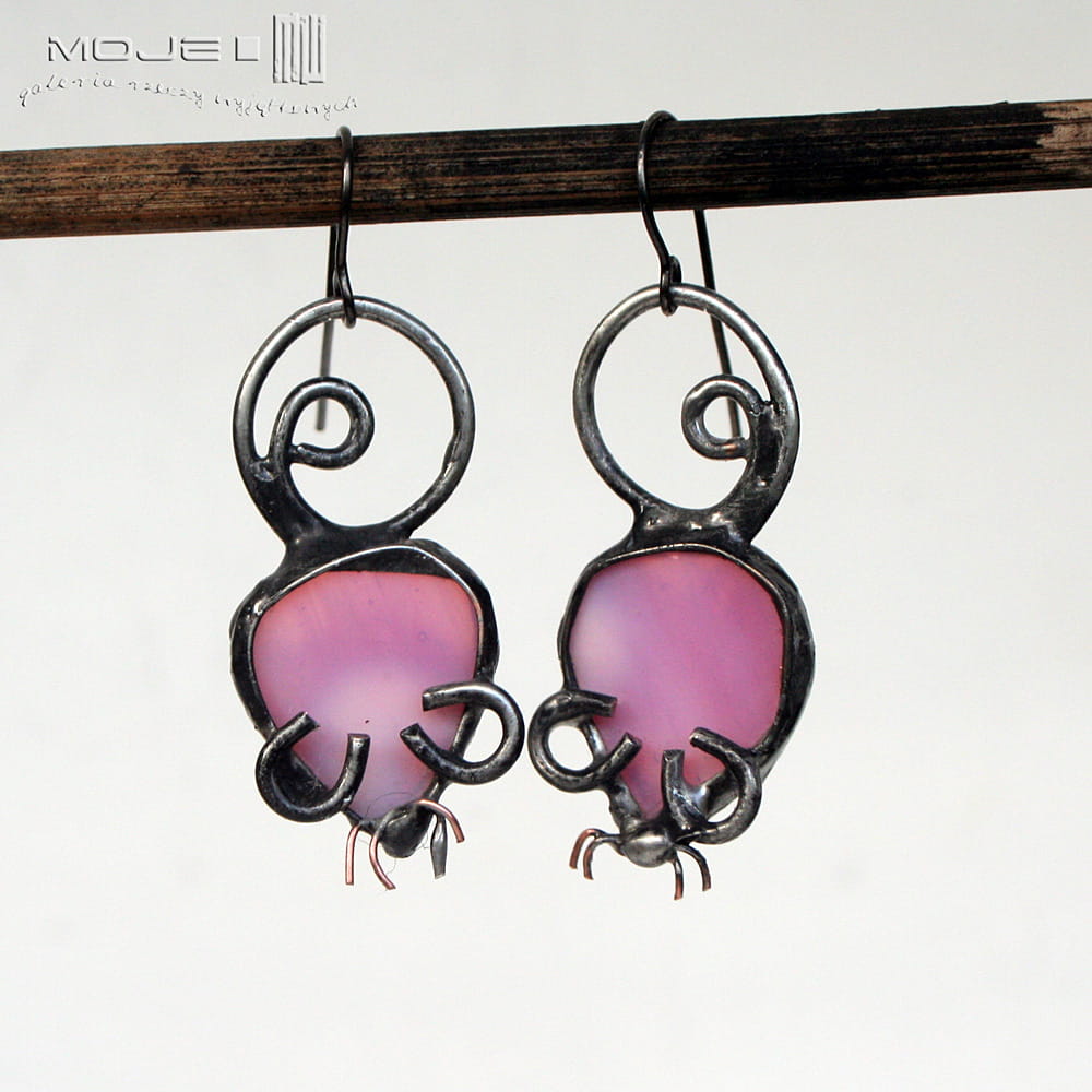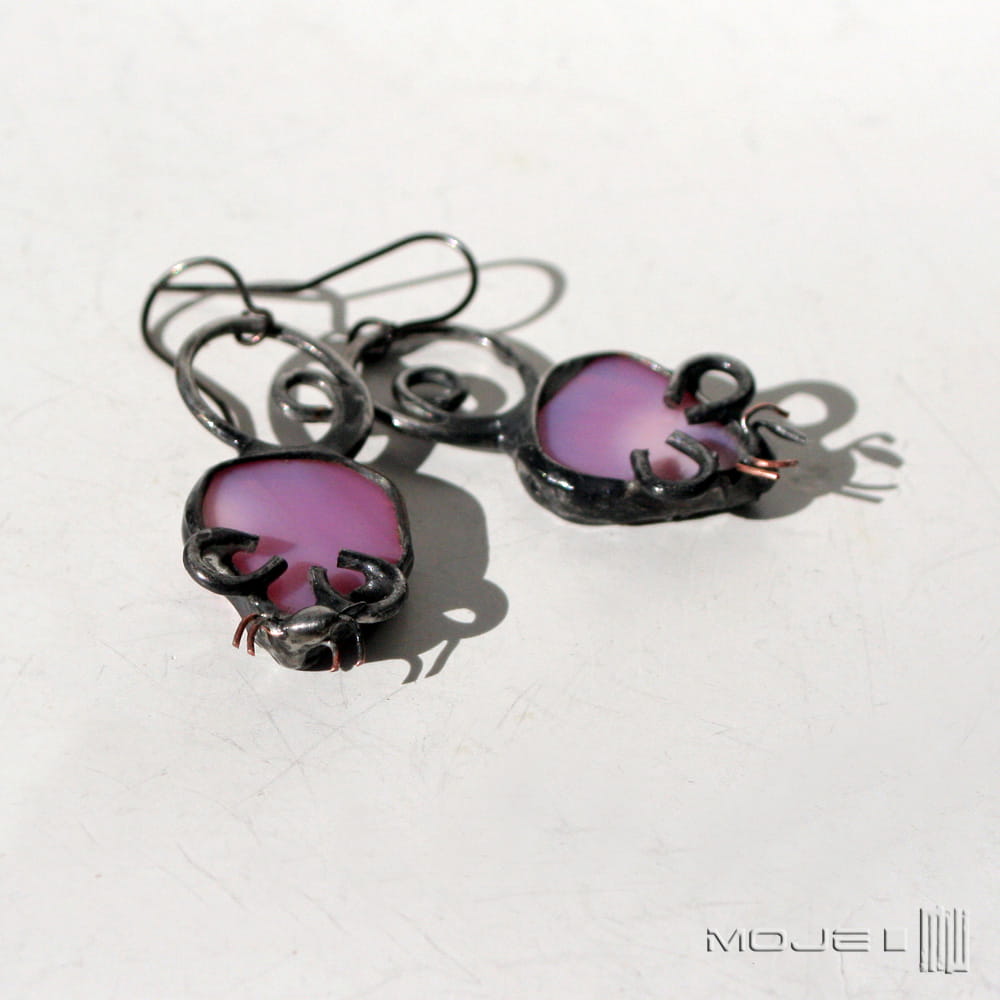 Myszki - kolczyki wykonane przeze mnie z różowego szkła.
