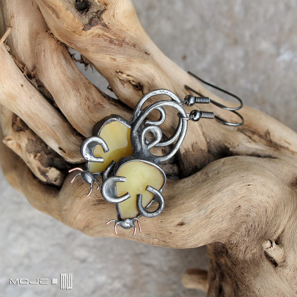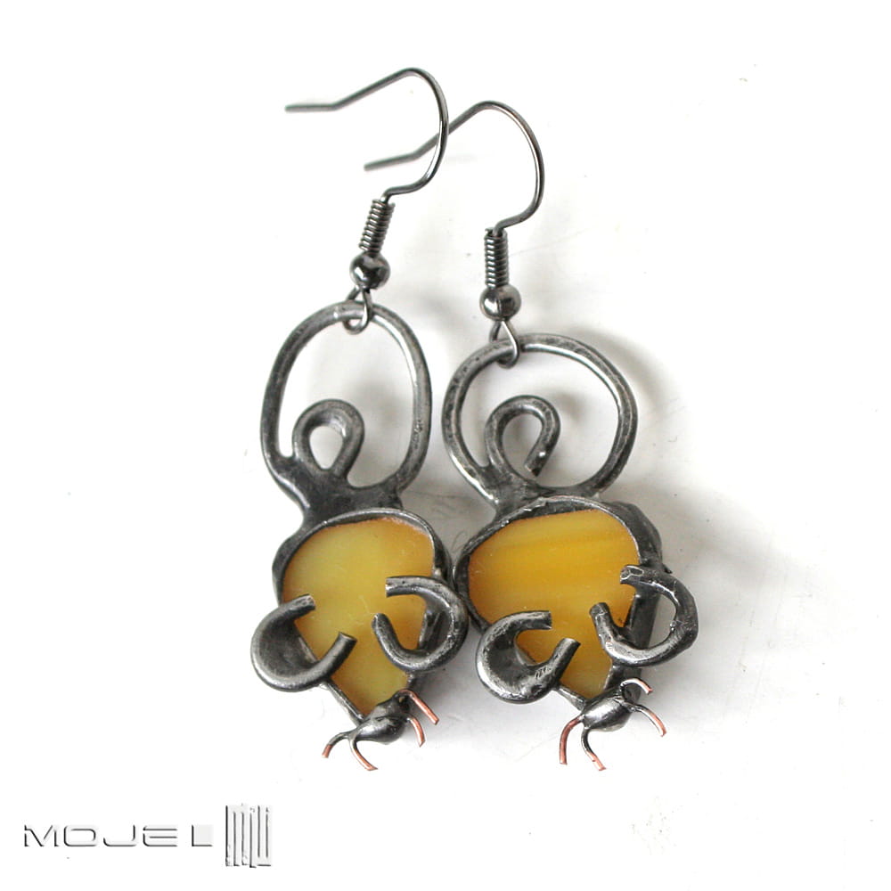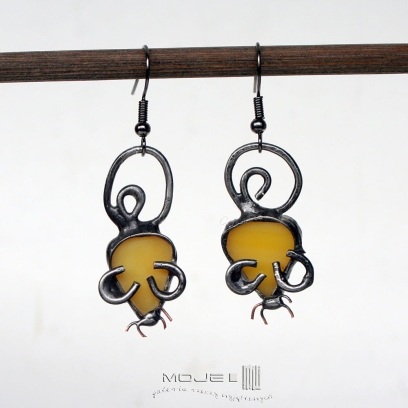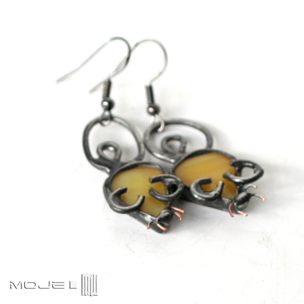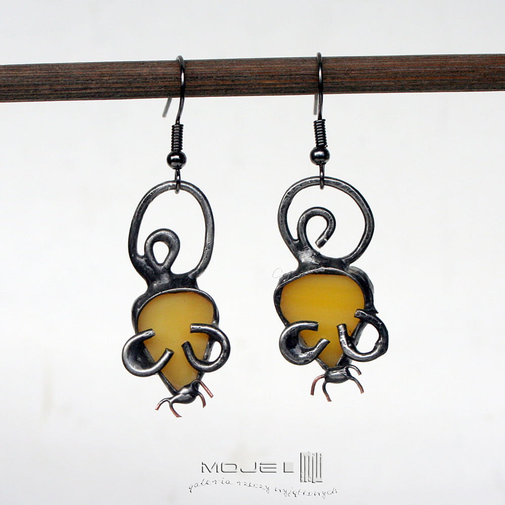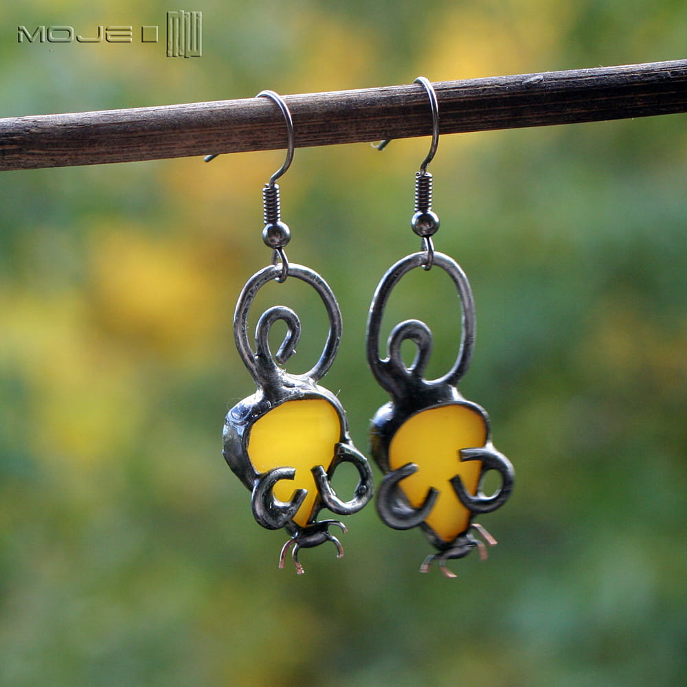 Myszki - kolczyki wykonane przeze mnie z żółtego szkła.