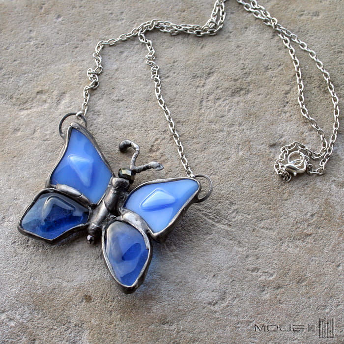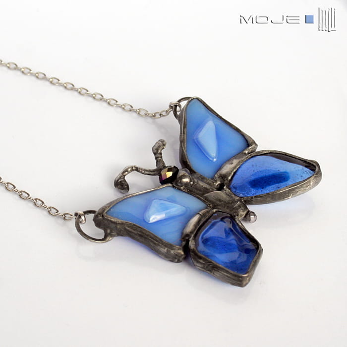 Niebieski motyl - wisior, który wytopiłam ze szkła mlecznego i przejrzystego w odcieniach błękitu w temperaturze kilkuset stopni metodą fusingu.