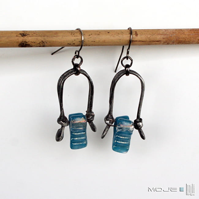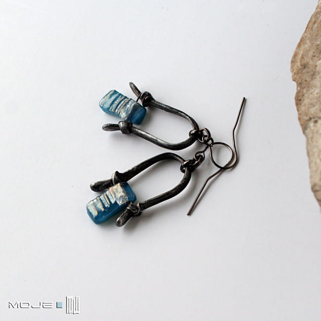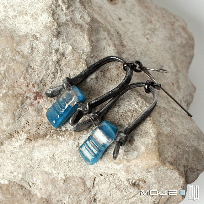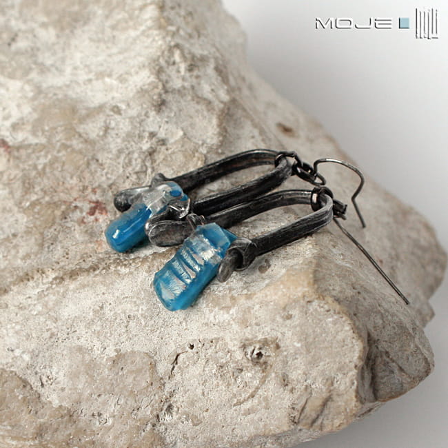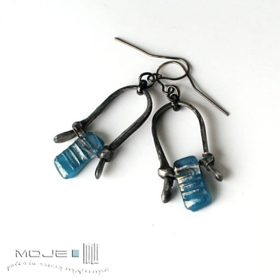 Łukowate kolczyki ze szklanymi prostokątnymi elementami wytopionymi ze szkła dichroicznego w kolorze turkusowym. Powierzchnia szkła delikatnie połyskują perłowo. Proste, surowe i rustykalne, wykonane są z miedzi - cynowanej, patynowanej i przecieranej. Metalowe bigle.