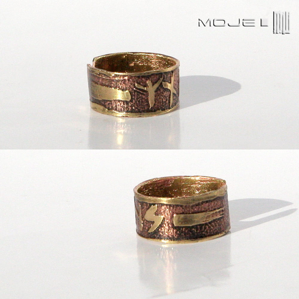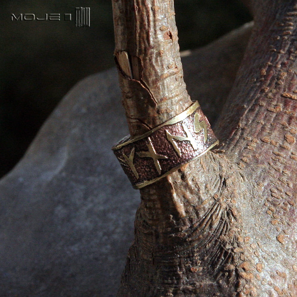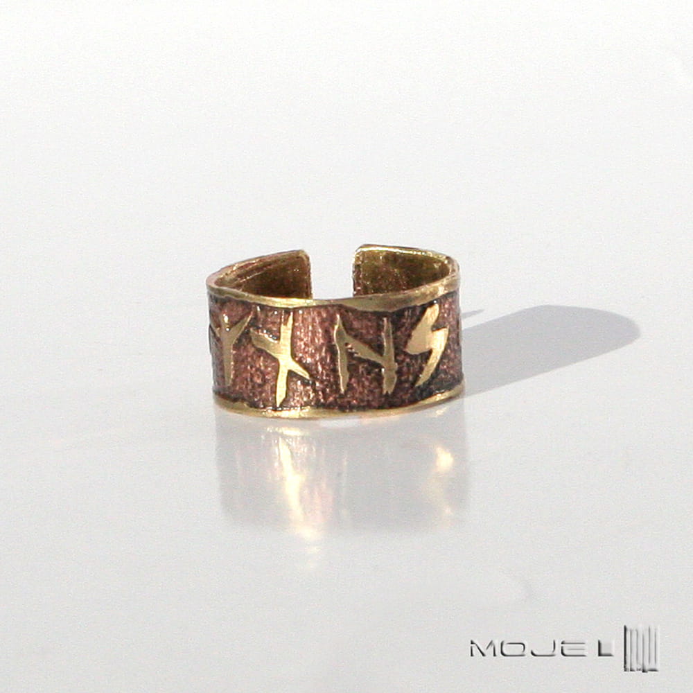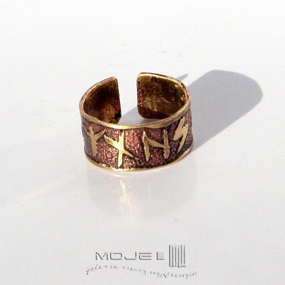 Mosiężna obrączka unisex. Jest ozdobiona wytrawionymi w metalu runami, które składają się na amulet chroniący ode zła. Sposób wykonania sprawia, że jest surowa, rustykalna, nieco etniczna. Jest delikatnie patynowana dla wydobycia wzorów.