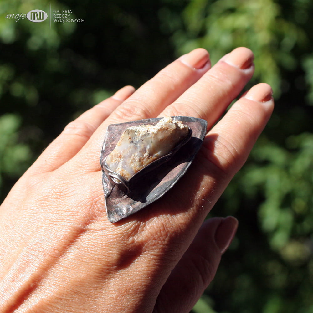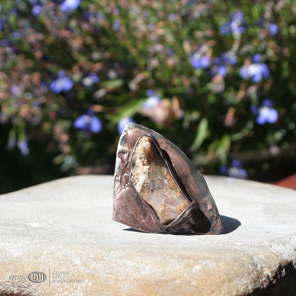 Pierścionek z surową bryłą opalu. Naturalne kolory ciepłego beżu, złamanej bieli oraz miedzi sprawiają, że zimny kamień staje się bardziej przyjazny i "miękki"...