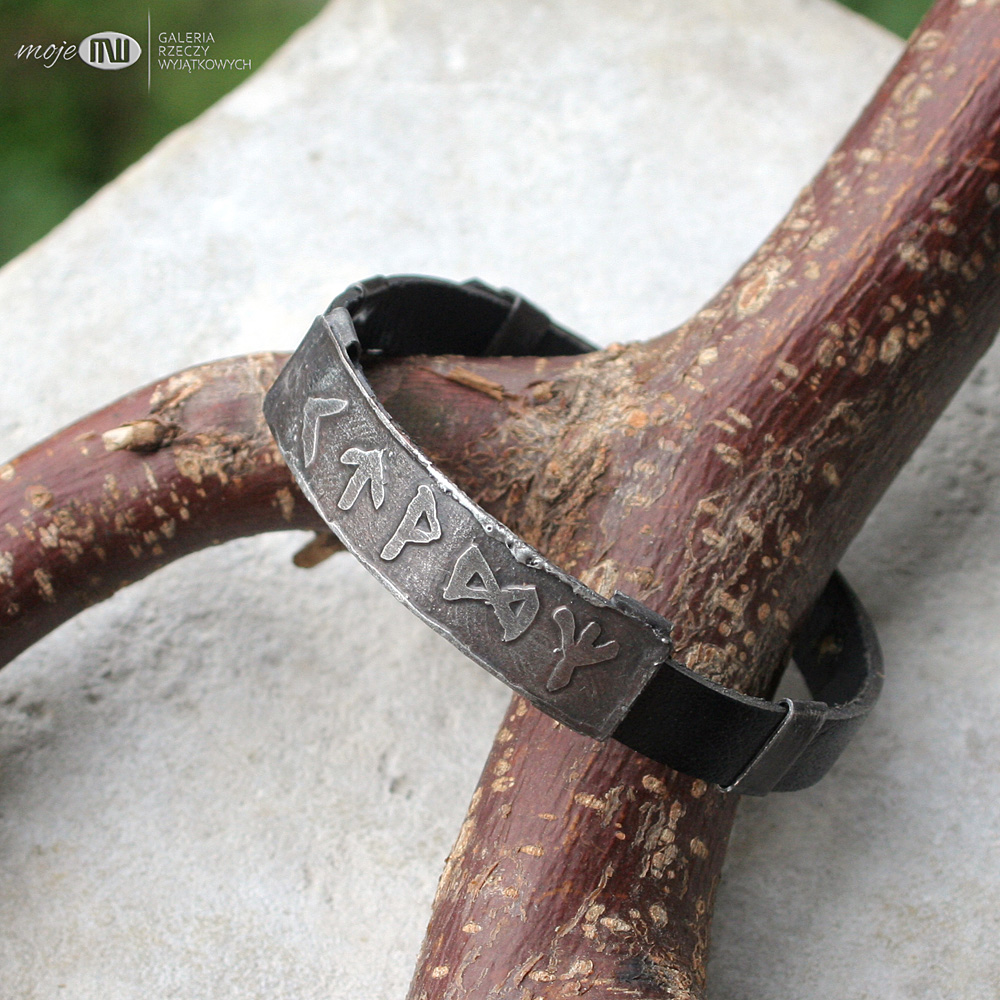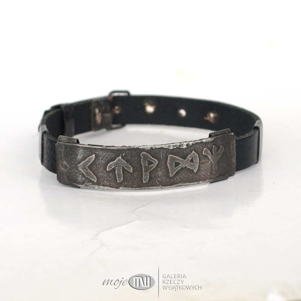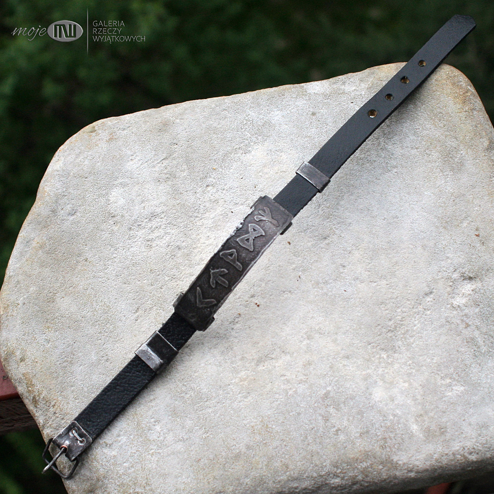 Energetyczna runiczna bransoleta. Zrobiłam ją z miedzi pokrytej cyną oraz czarnego, płaskiego, skórzanego rzemienia o szerokości 10 mm. Znaki runiczne, odpowiednio zestawione, tworzą amulety wspomagające różne aspekty życia. Te mają pomóc w otwarciu się na drogę mającą zaprowadzić do szczęścia.