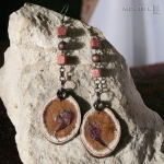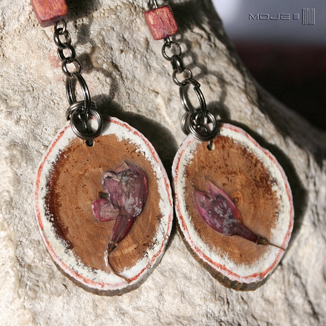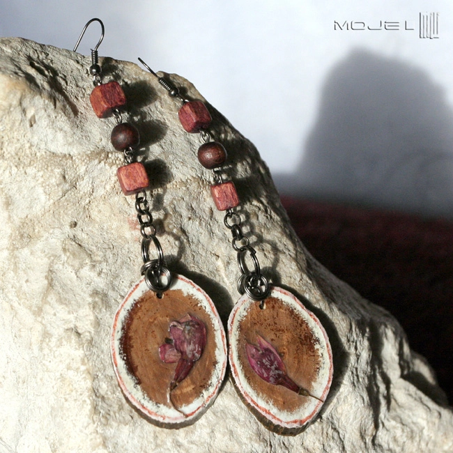 Kolczyki z drewnianego jesionowego plastra i suszonych kwiatów fuksji oraz drobnych drewnianych koralików. Zabezpieczone bezbarwnym lakierem.