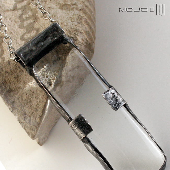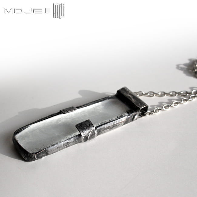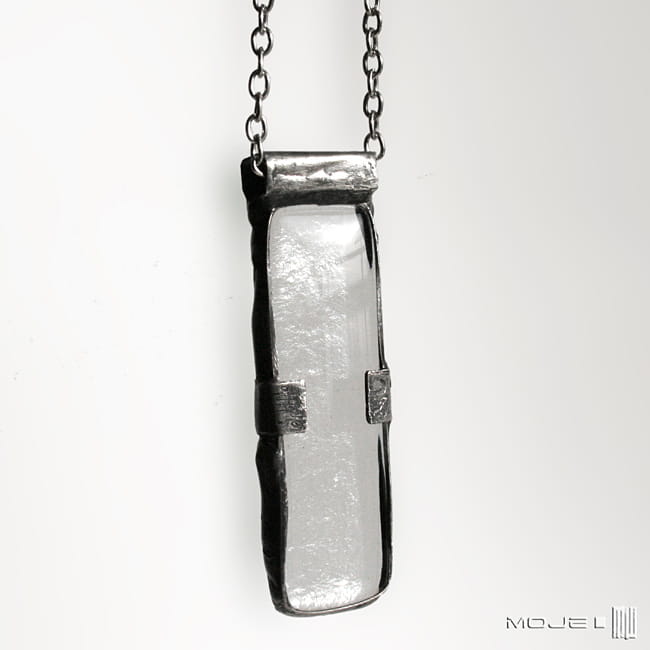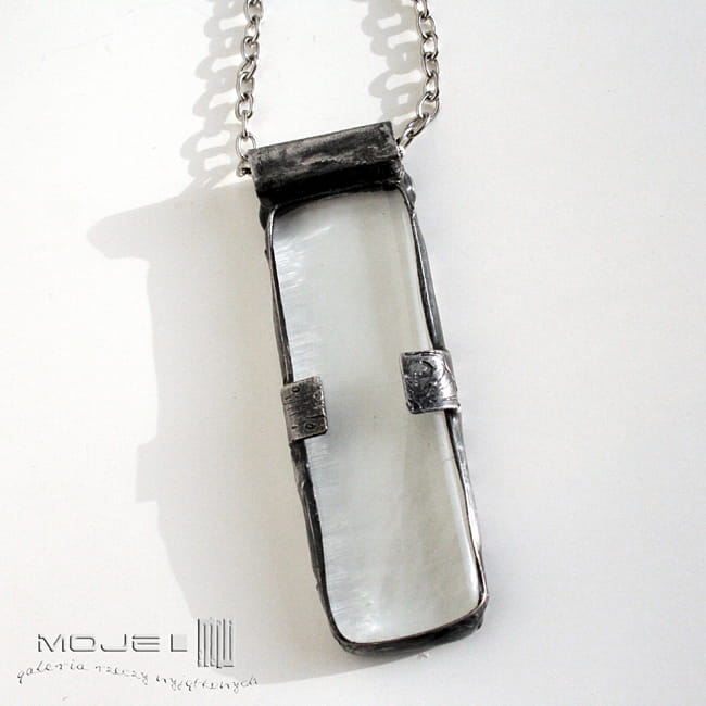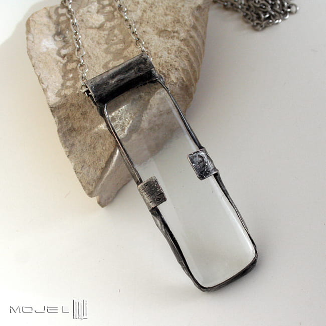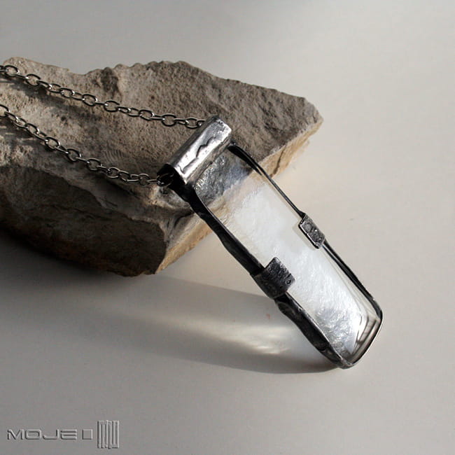 Duży wisior z bezbarwnego szkła, wytopiony przeze mnie metodą fusingu. Oprawiony jest w miedź - cynowaną, patynowaną i przecieraną. Zawieszony na metalowym łańcuszku w kolorze srebrnym.