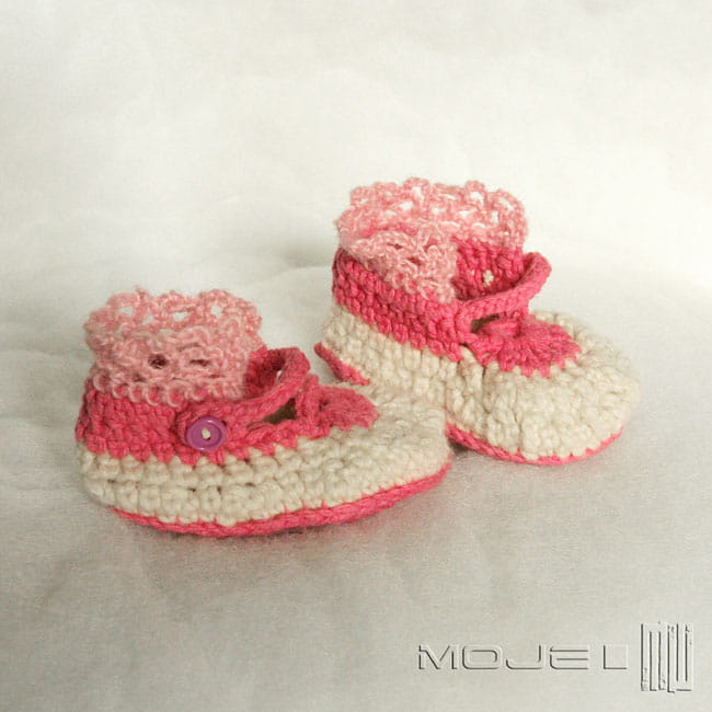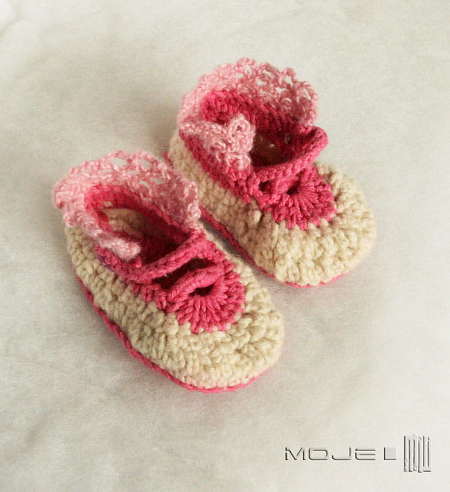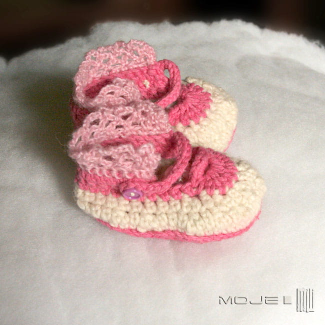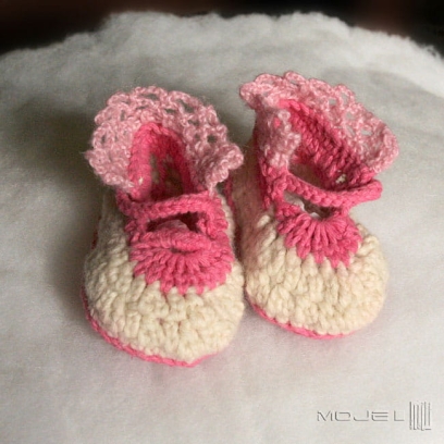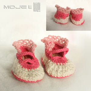 Wydziergane z włóczki ecru (wełna), oraz dwóch odcieni różu. Mają sprawić, żeby stópki Twojego maleństwa były ciepłe, nawet gdy za oknem mróz.