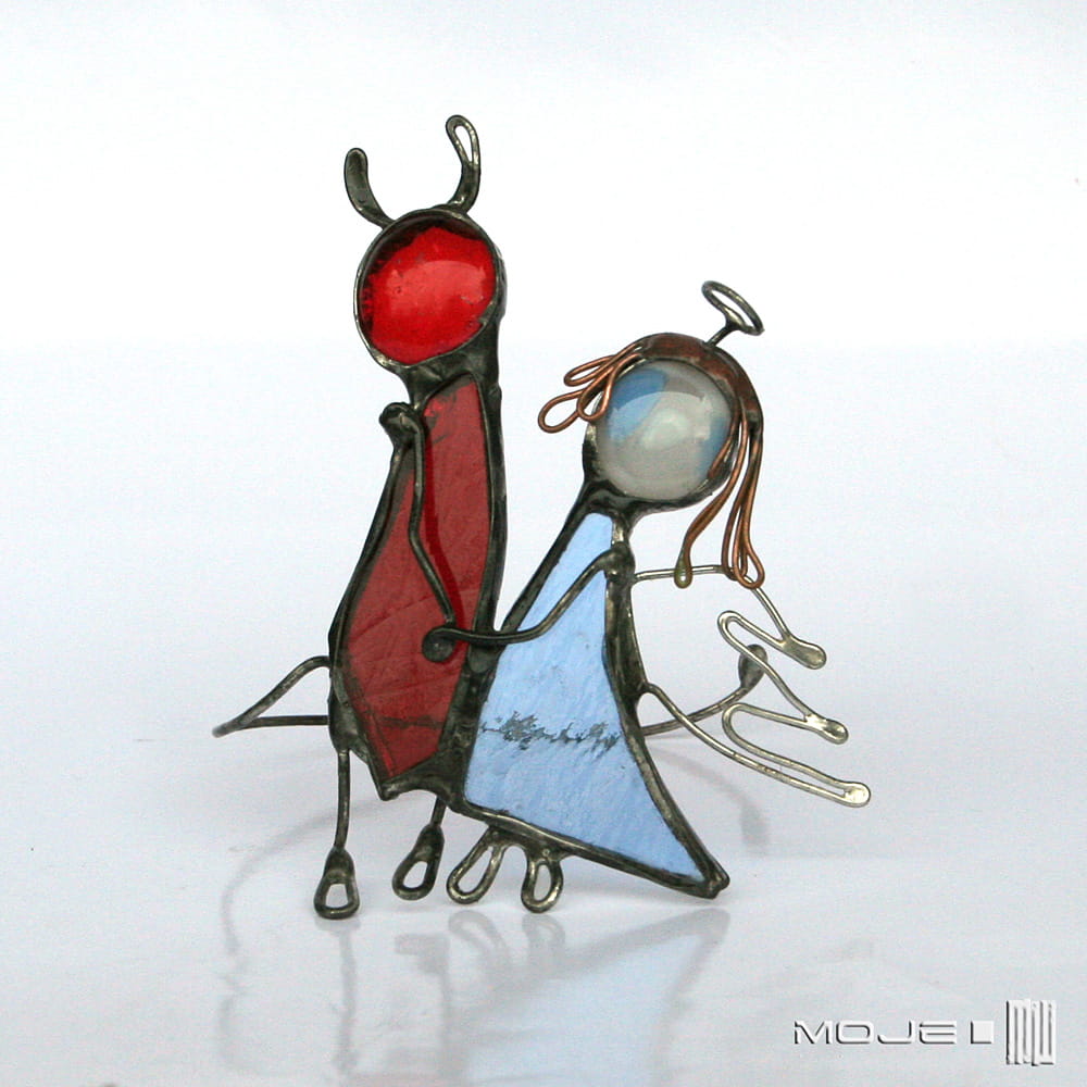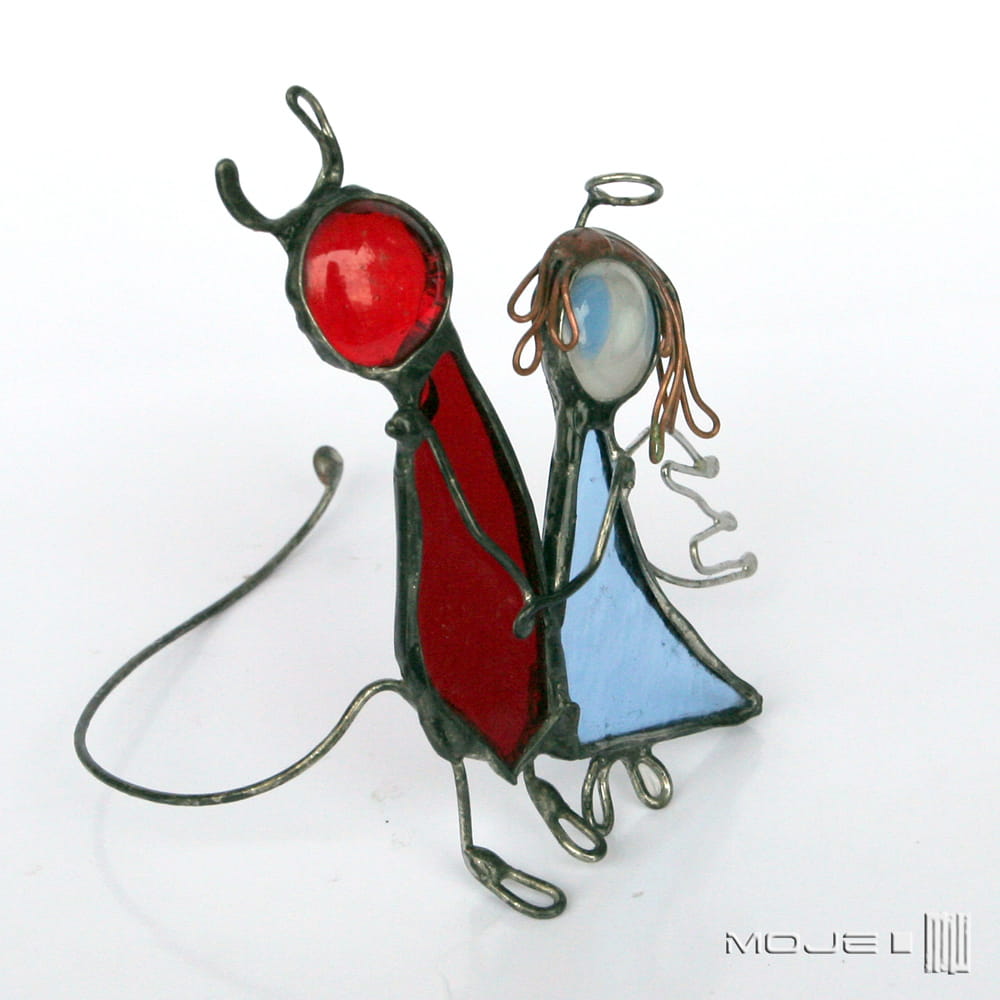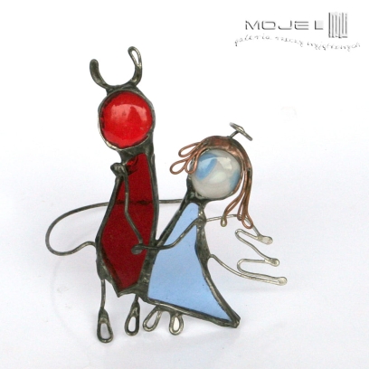 Zrobiłam ich z czerwonego i błękitnego szkła witrażowego, oprawieni i wykończeni są miedzią - cynowaną, patynowaną i przecieraną.