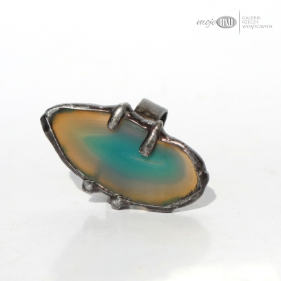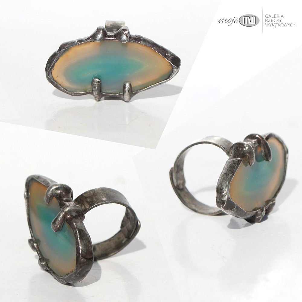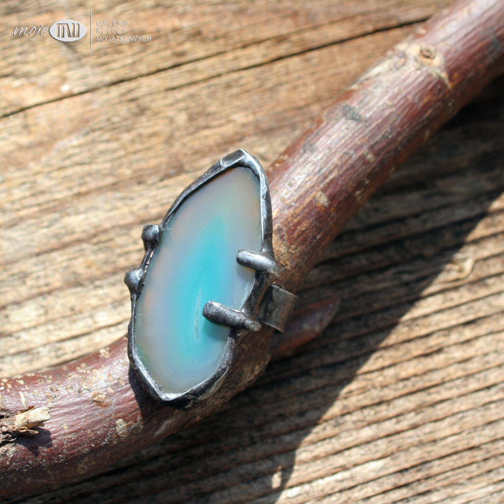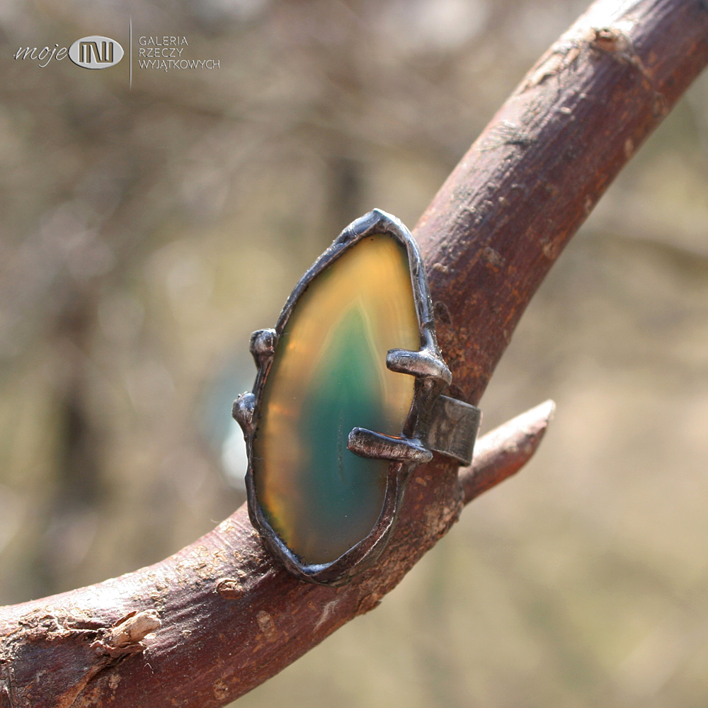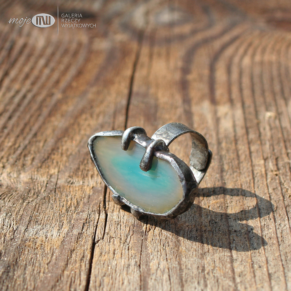 Pierścionek z plastra agatu. Oprawiłam go prosto w miedź pokrytą cyną tak, aby pokazać sam kamień. Gdy jest na palcu, to widać głównie kolor miętowy, pod światło wpada w ciepłe miodowe nuty. Cyna jest patynowana na kolor starego srebra.