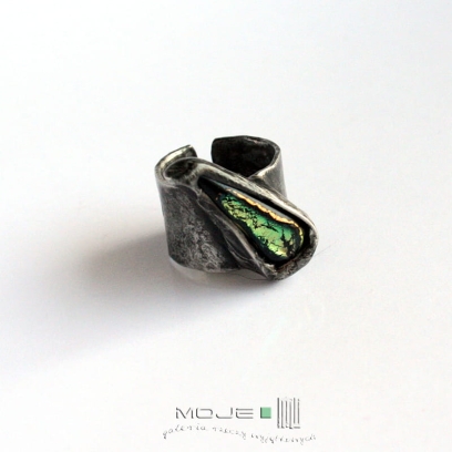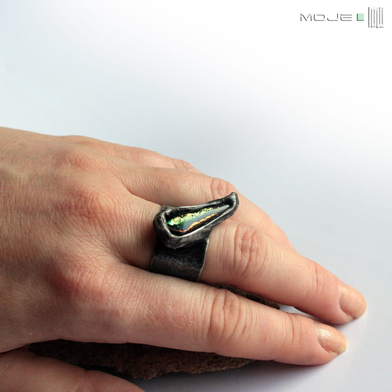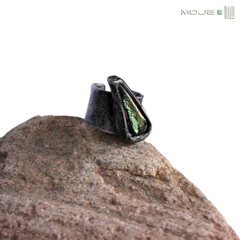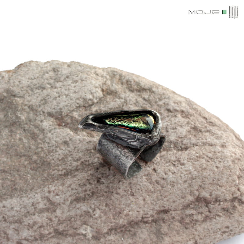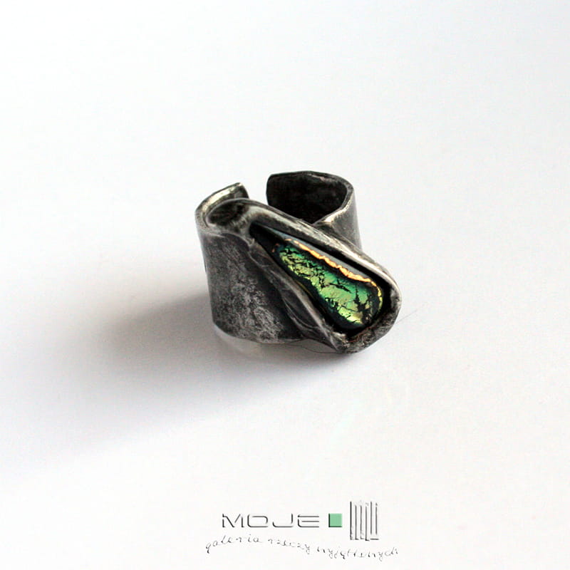 W świetle szkło delikatnie opalizuje, co dodaje mu atrakcyjności. Obrączka wykonana jest z miedzi - cynowanej, patynowanej, przecieranej i drapanej.